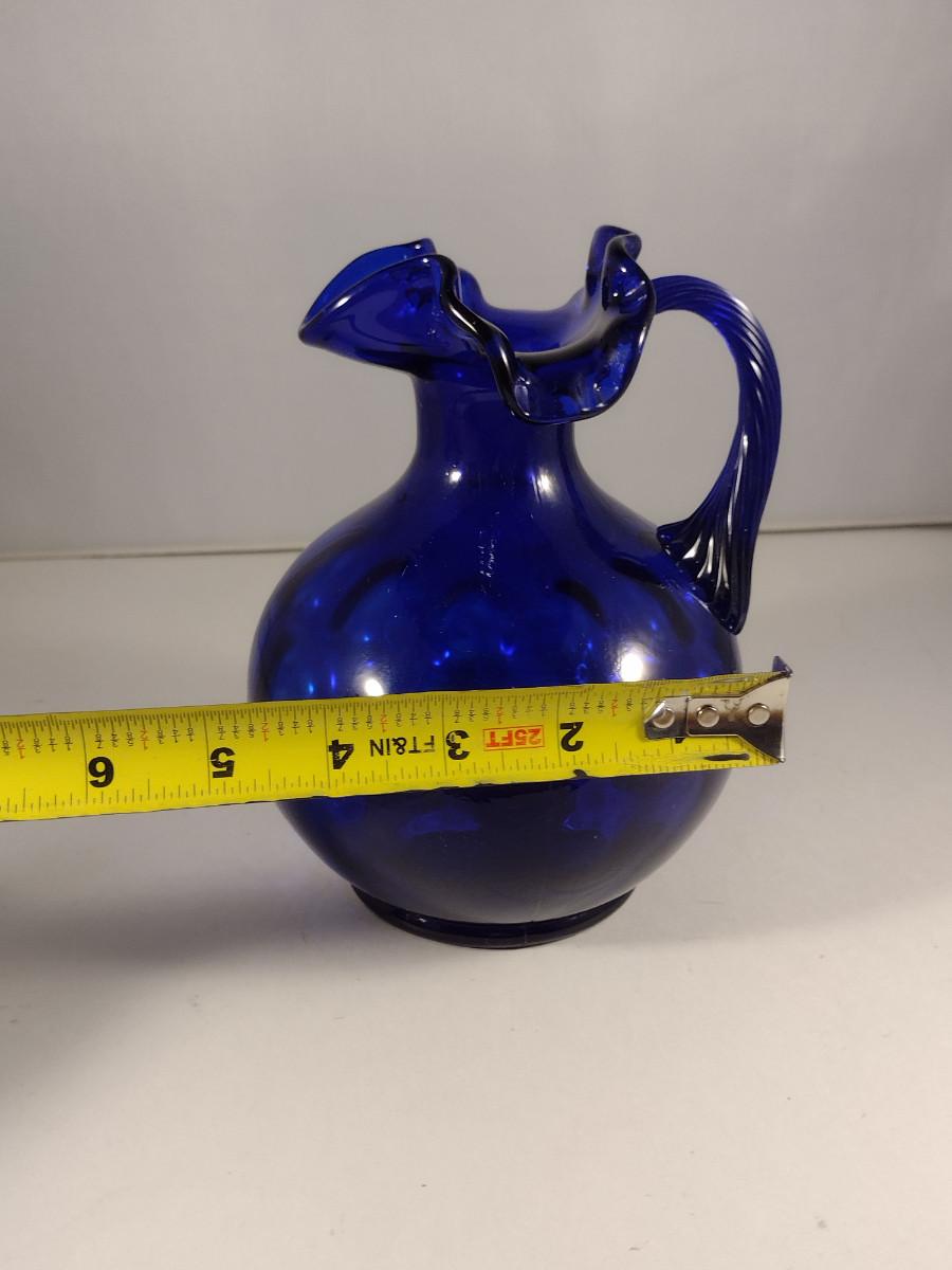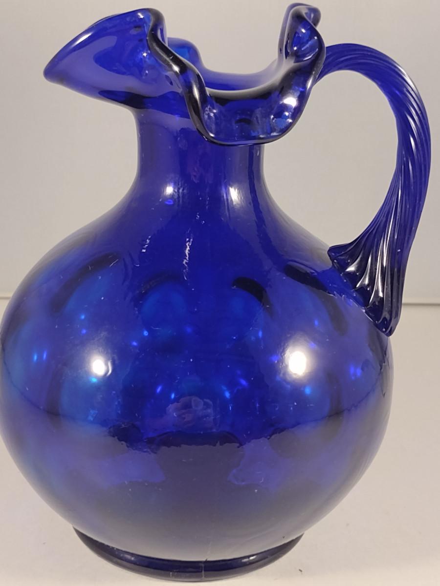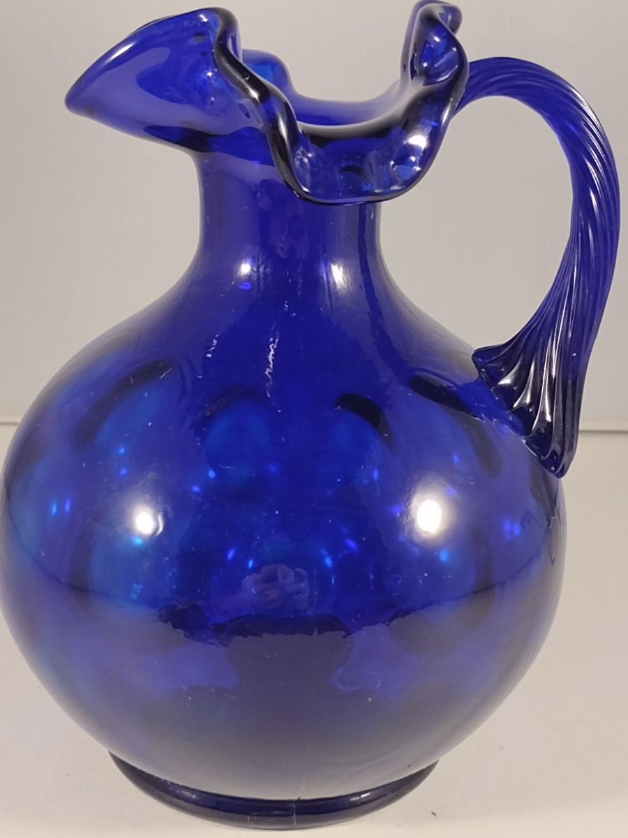Fenton Cobalt Blue Art Glass Coin Dot Pitcher with Ruffled Top