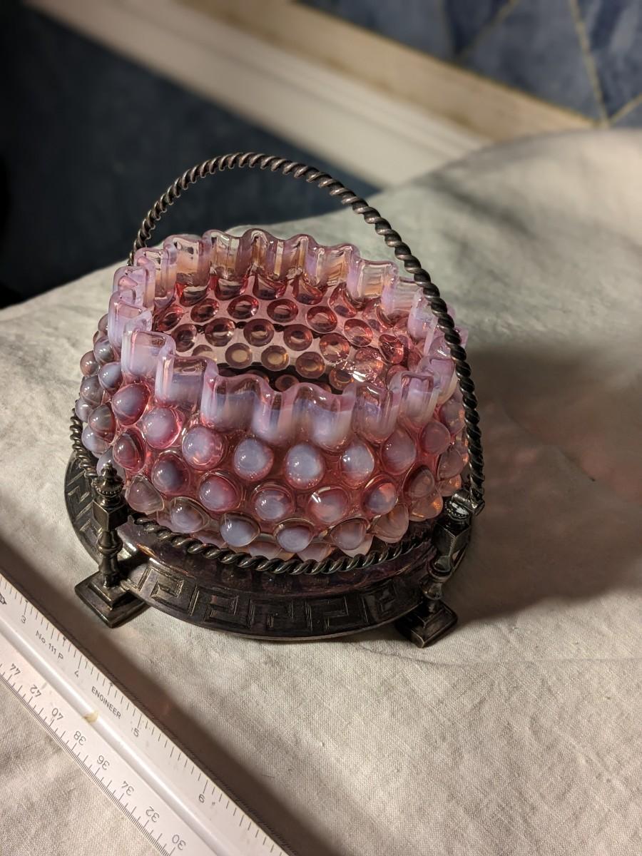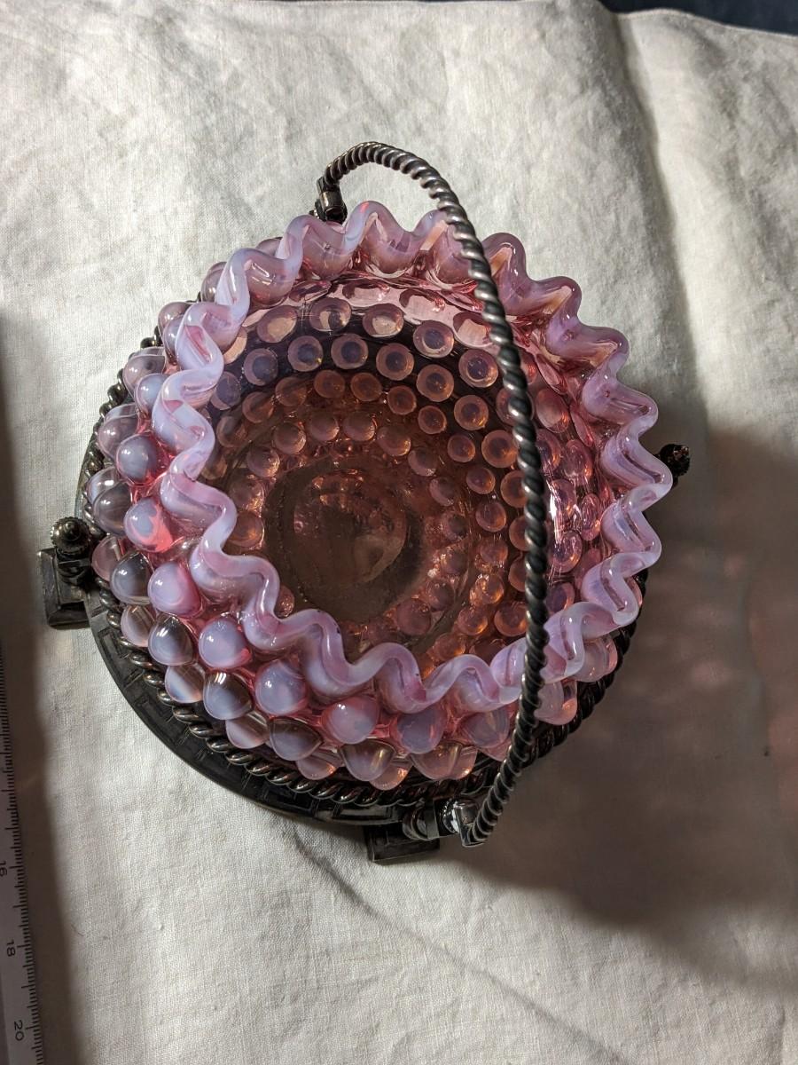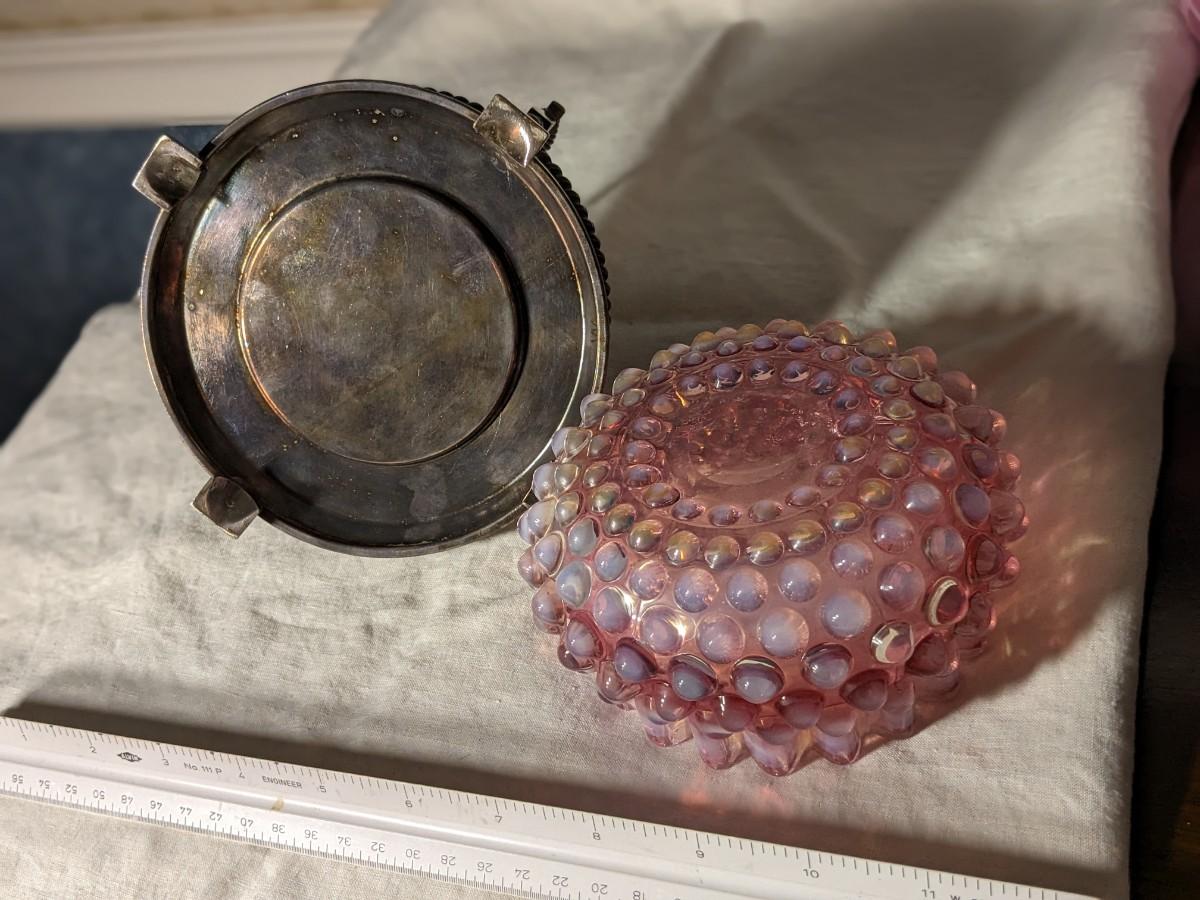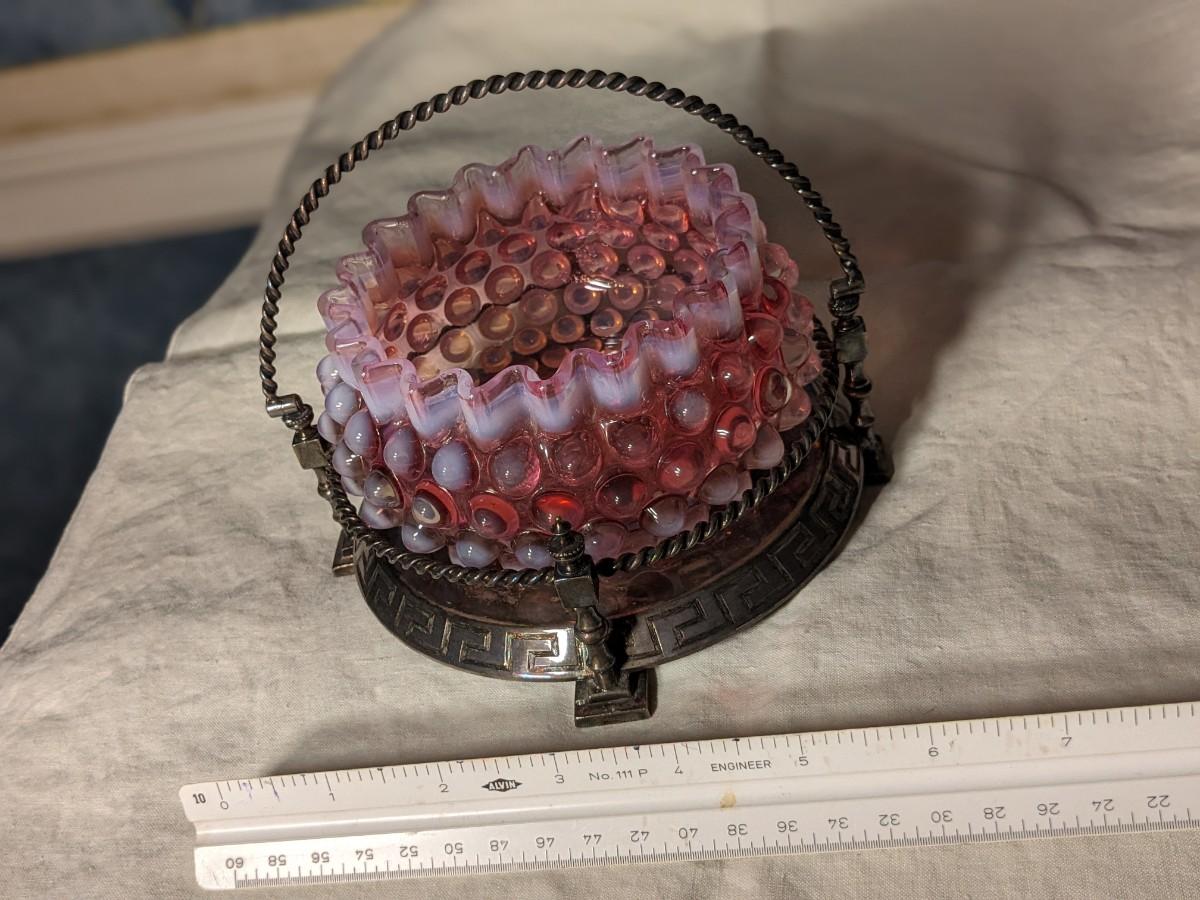 Fenton Cranberry Hobnail Finger Bowl within Silver Basket Tray