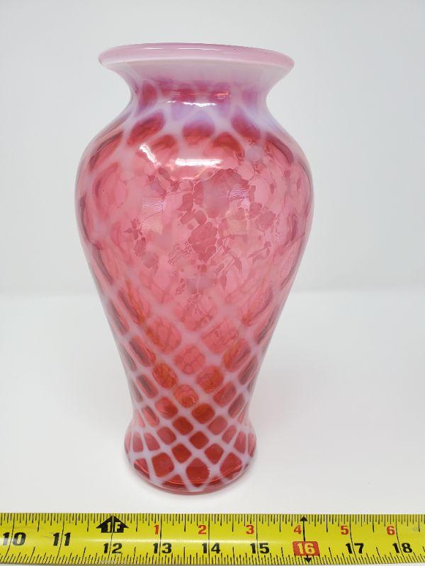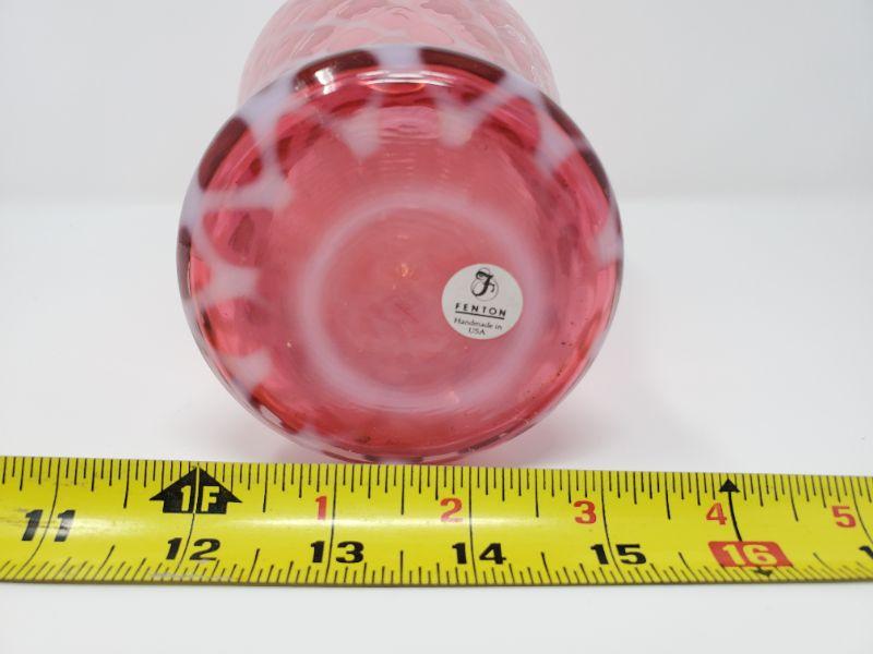 This beautiful cranberry opalescent Fenton vase is signed on front, sticker attached to bottom of vase. Good condition, does have a white line on inside of vase in 2 spots near the base, no cracks, chips or other flaws noted.