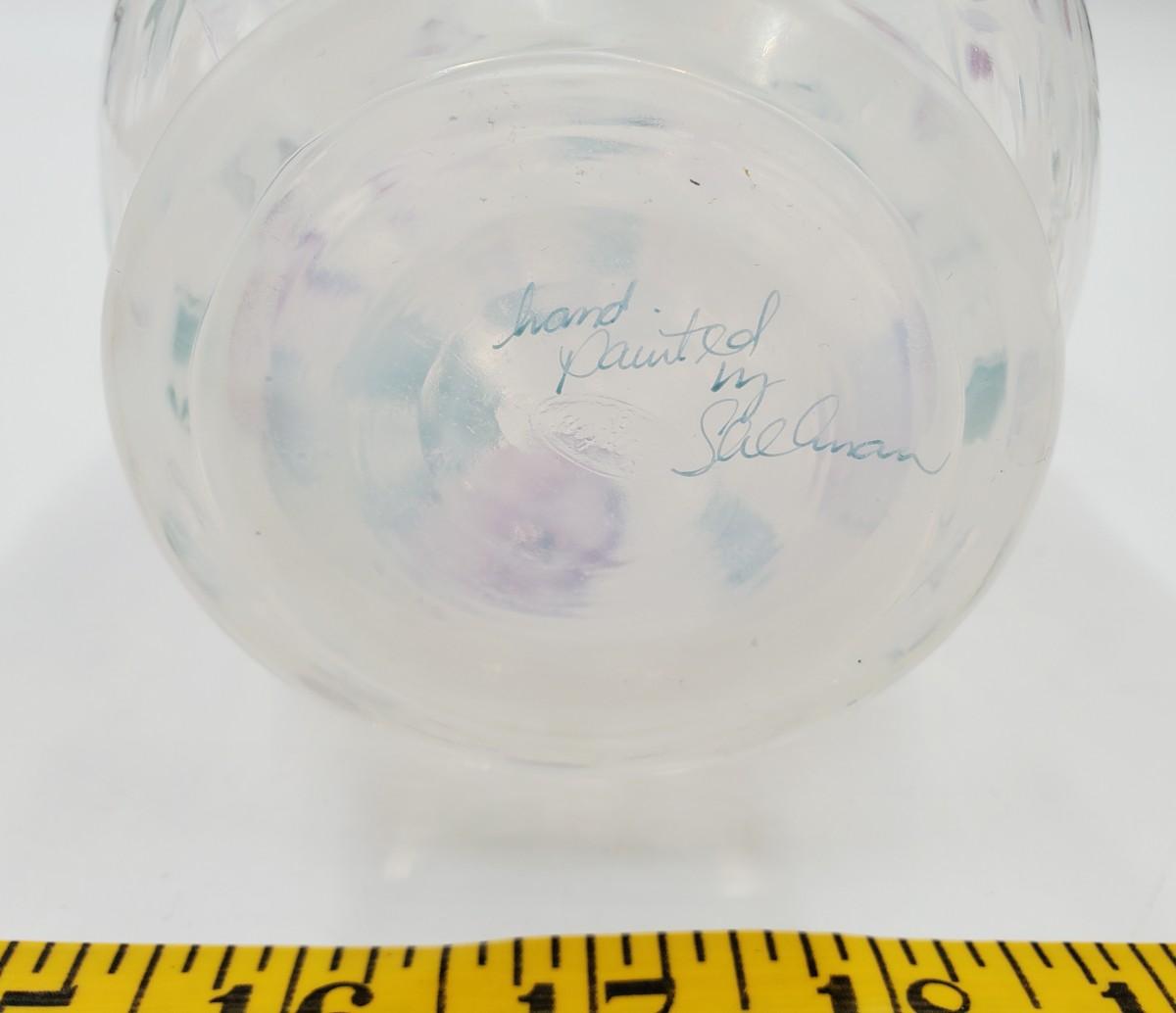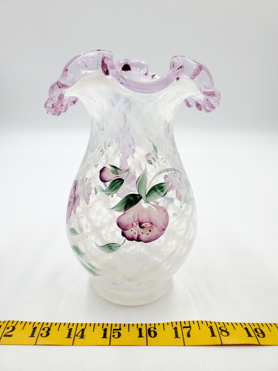 Adorable pink crest Fenton hand painted flowers on diamond optic background, signed and in very good condition.