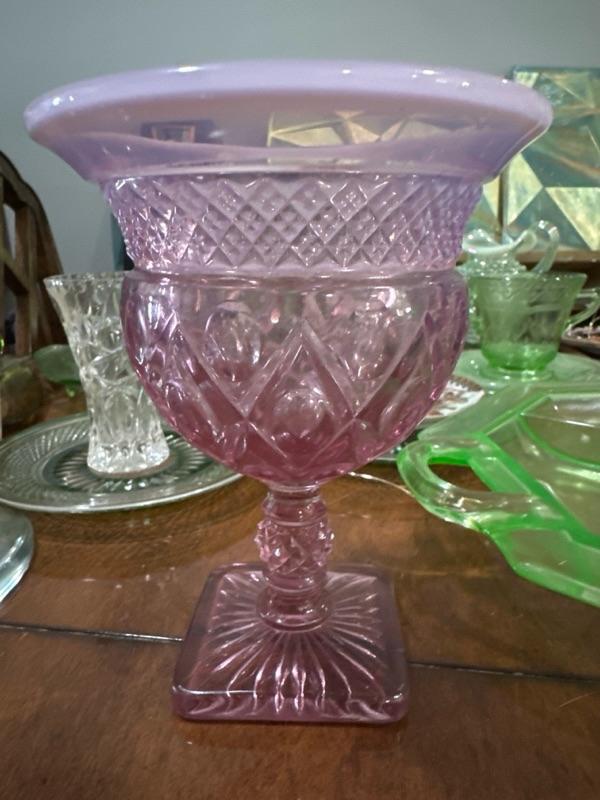 Still seeking to identify the pattern on this late mid century vintage, Fenton rose glass compote this piece stands about 7 inches high and nearly 5 inches across it is very sturdy with a strong detailed rose colored base.