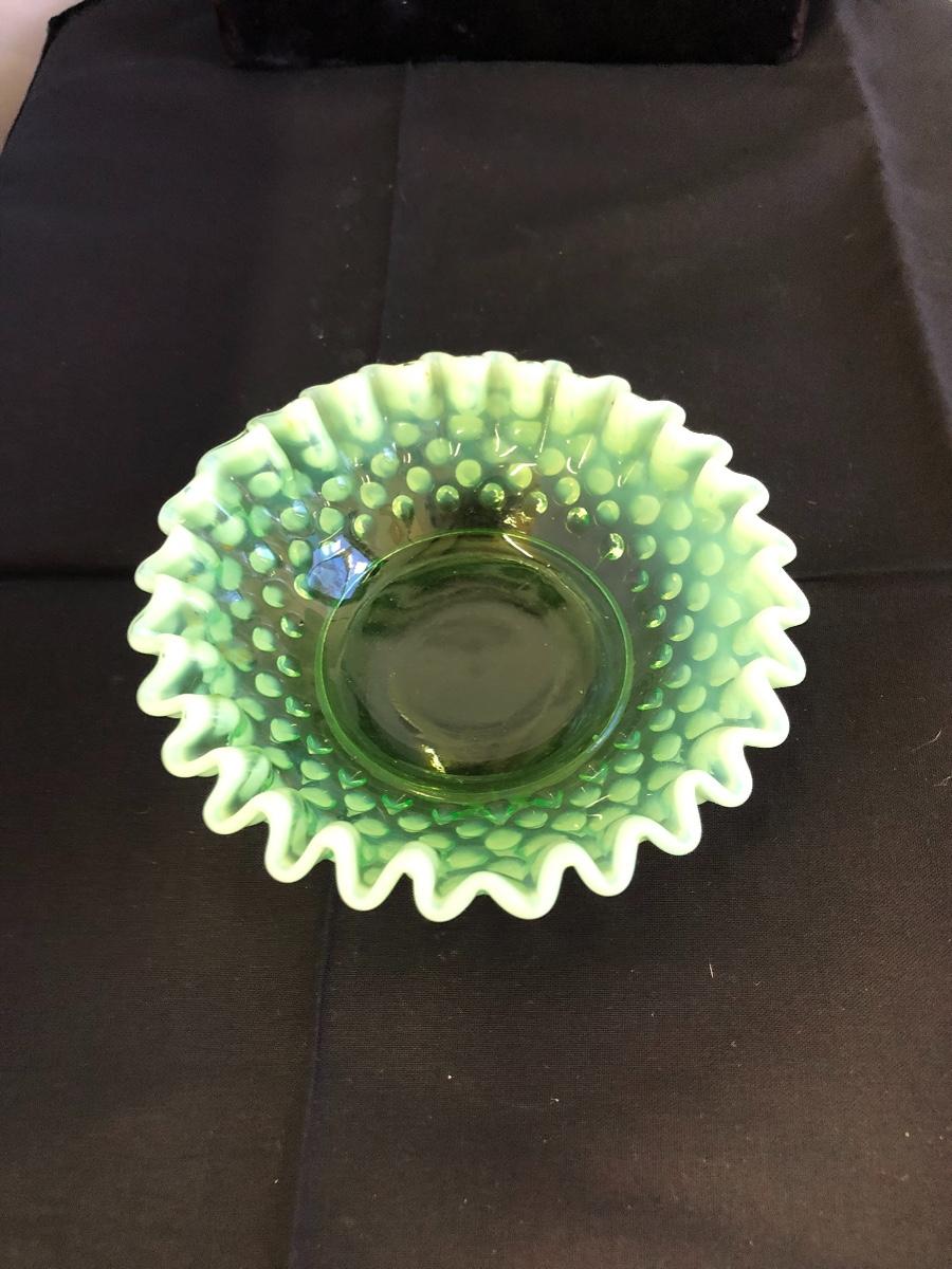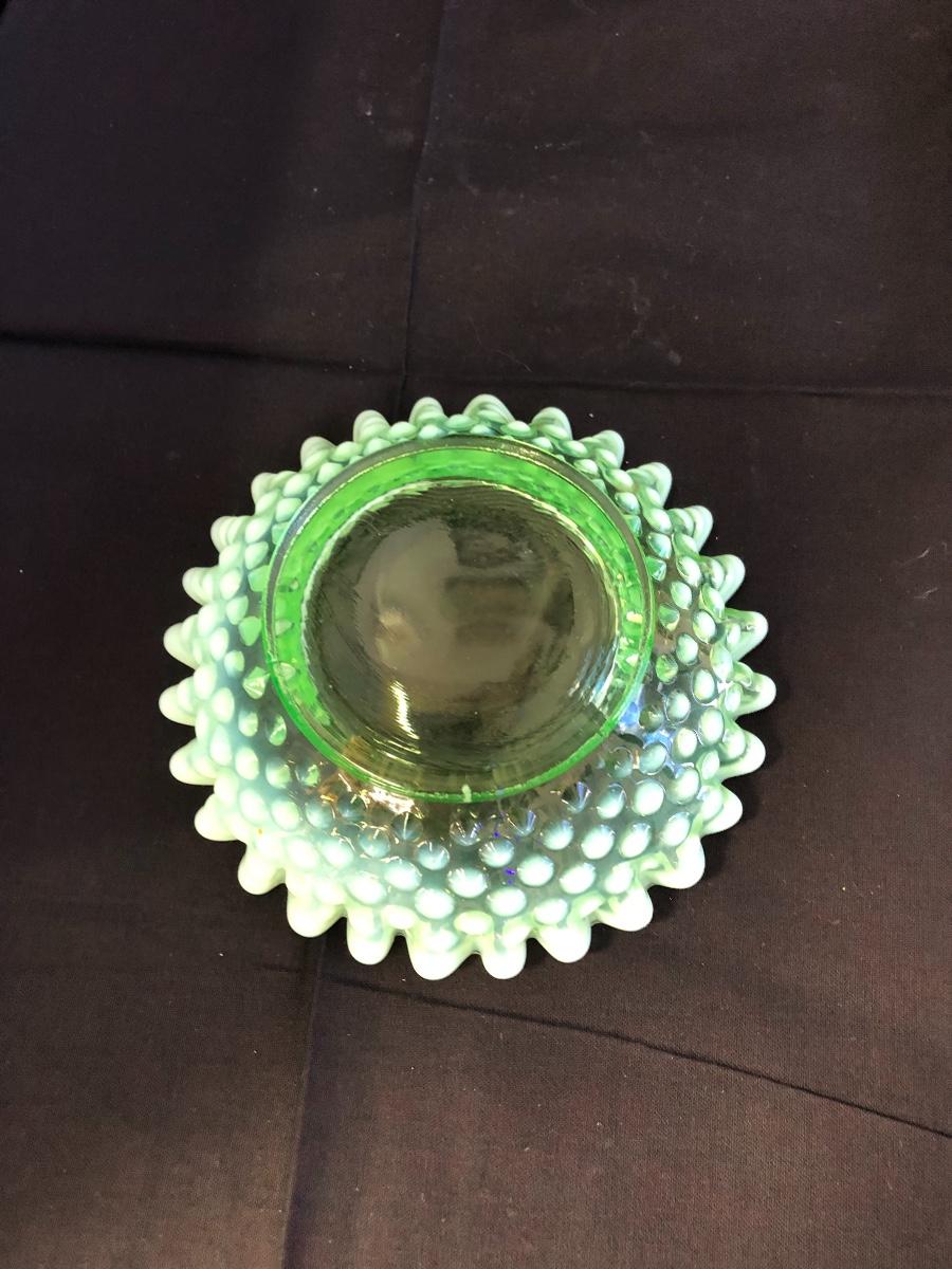 This is a fabulous opalescent piece that glows under black light. Traditional hobnail pattern and measures 5” across