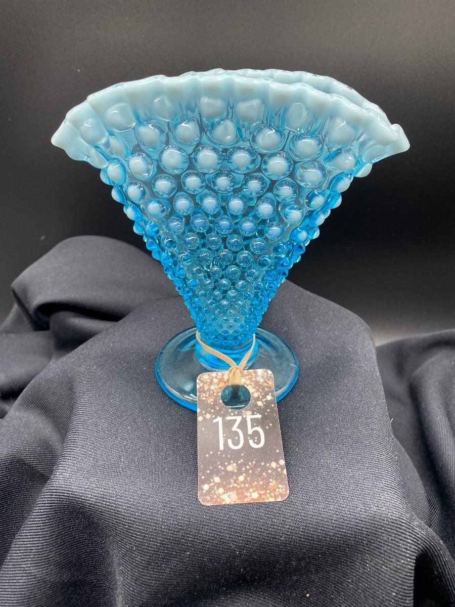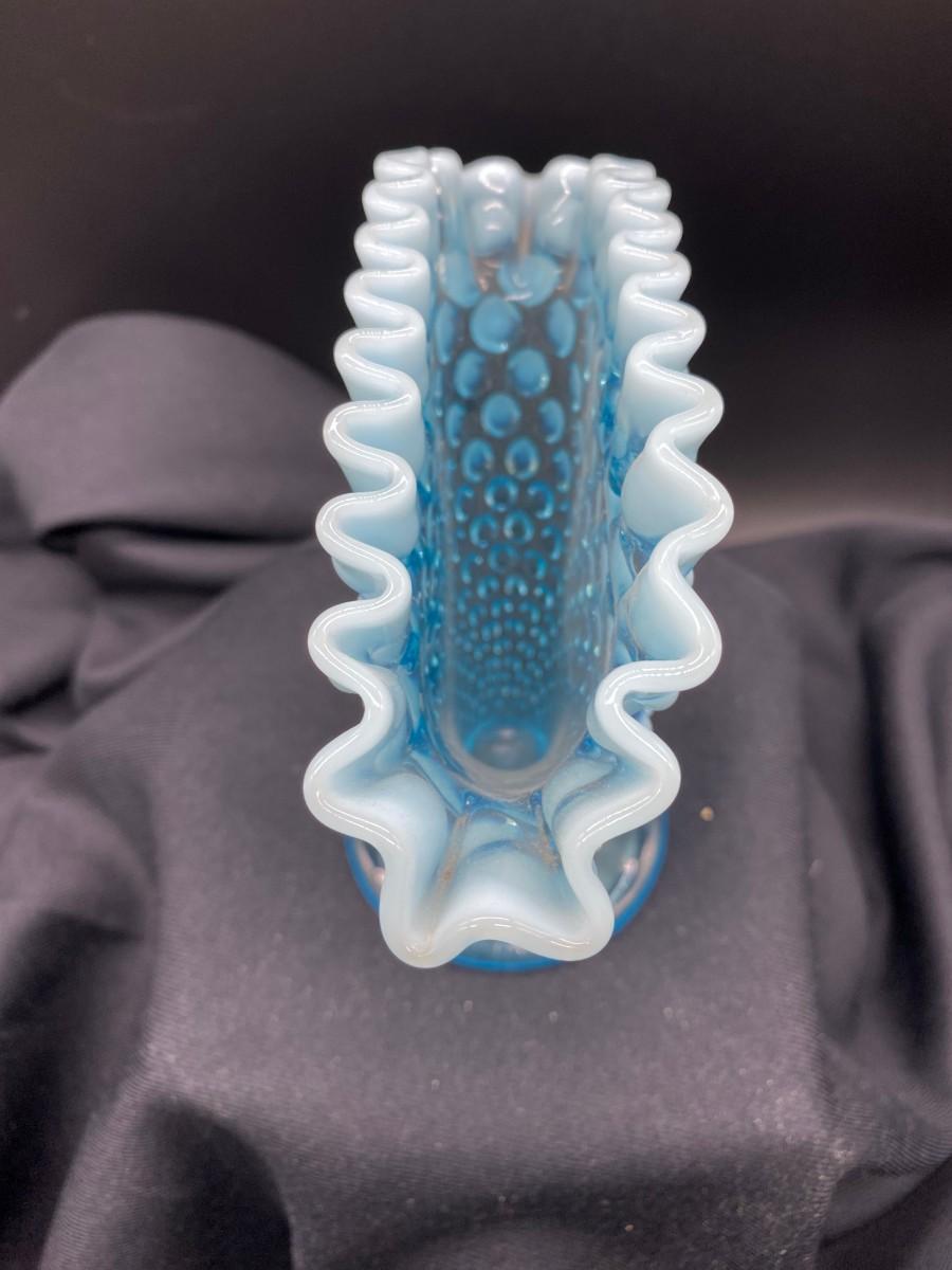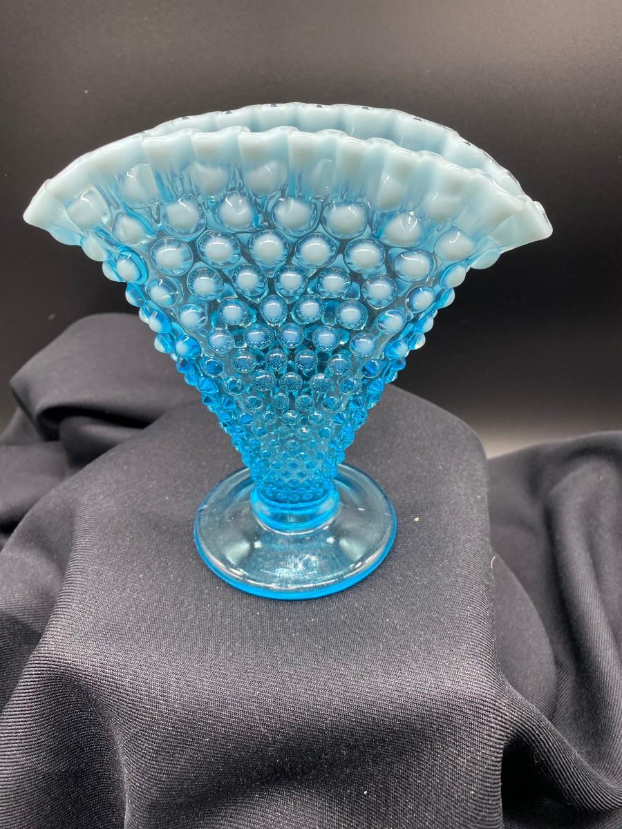 Fenton glass aqua blue hobnail fan vase