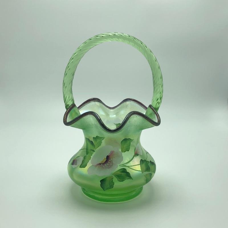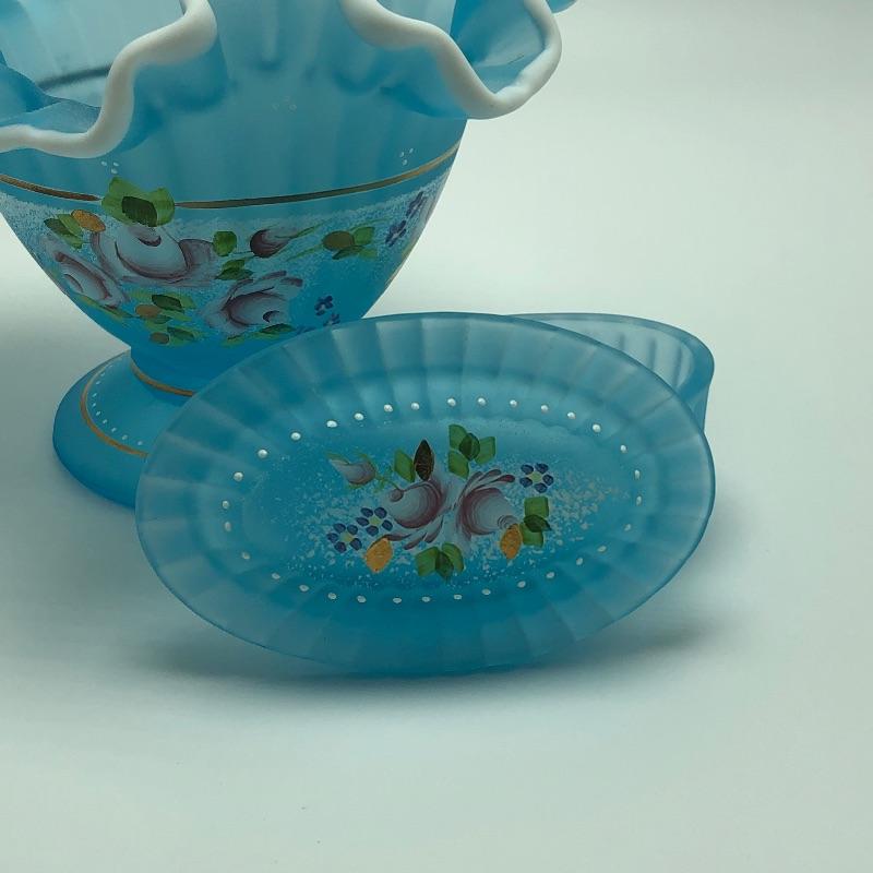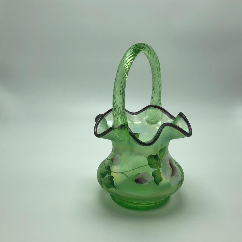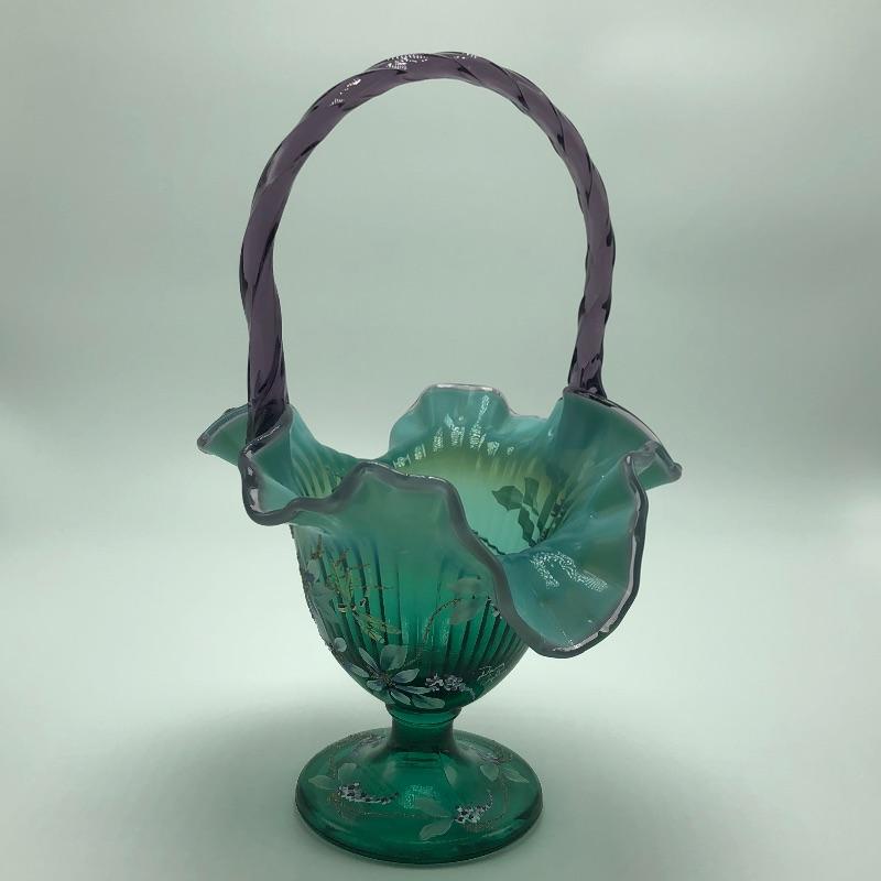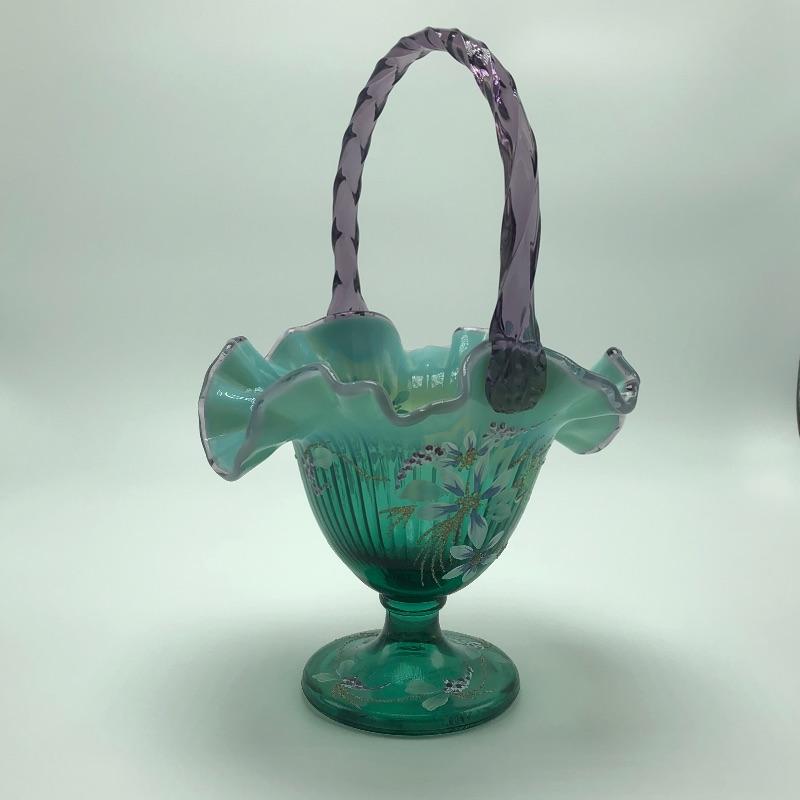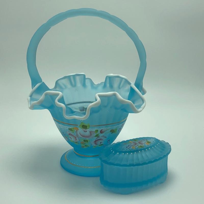Beautiful assortment of Fenton hand painted glass baskets and a small oval dish with removable hand painted cover. Please note that no Fenton name or symbol was located on the oval dish.