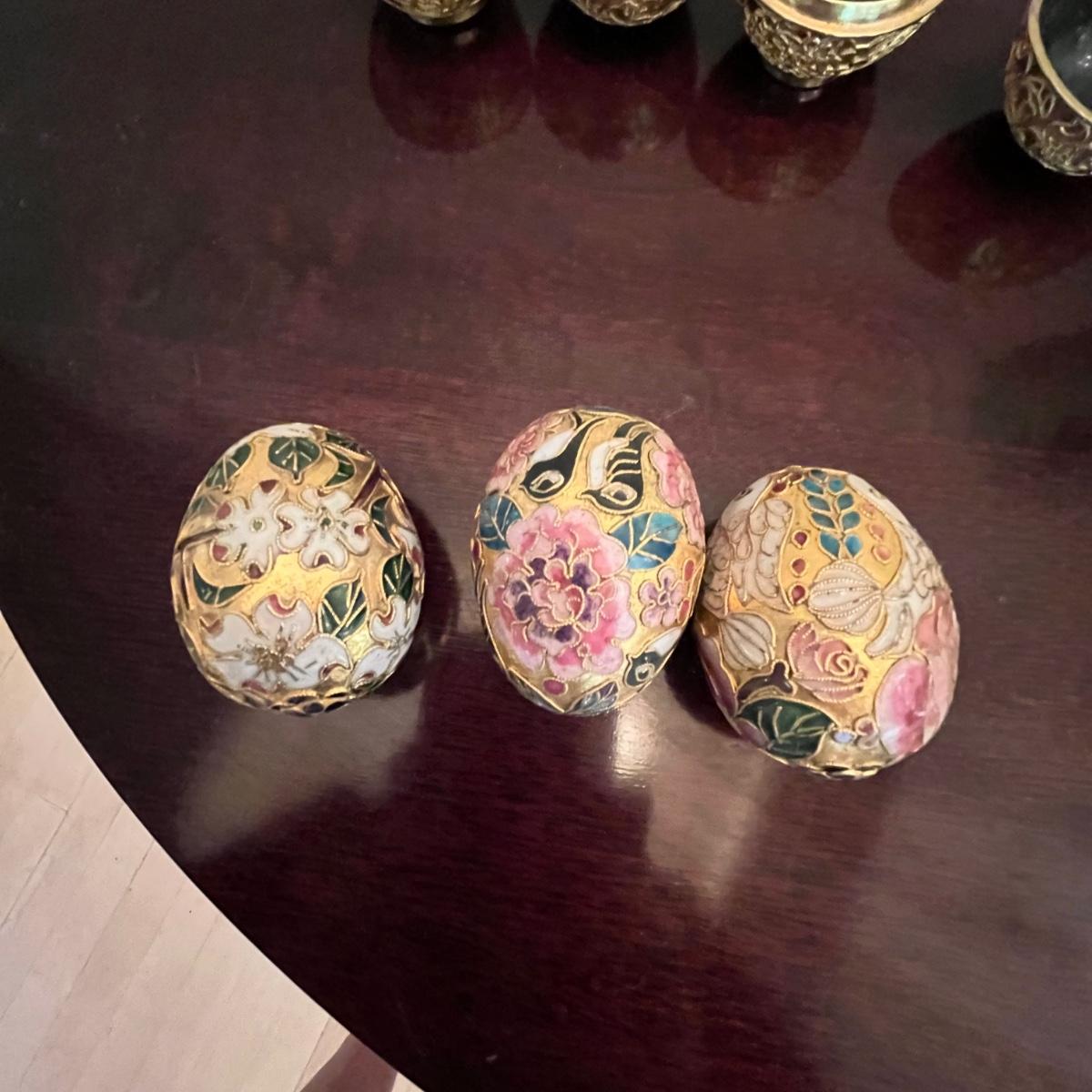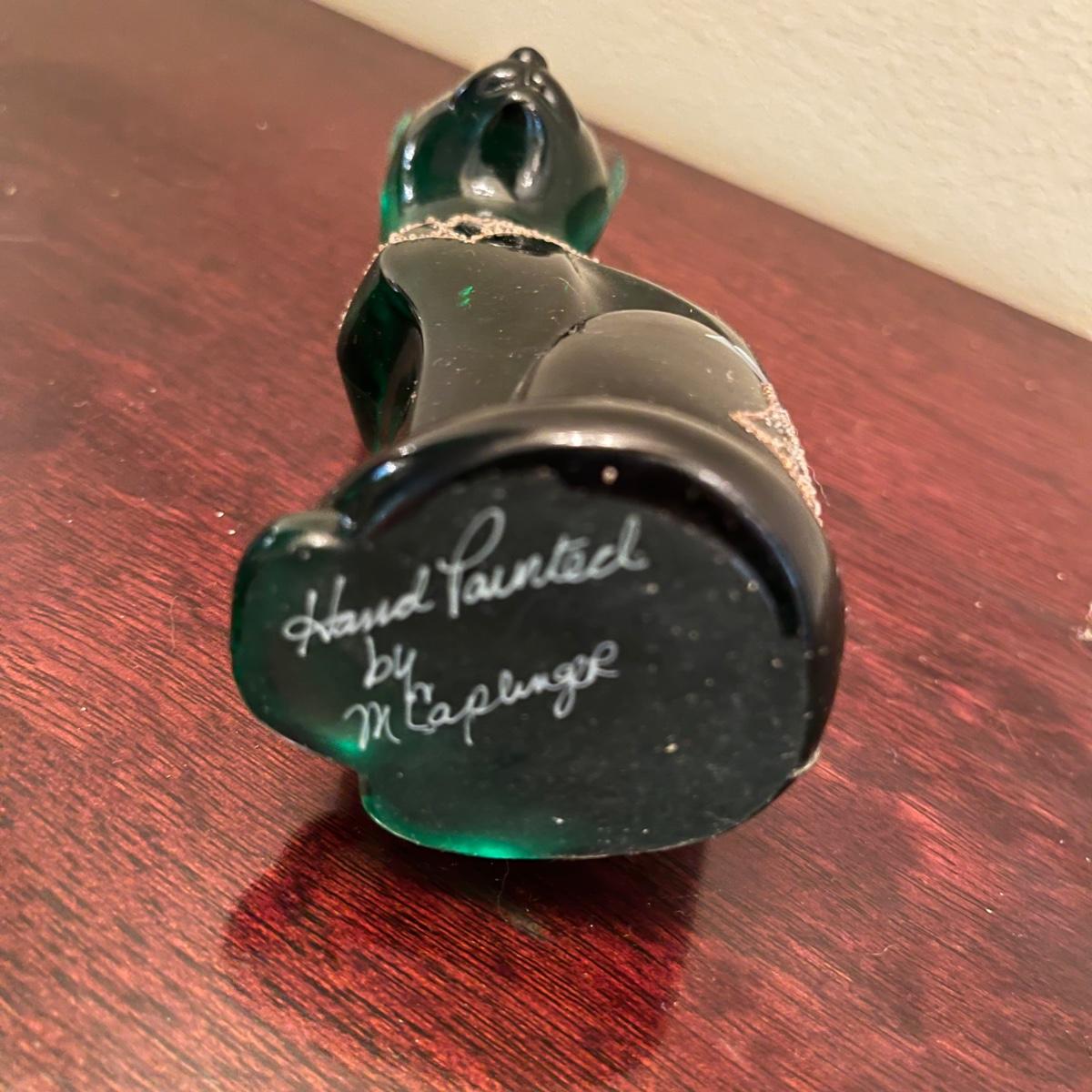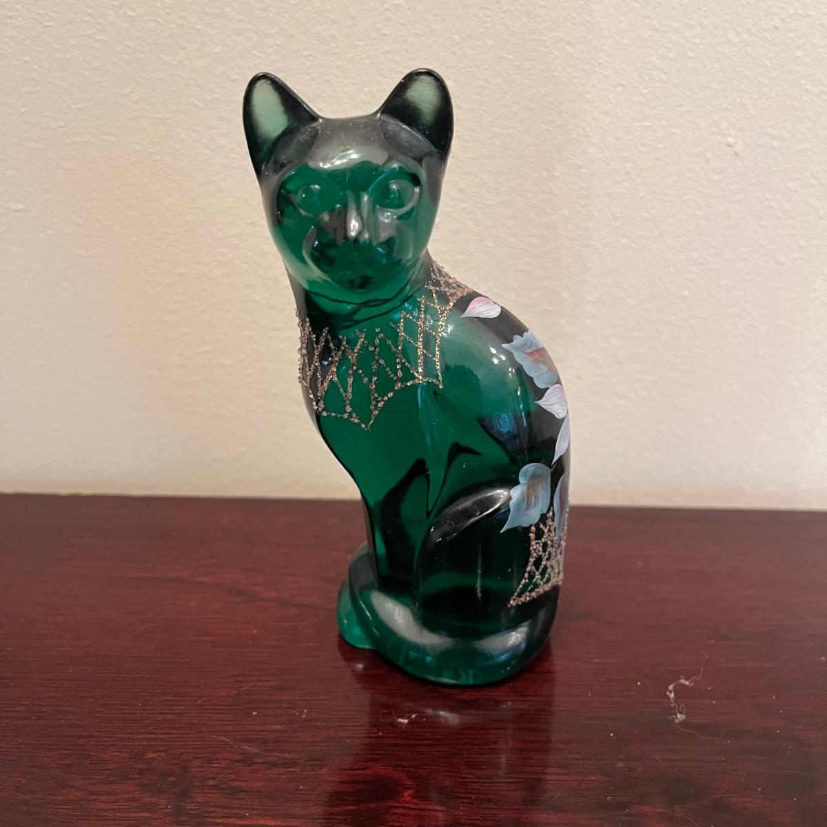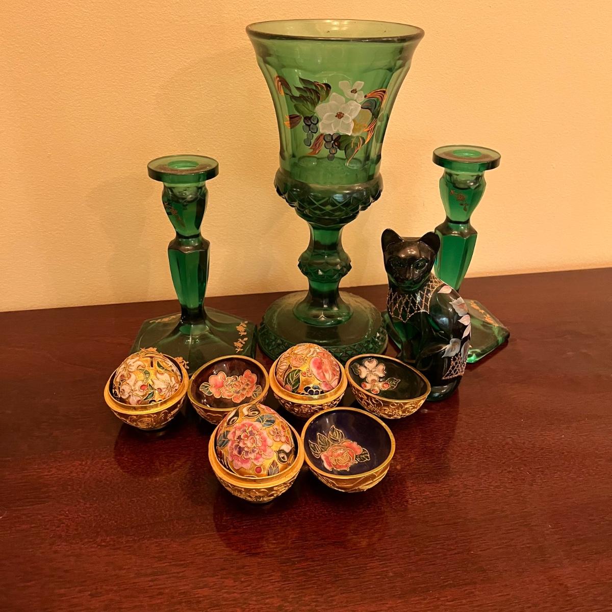 Lot includes a hand painted Fenton cat, hand painted footed Fenton jar, two painted glass candlesticks and three gold colored metal egg holders with colorful eggs inside. Fenton cat measures 4.5”D x 9.5” tall.