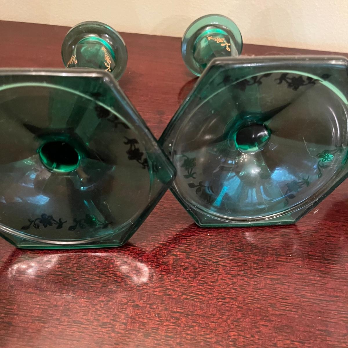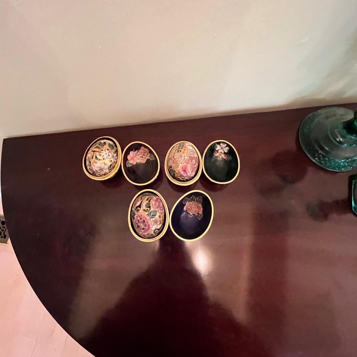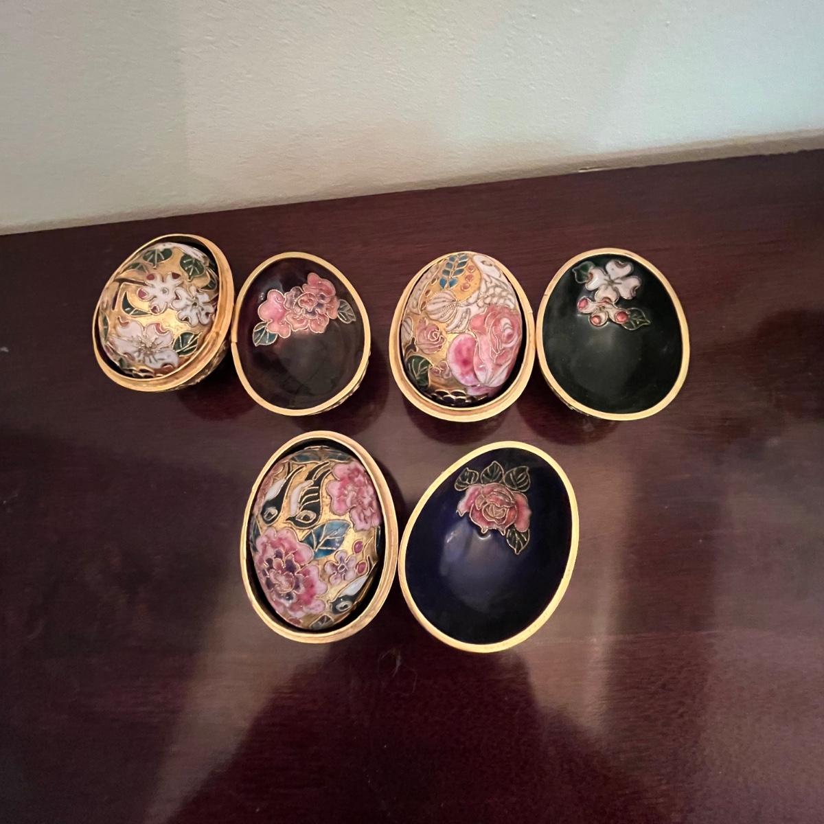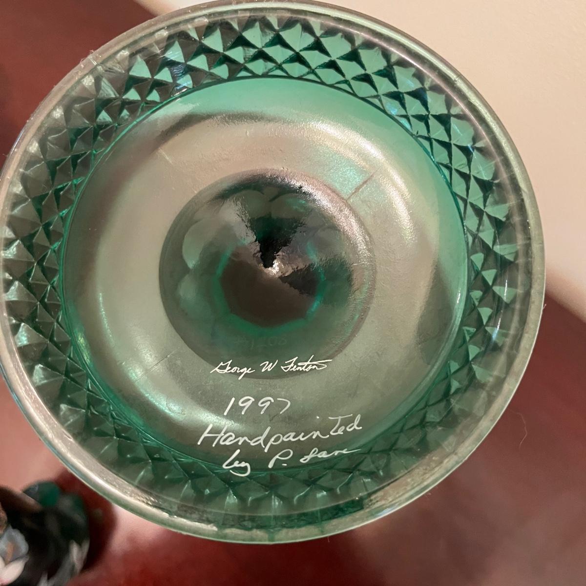 Lot includes a hand painted Fenton cat, hand painted footed Fenton jar, two painted glass candlesticks and three gold colored metal egg holders with colorful eggs inside. Fenton cat measures 4.5”D x 9.5” tall.