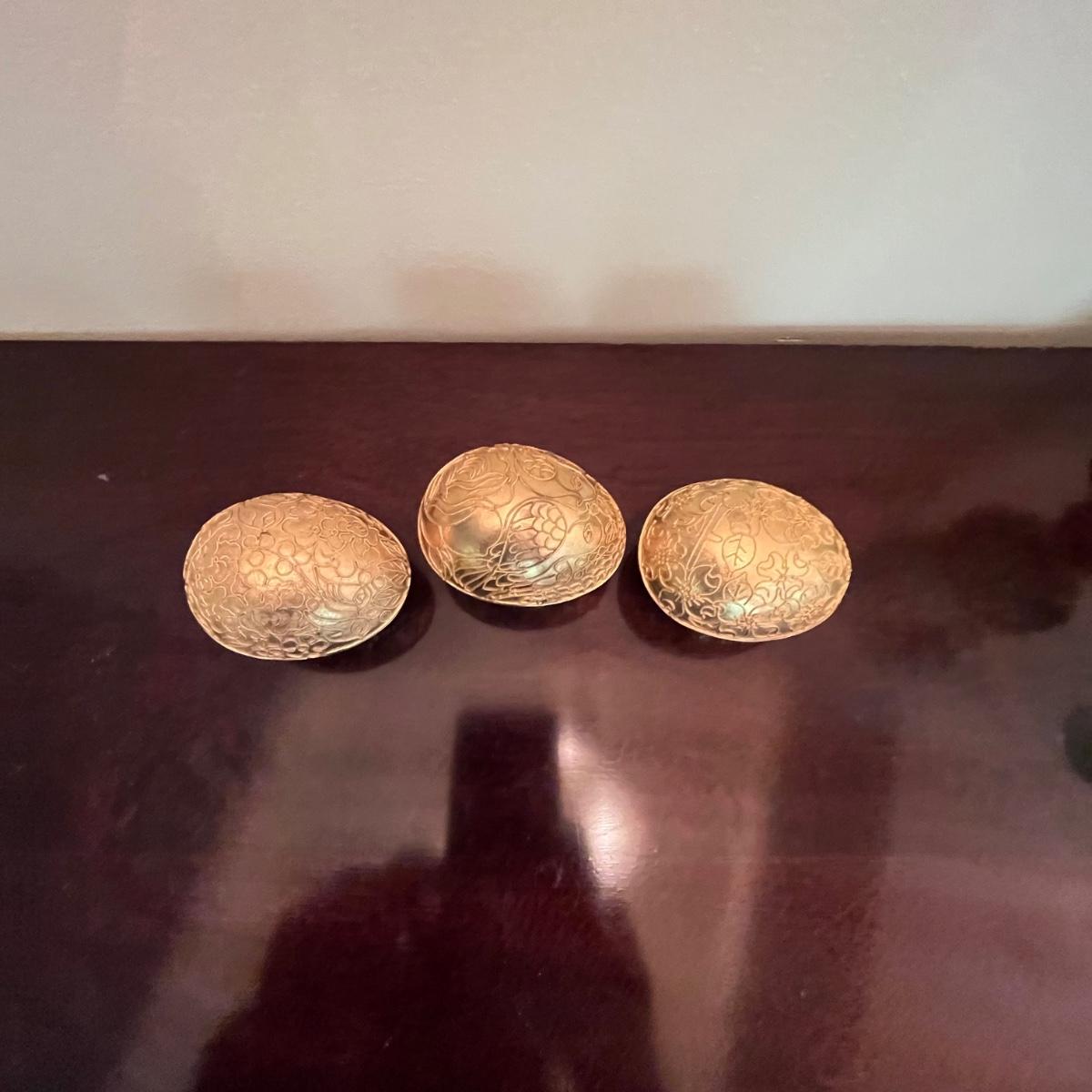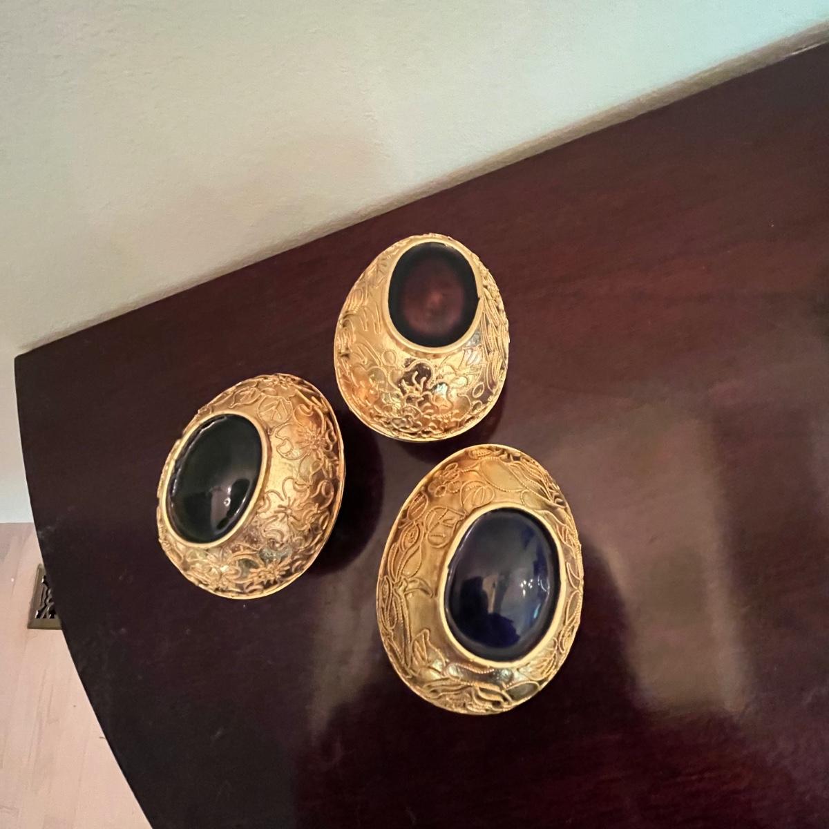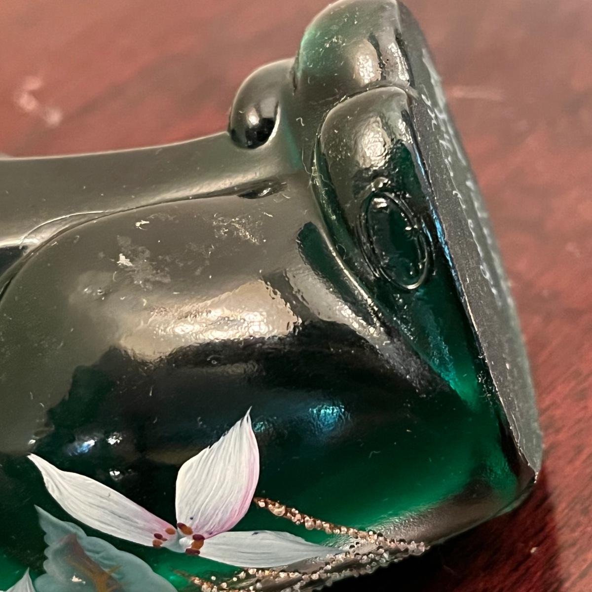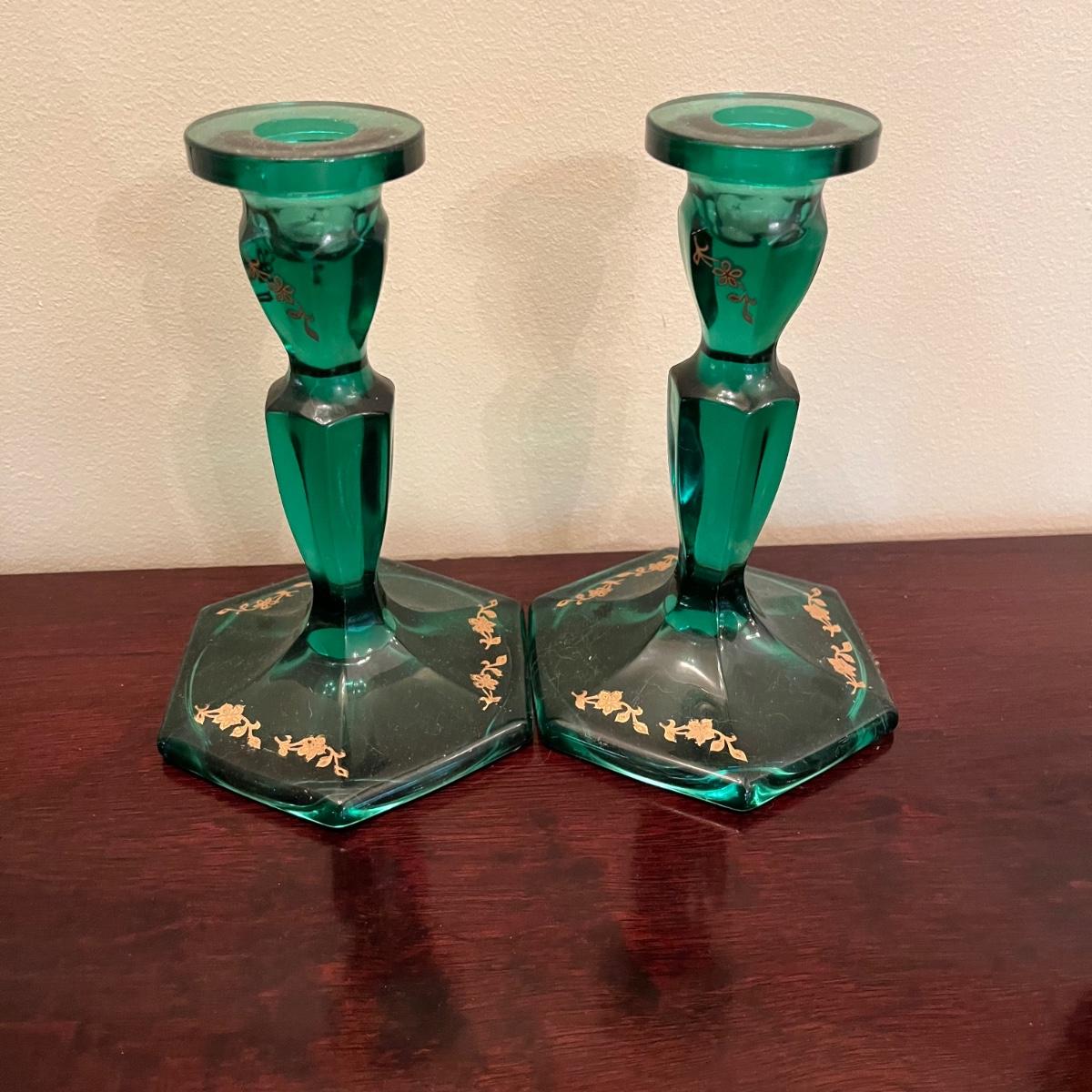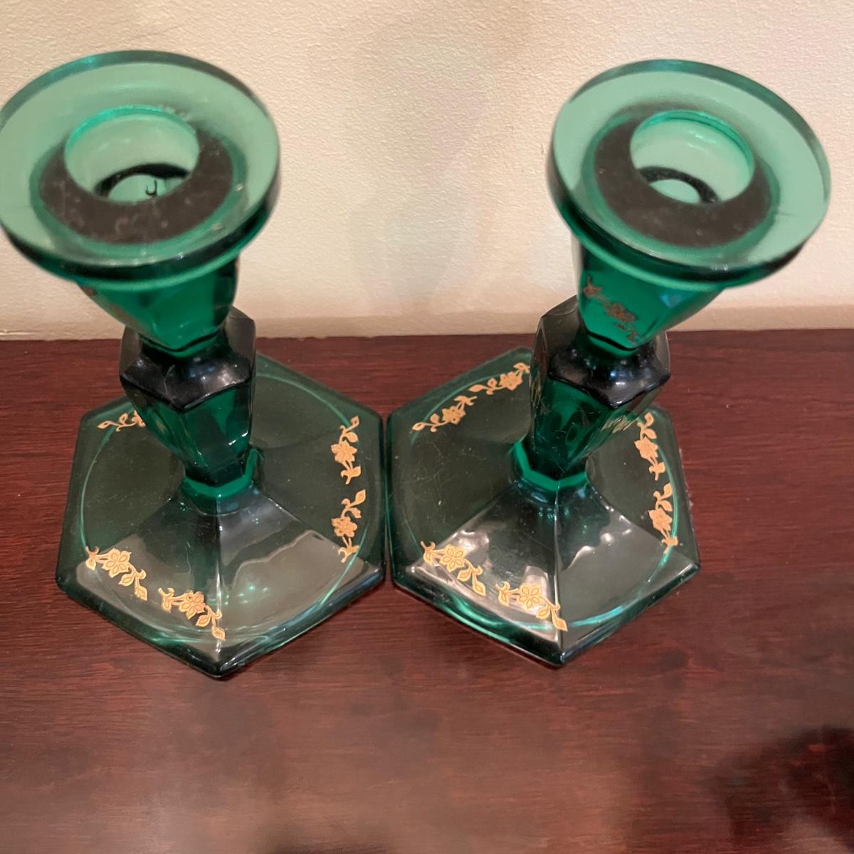 Lot includes a hand painted Fenton cat, hand painted footed Fenton jar, two painted glass candlesticks and three gold colored metal egg holders with colorful eggs inside. Fenton cat measures 4.5”D x 9.5” tall.
