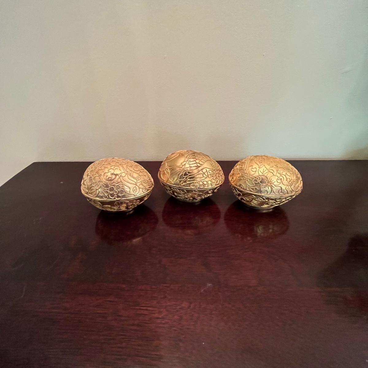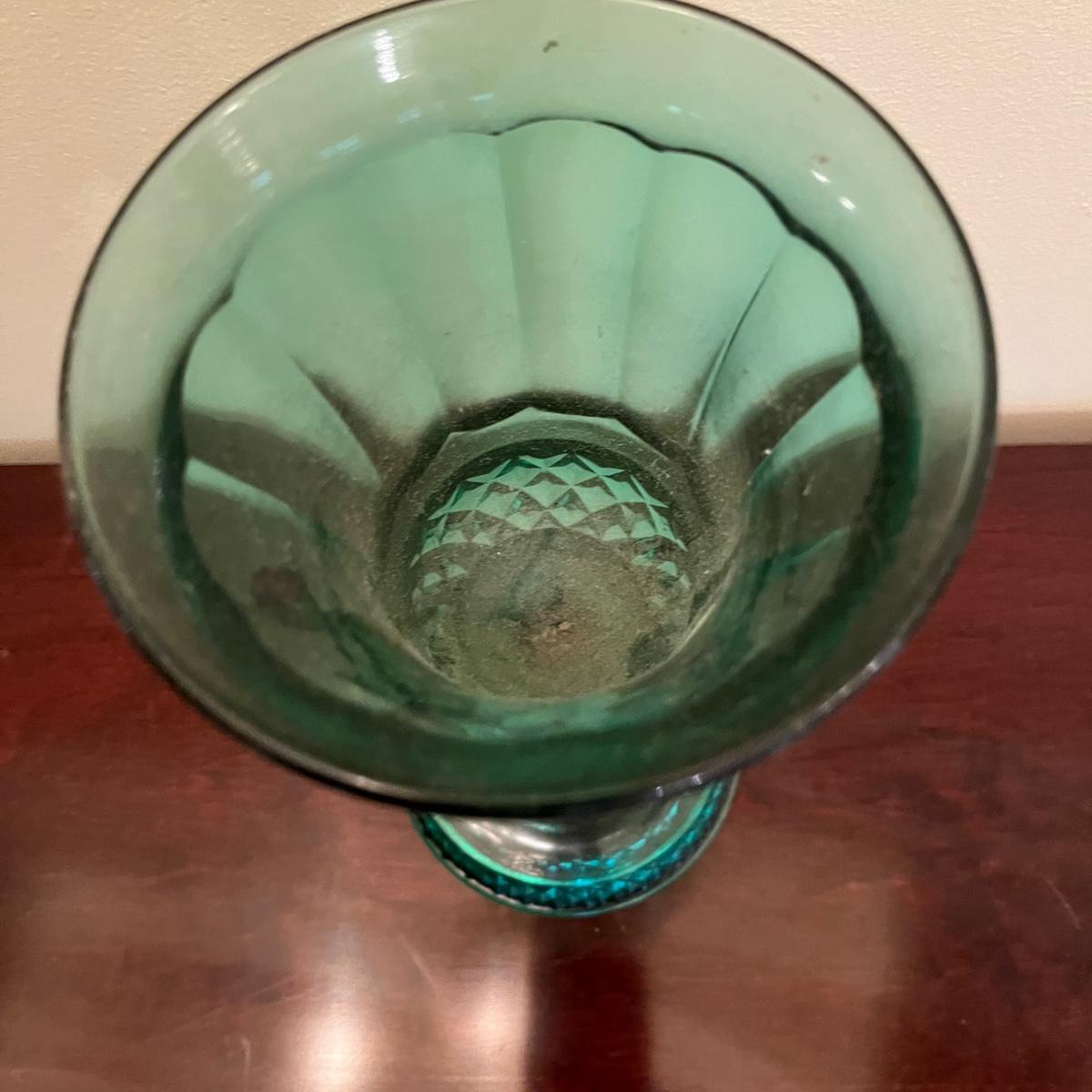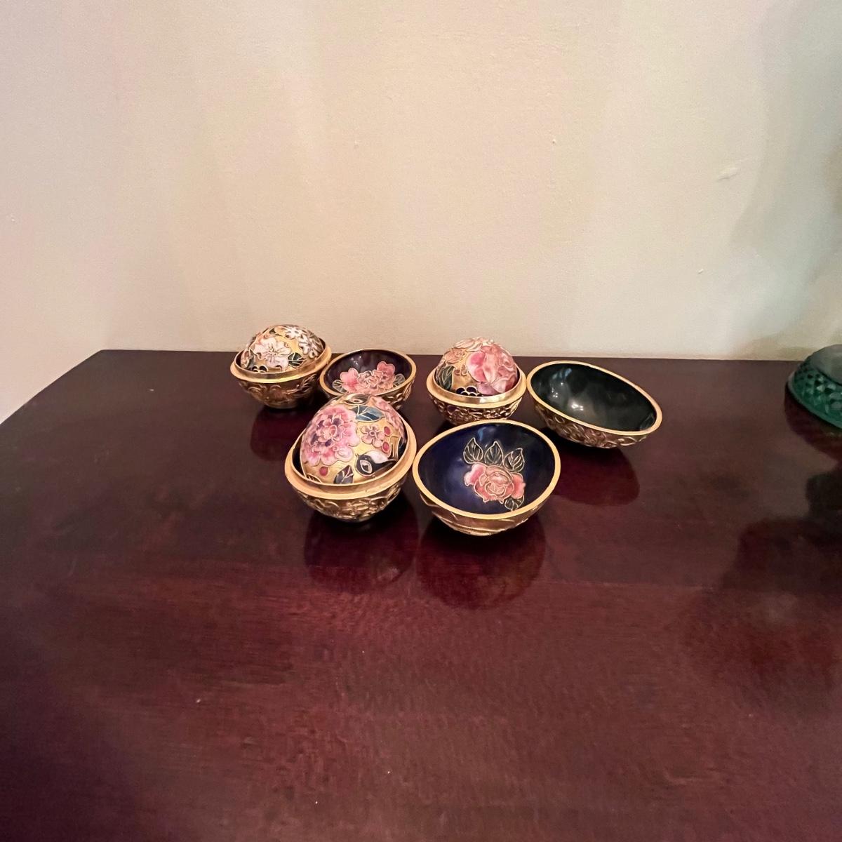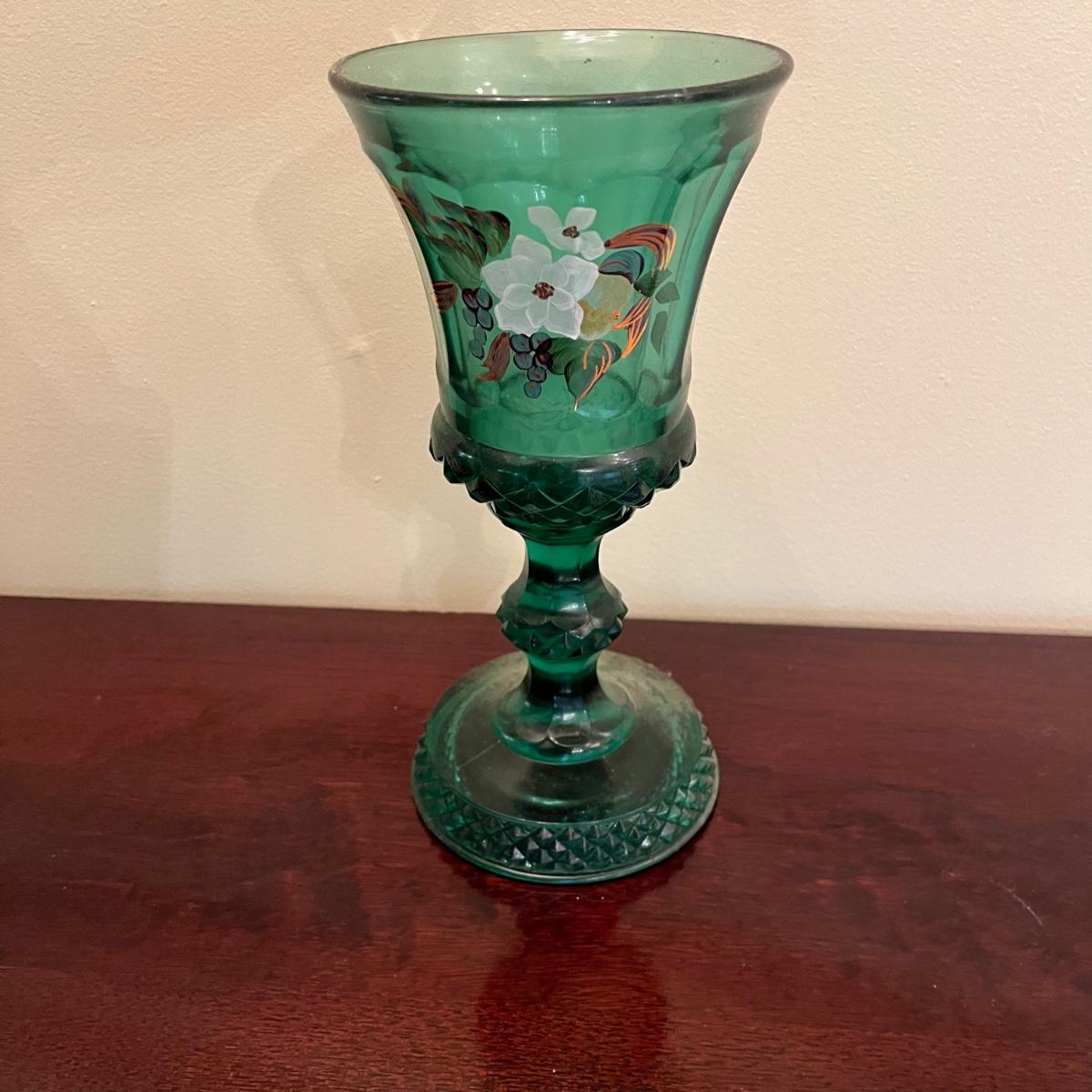 Lot includes a hand painted Fenton cat, hand painted footed Fenton jar, two painted glass candlesticks and three gold colored metal egg holders with colorful eggs inside. Fenton cat measures 4.5”D x 9.5” tall.