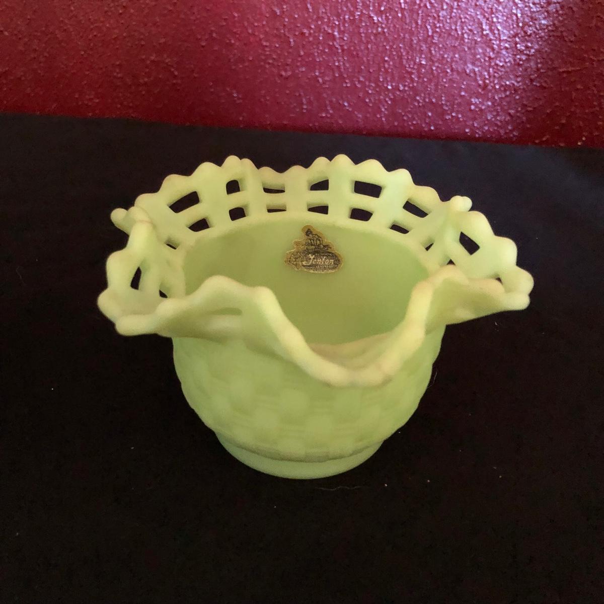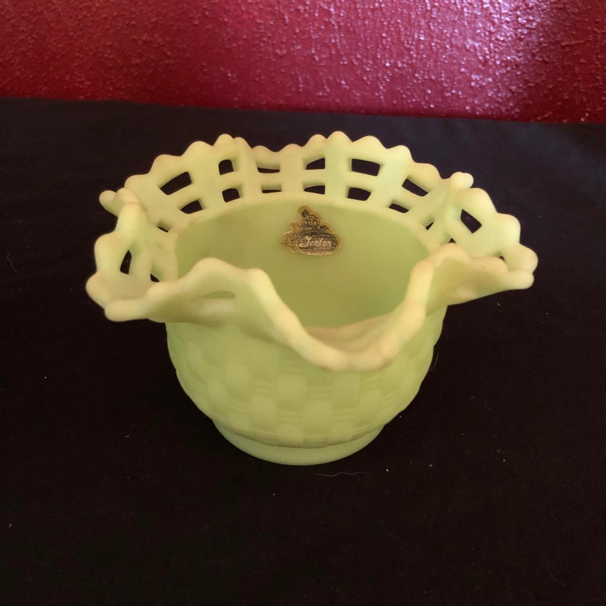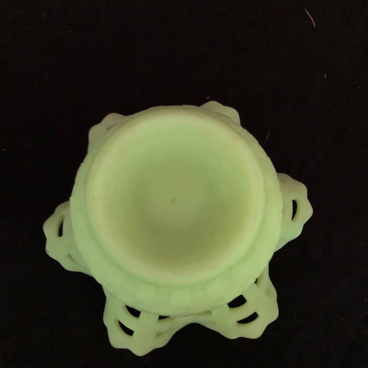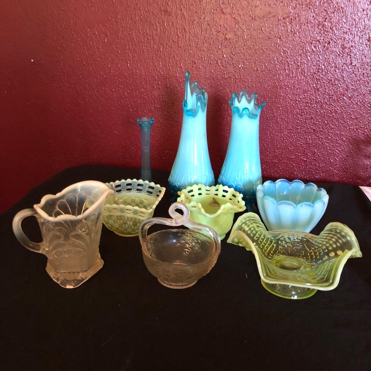 Lot includes Fenton green lattice custard bowl, two footed vases, bowl, lattice dish, footed bowl, pitcher and dish with handle and a vase. Tallest vase measures 4”D x 12” tall.