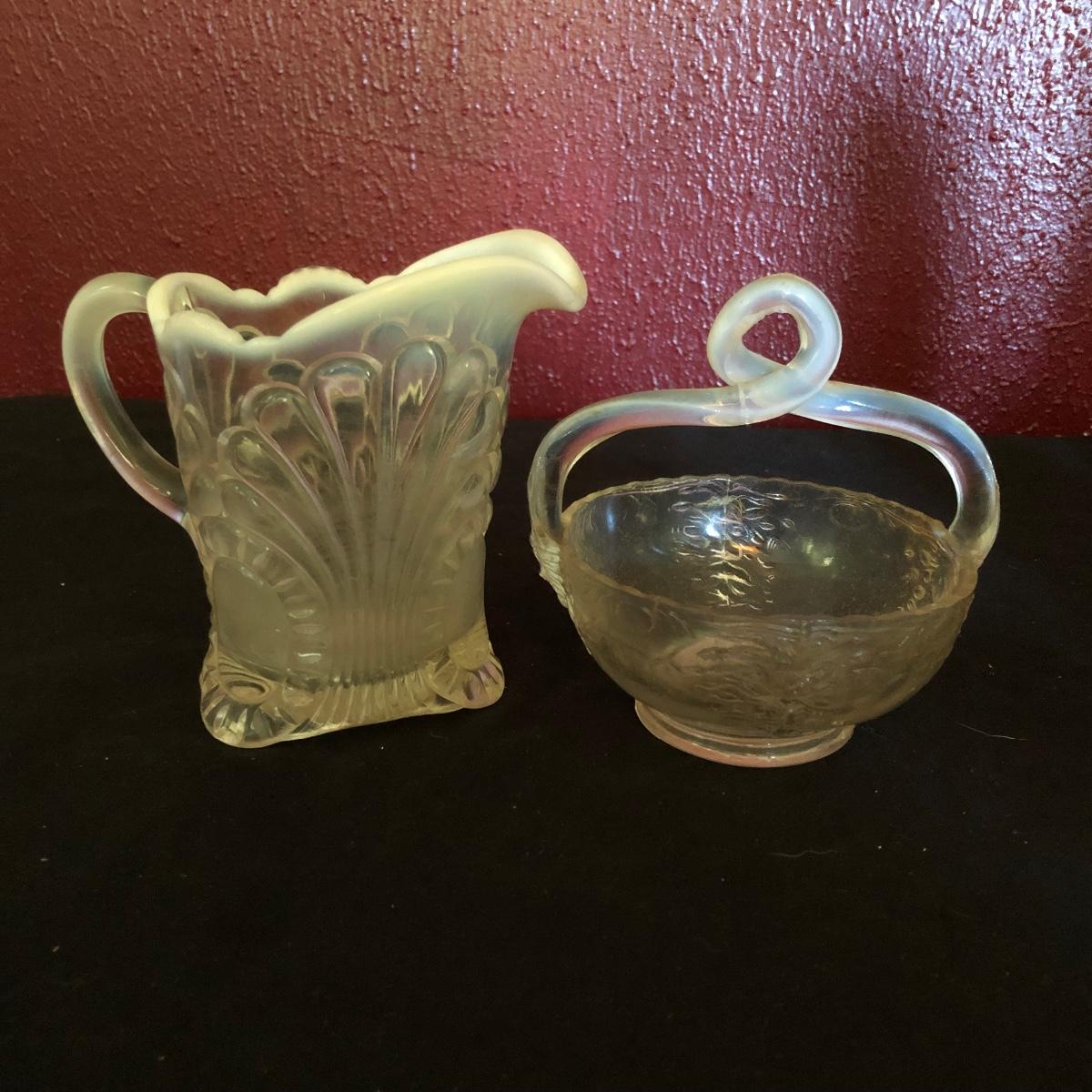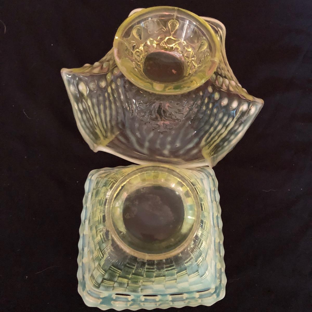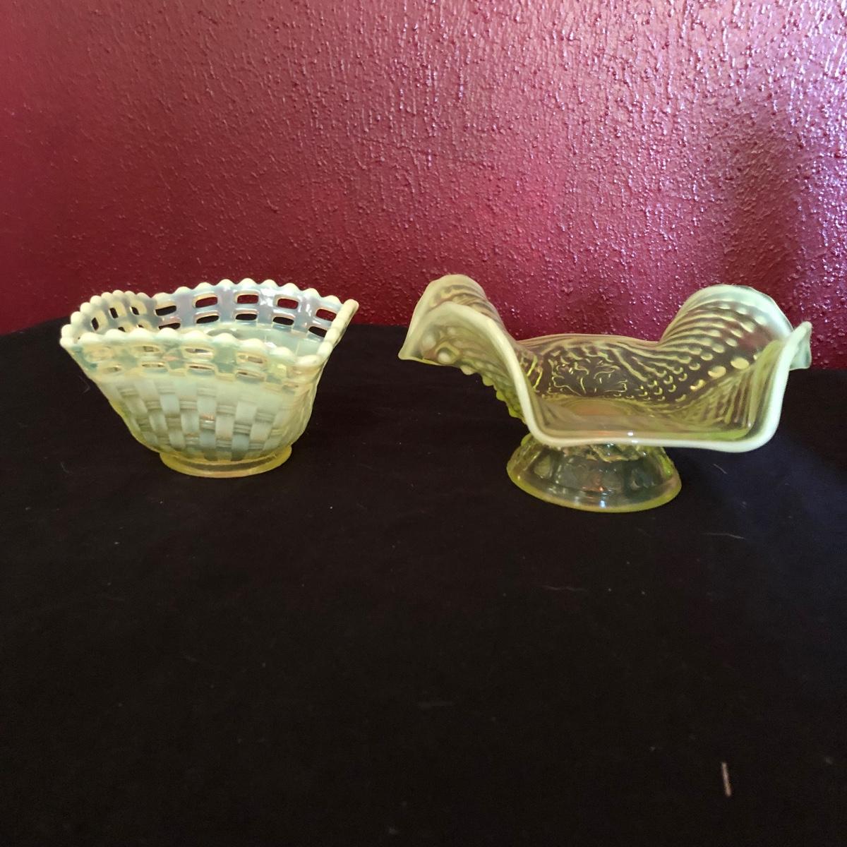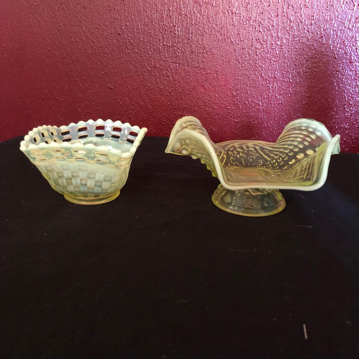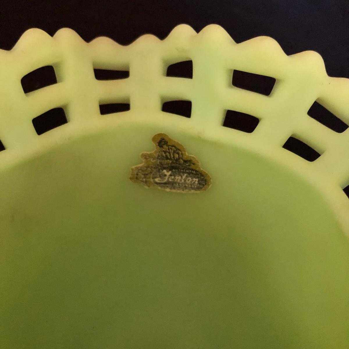 Lot includes Fenton green lattice custard bowl, two footed vases, bowl, lattice dish, footed bowl, pitcher and dish with handle and a vase. Tallest vase measures 4”D x 12” tall.