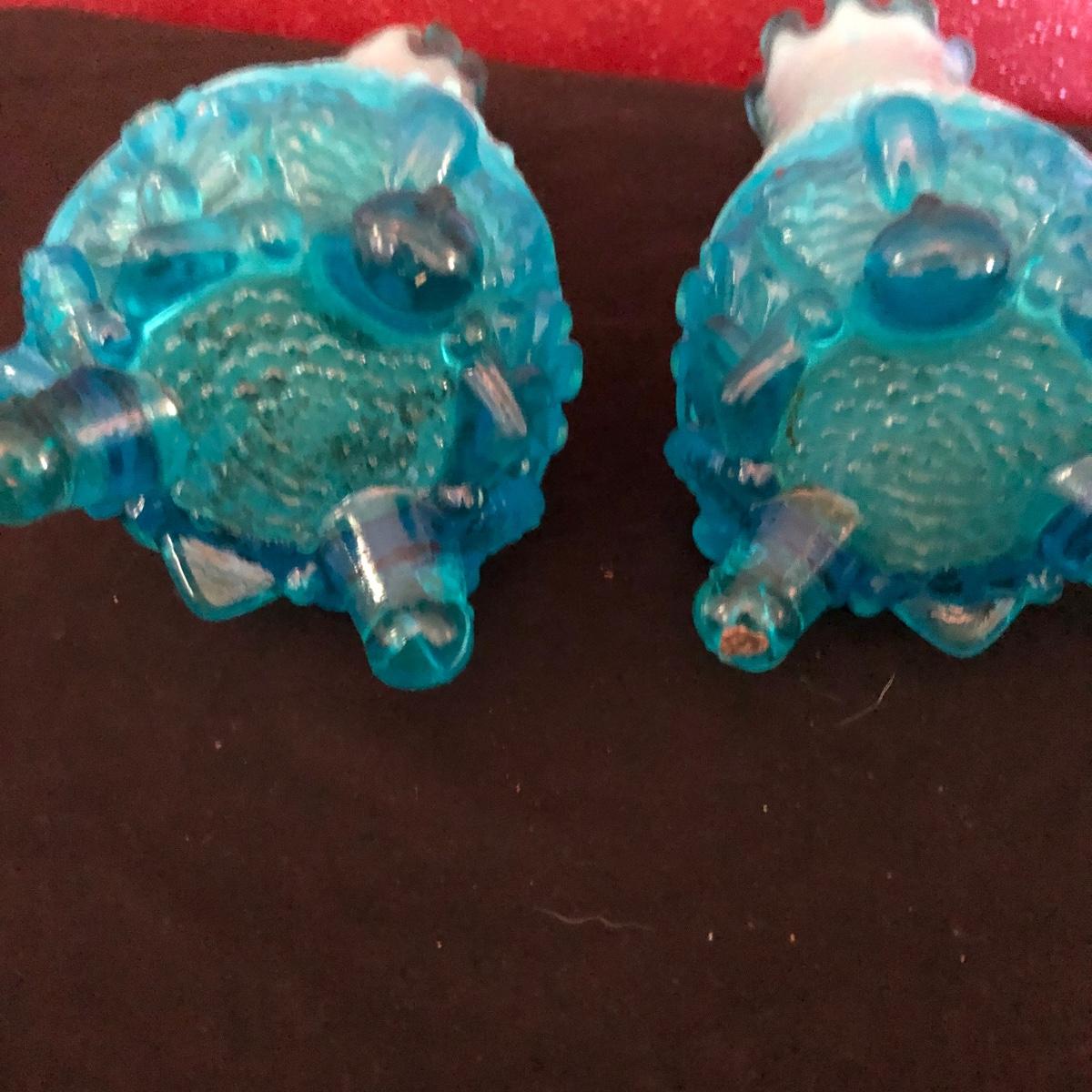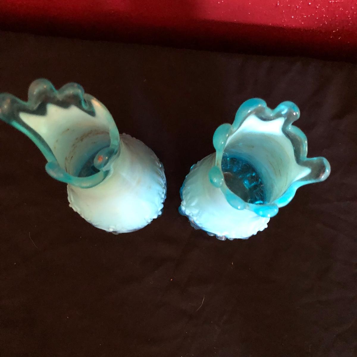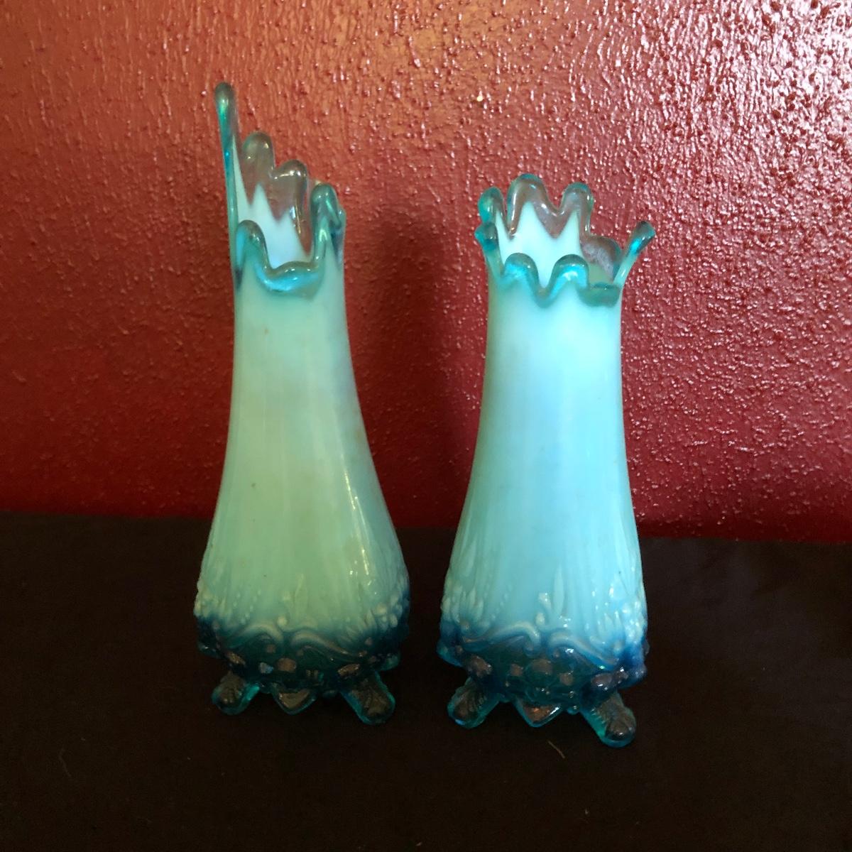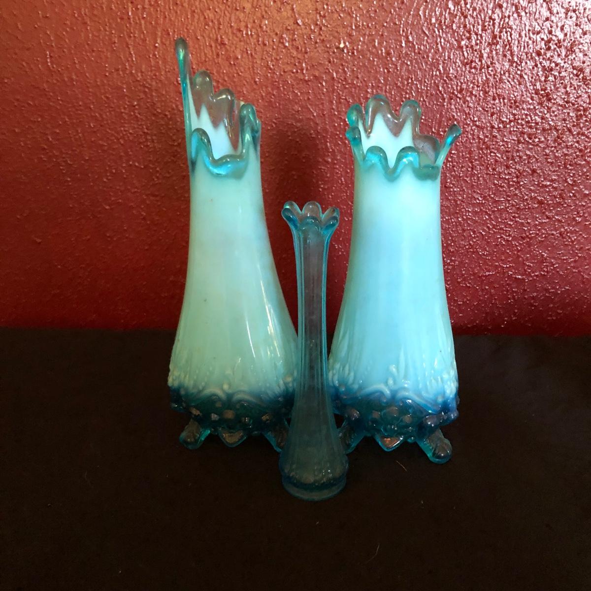 Lot includes Fenton green lattice custard bowl, two footed vases, bowl, lattice dish, footed bowl, pitcher and dish with handle and a vase. Tallest vase measures 4”D x 12” tall.