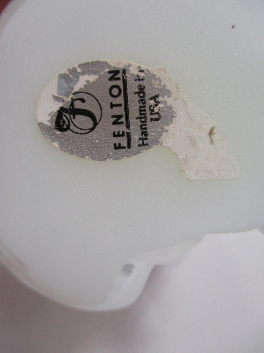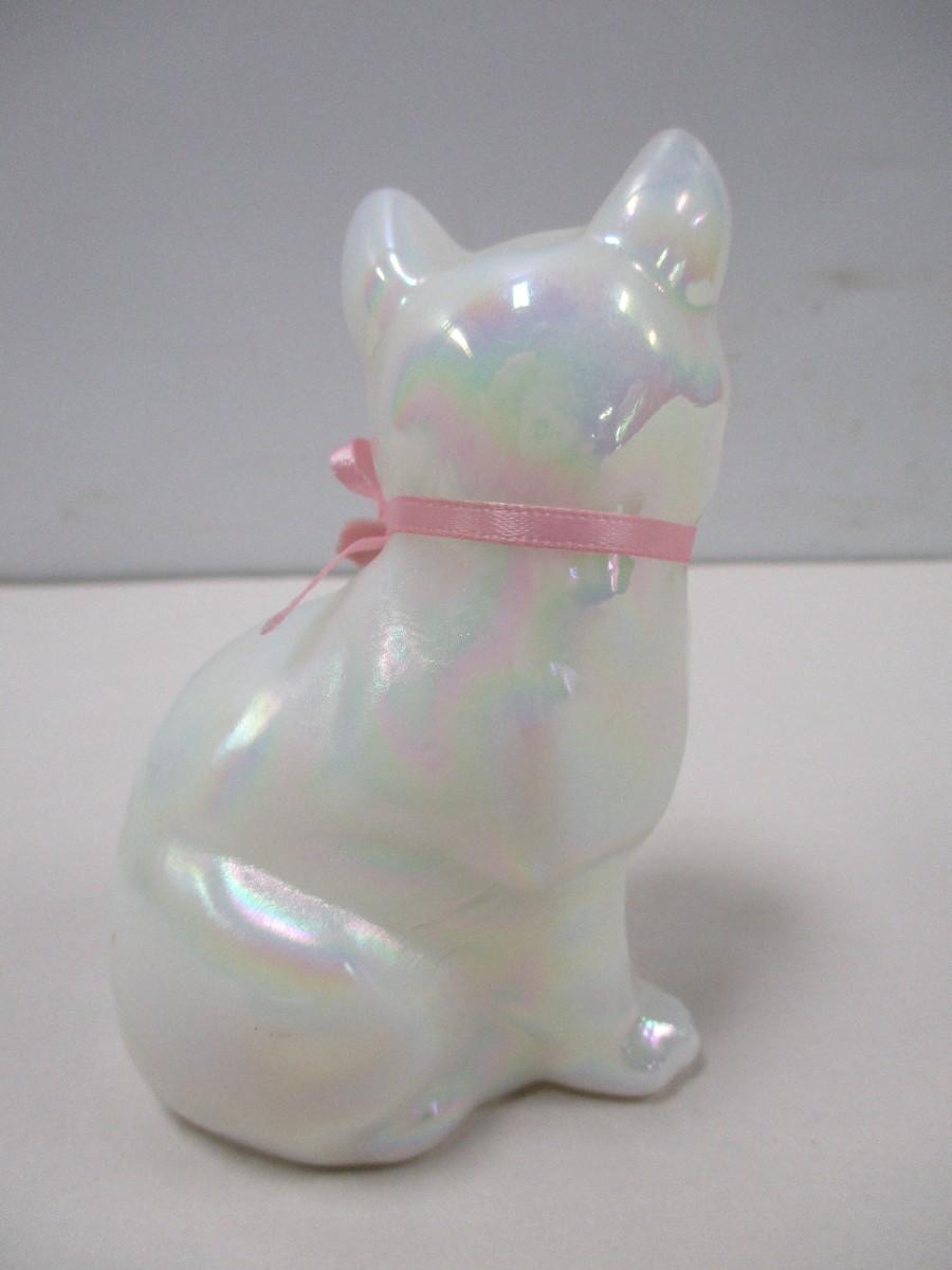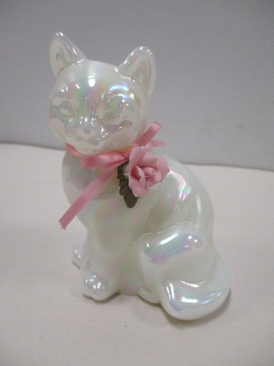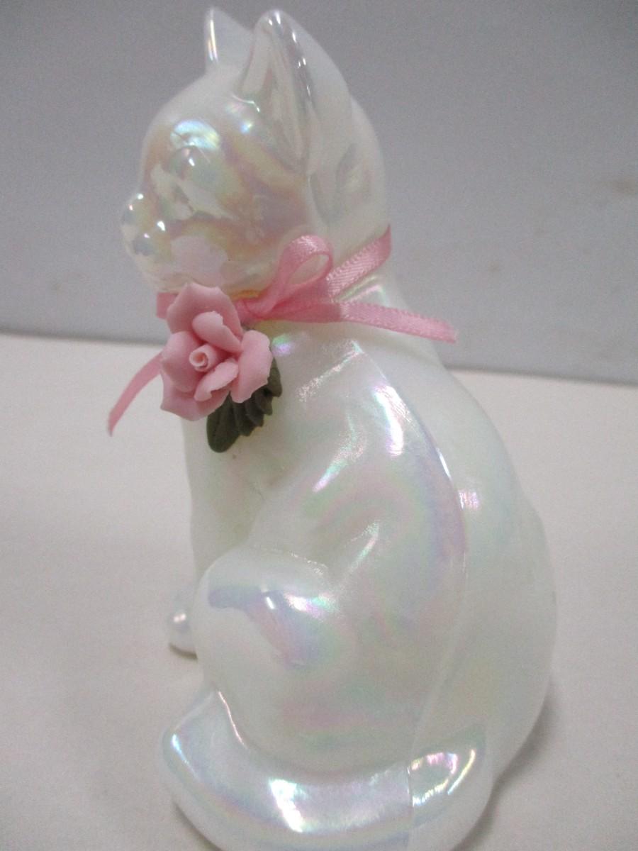 Fenton Glass Pearl White Iridescent Cat with Pink Porcelain Rose Figurine