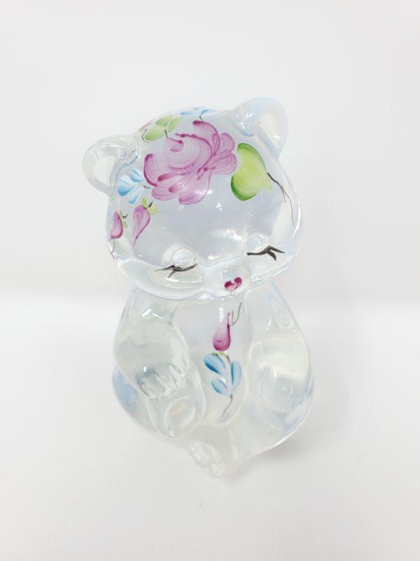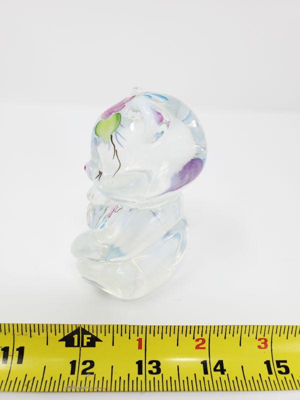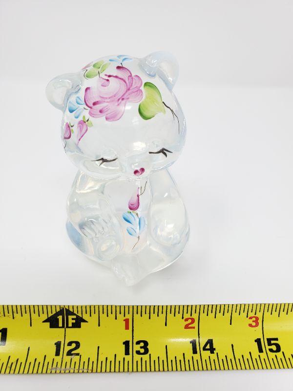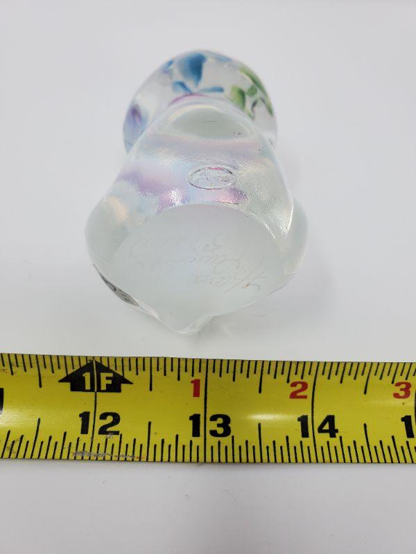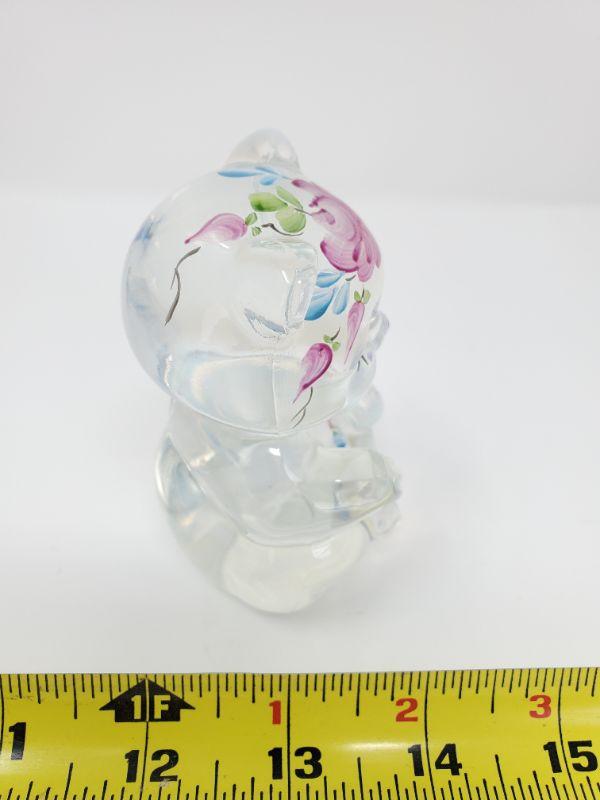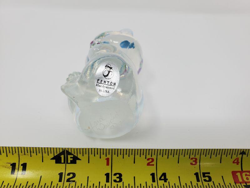 Adorable and perfect decor for spring!! Stamped Fenton in glass on back near base, sticker attached and signed on bottom. Very good condition.