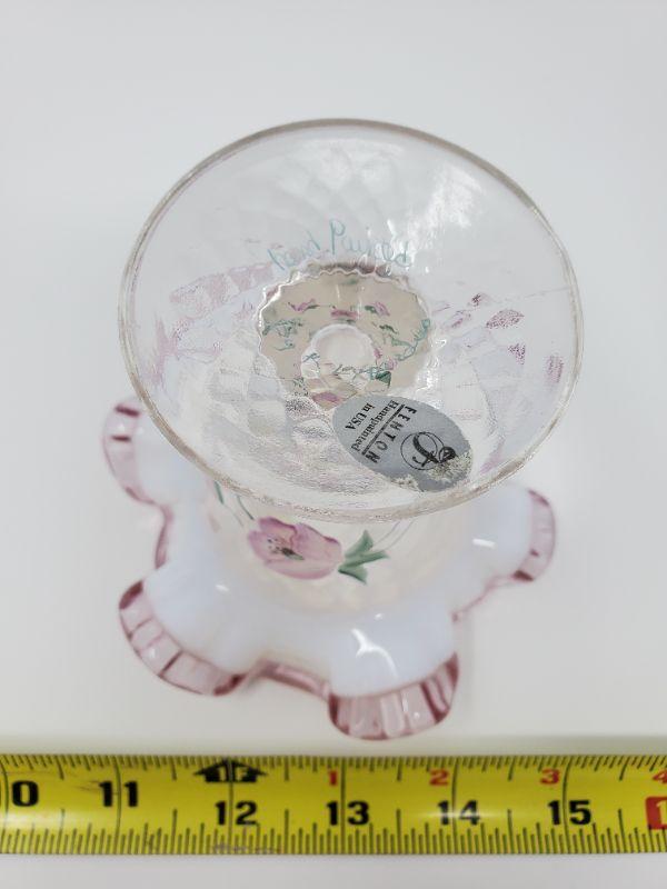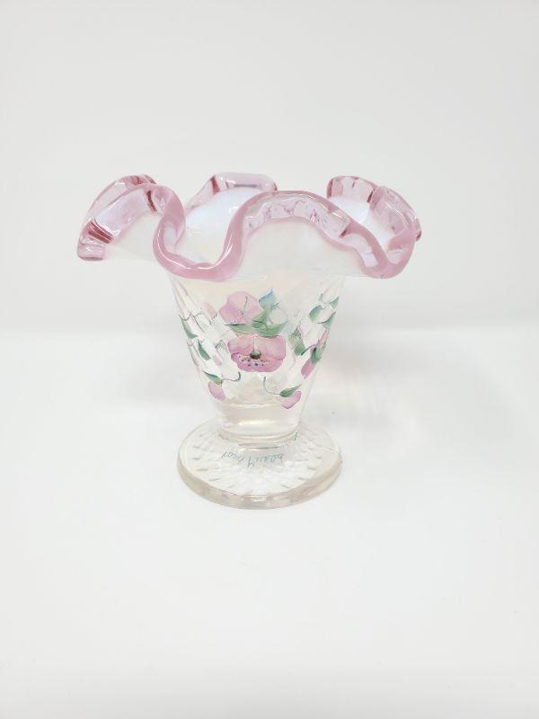 This Fenton vase is adorable and perfect for spring flowers! Hand painted, signed with Fenton sticker attached to bottom.