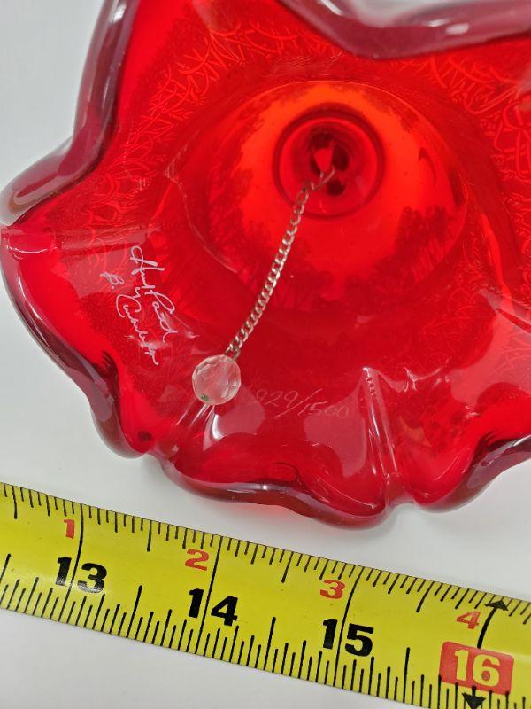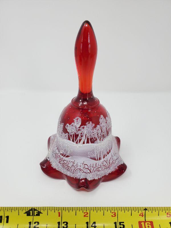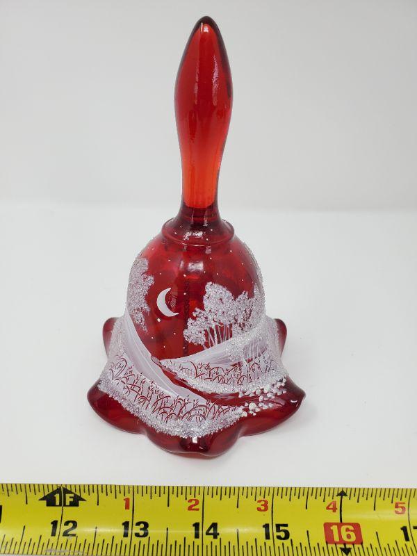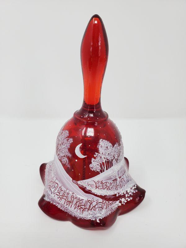 Gorgeous red glass bell is hand painted with a winter scene. Very good condition. Fenton stamped into glass near base of handle. Signed and numbered on underside.
