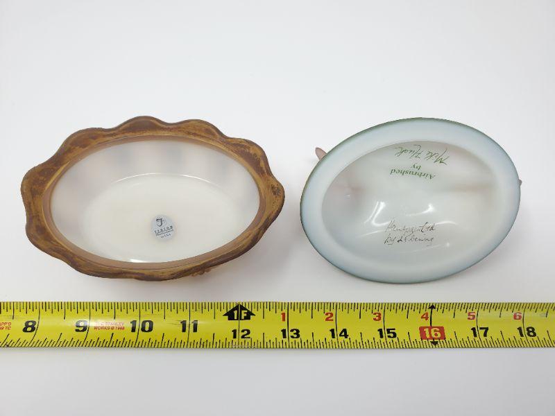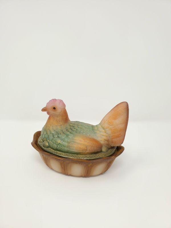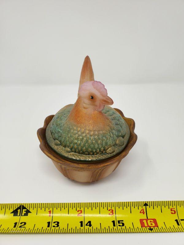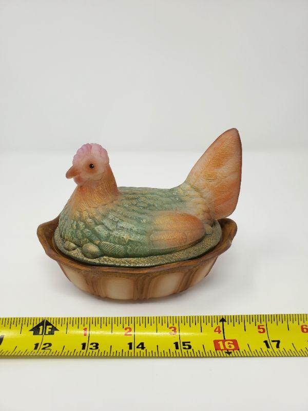 This piece has been airbrushed and hand painted. Super gorgeous Fenton hen on a nest in very good condition, sticker attached and stamped on both pieces.