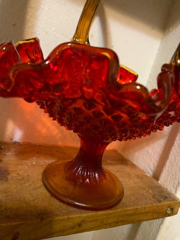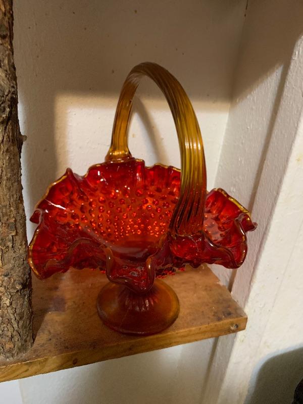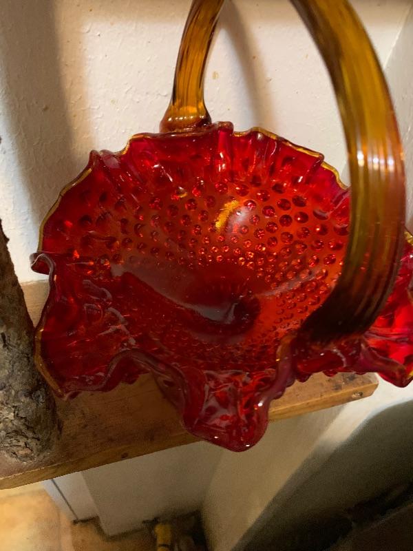 Beautiful Amberina glass basket, no damage or repairs, good condition. 8’ H at the highest