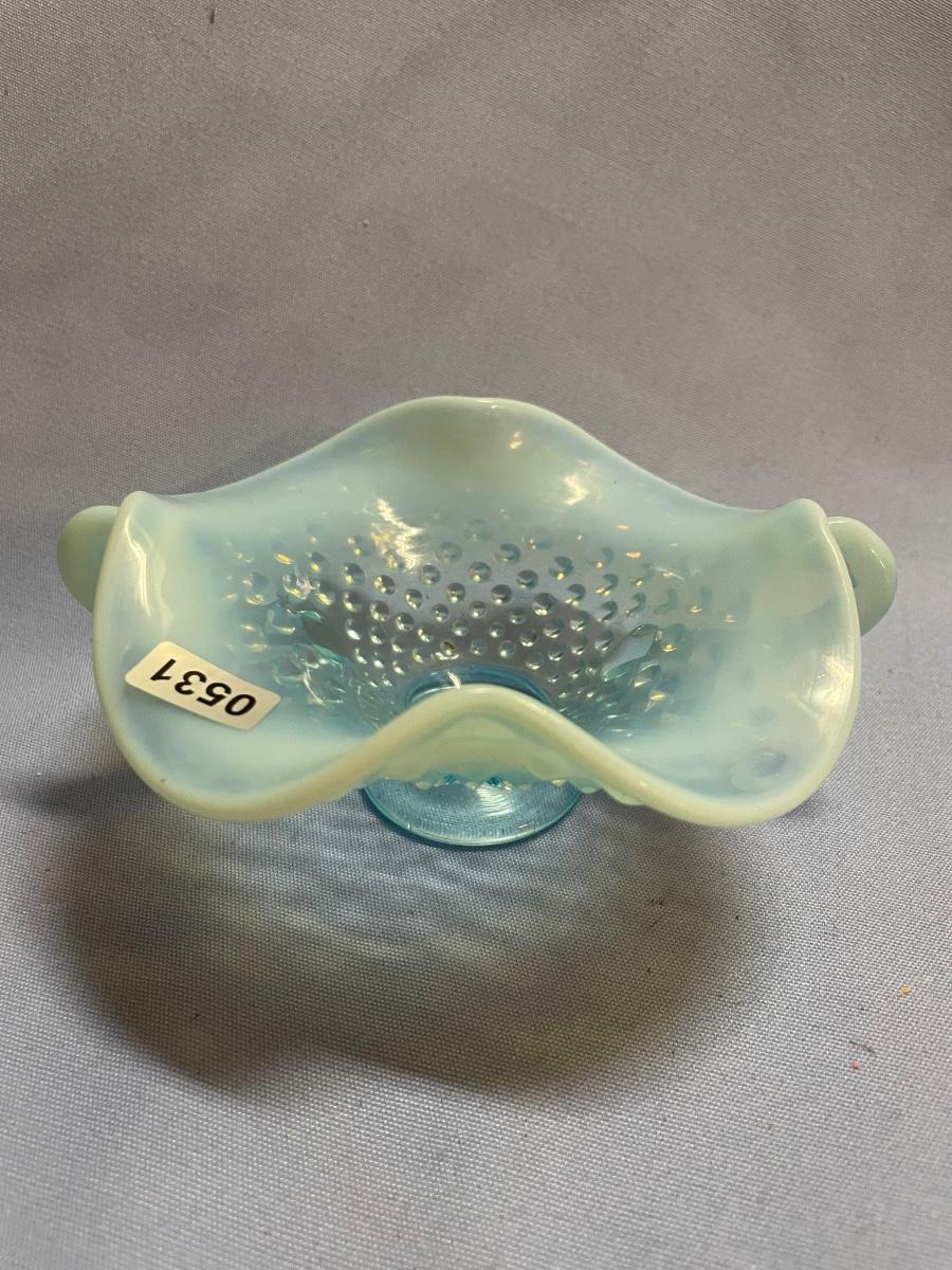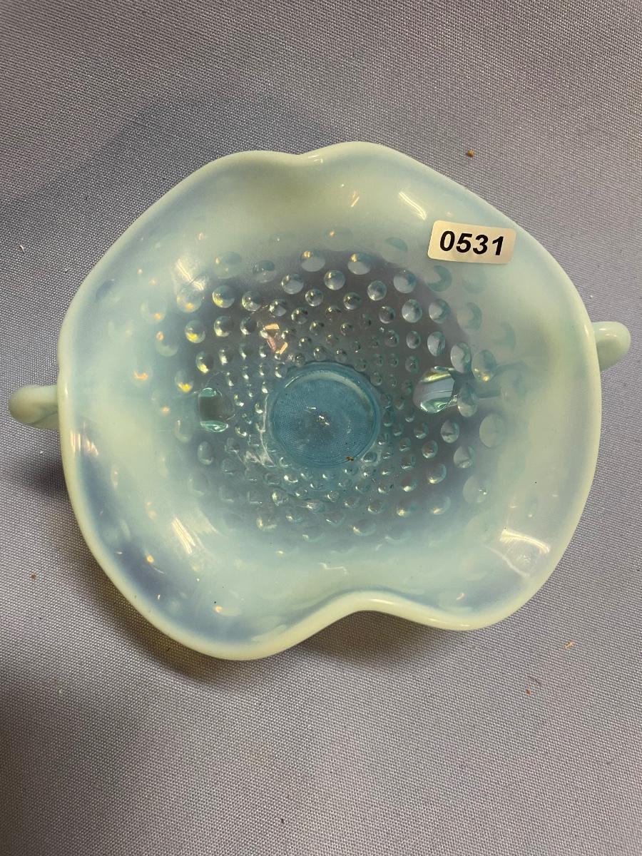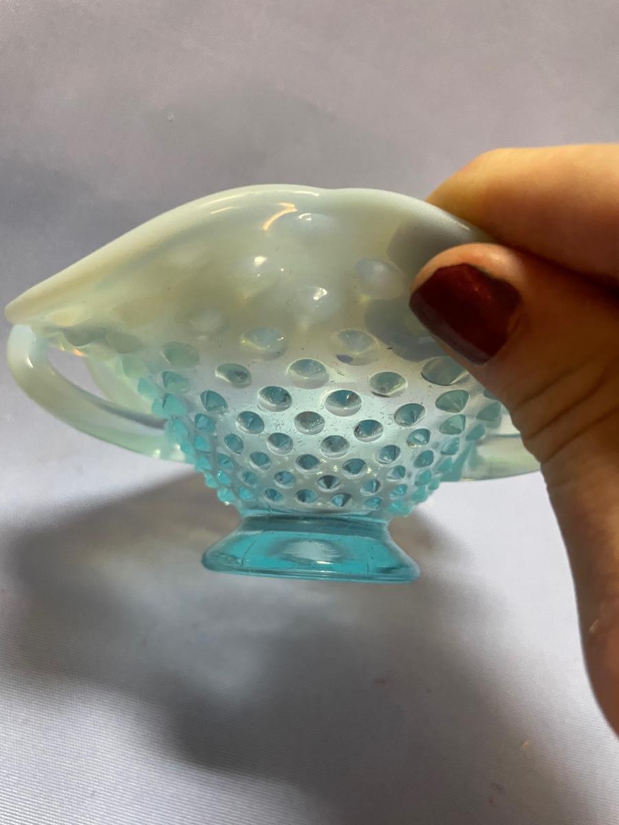 Fenton hobnail glass opalescent dish with double handles