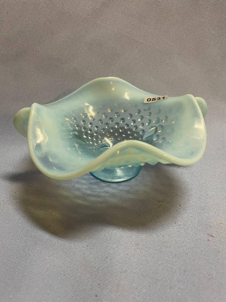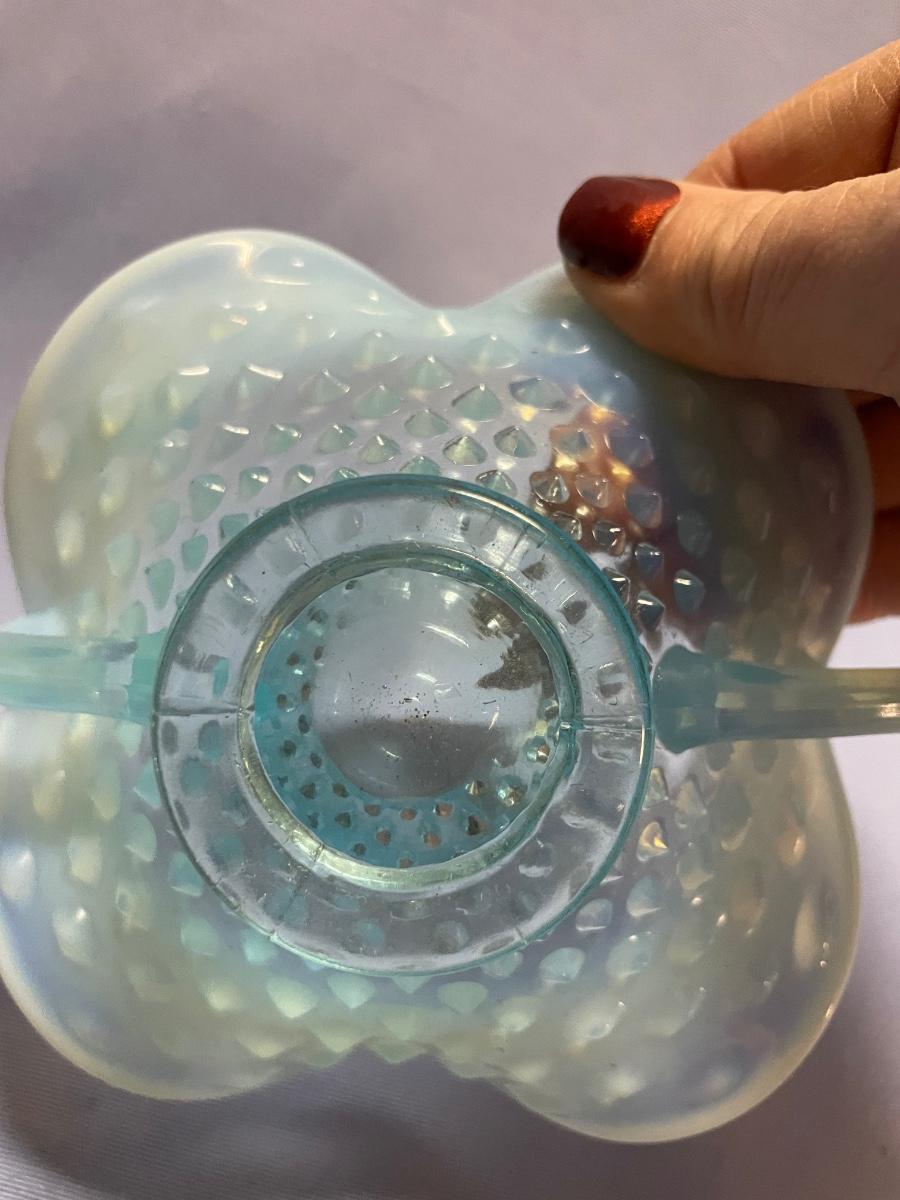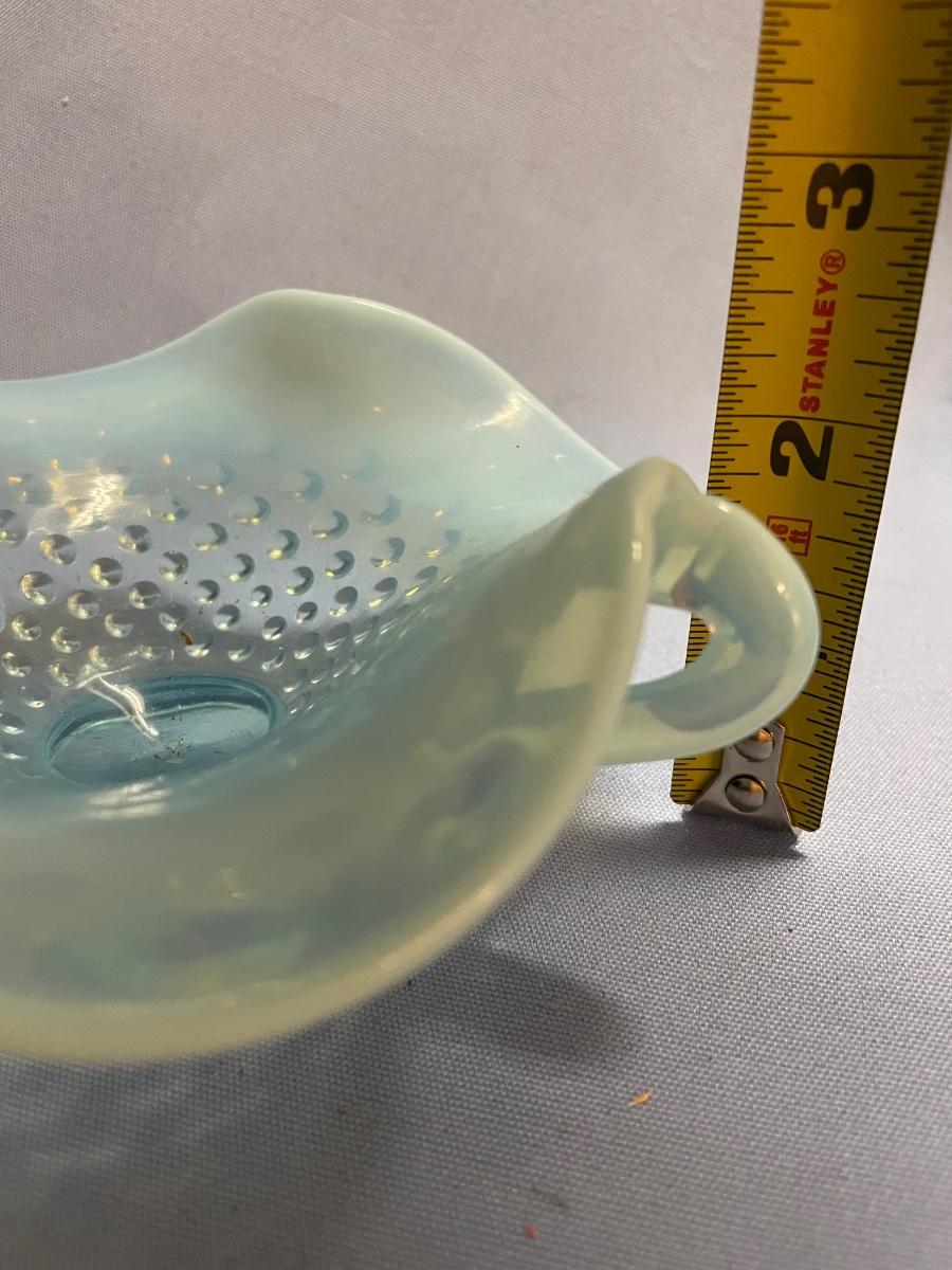 Fenton hobnail glass opalescent dish with double handles