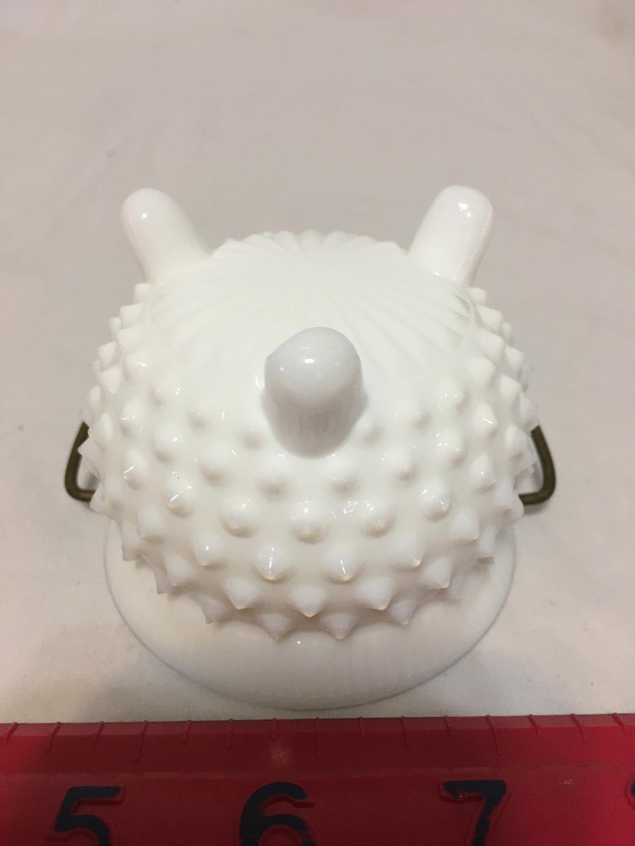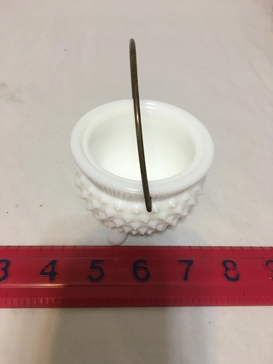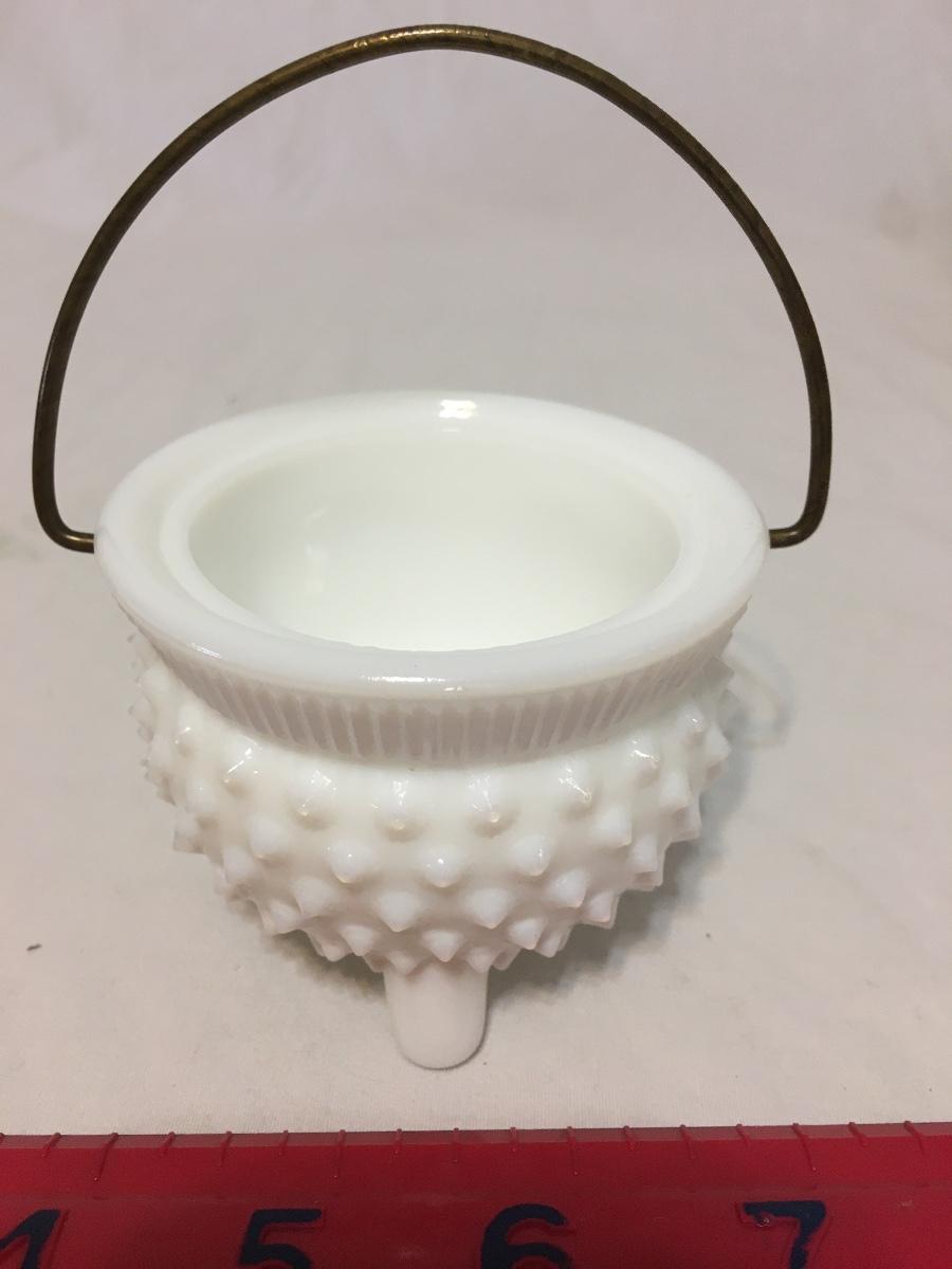 FENTON Hobnail Milk Glass 3-Footed Mustard Kettle, with Wire Handle