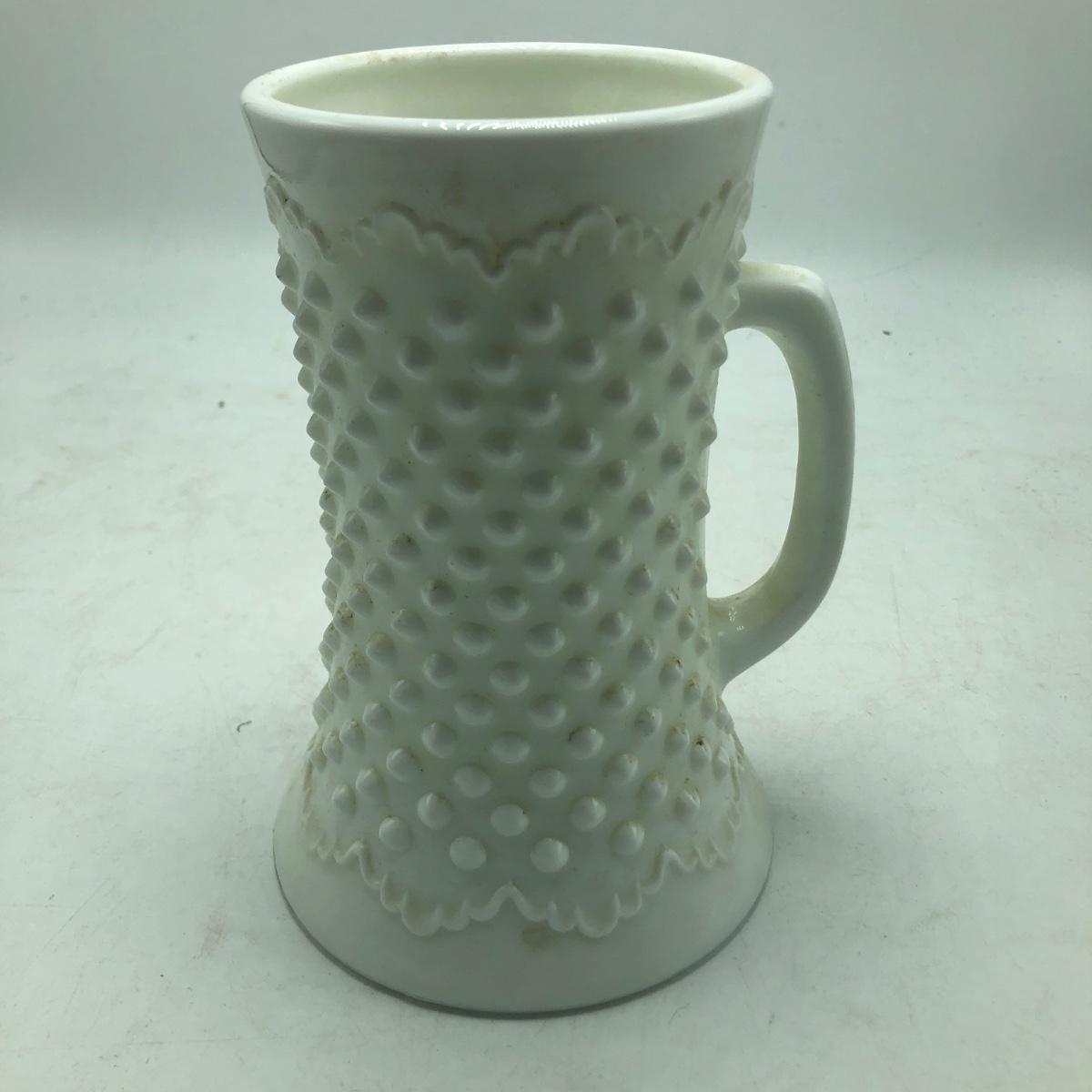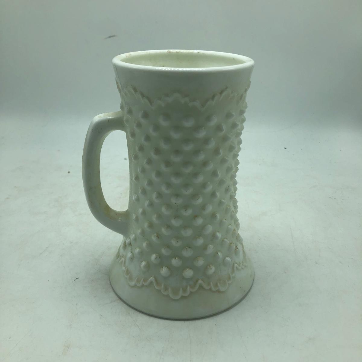 Lot includes a Fenton Hobnail milk glass mug that measures 4.75”D x 6.75” tall.