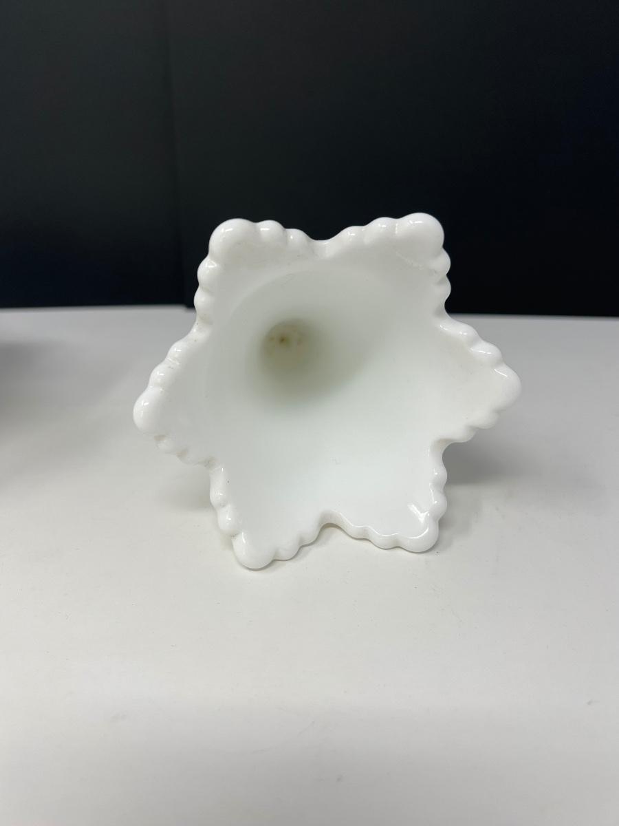 Single horn marked Fenton milk glass epergne. Horn is removable. Overall measures 8” tall and 7” round. Base is 3” tall and horn is 4” round at top.