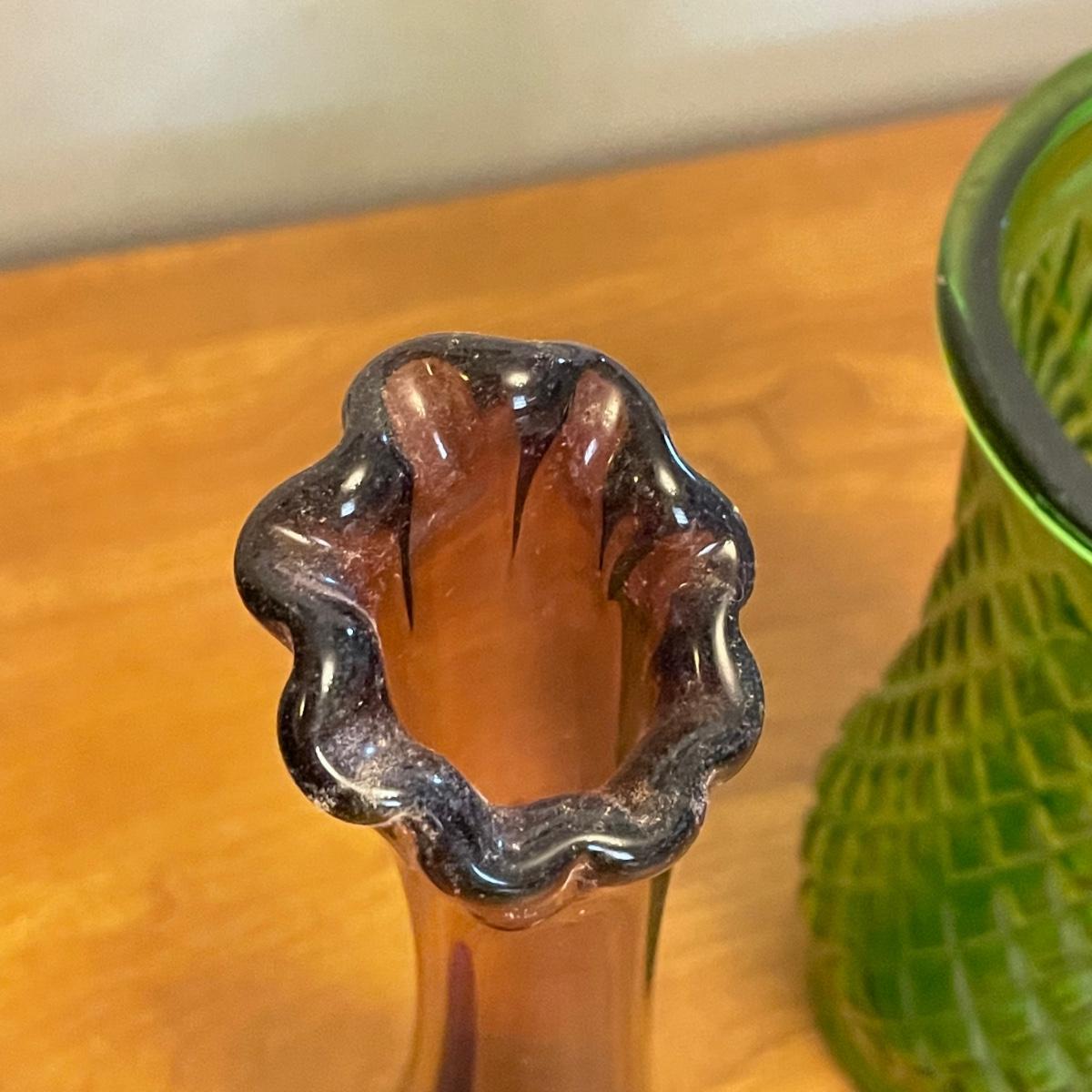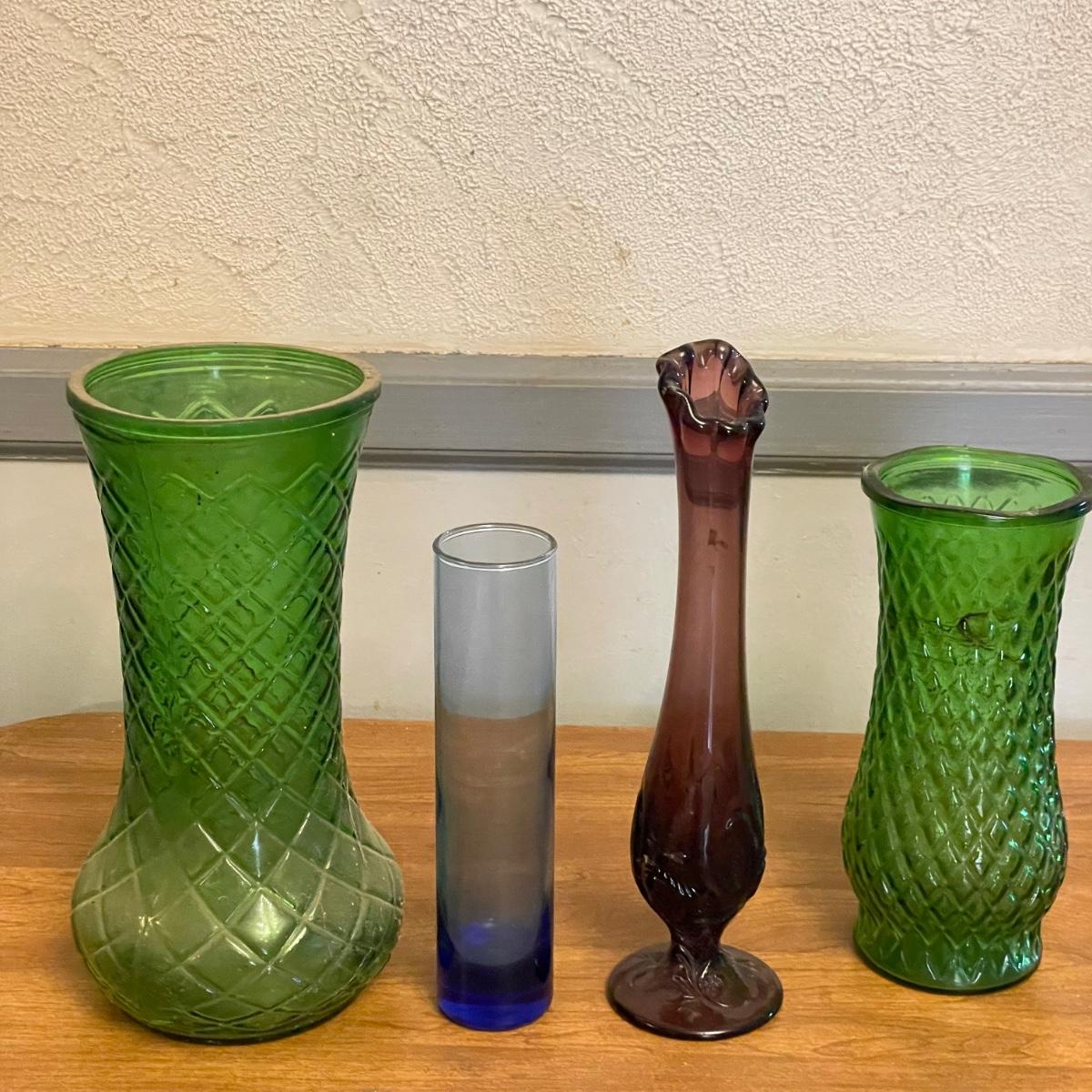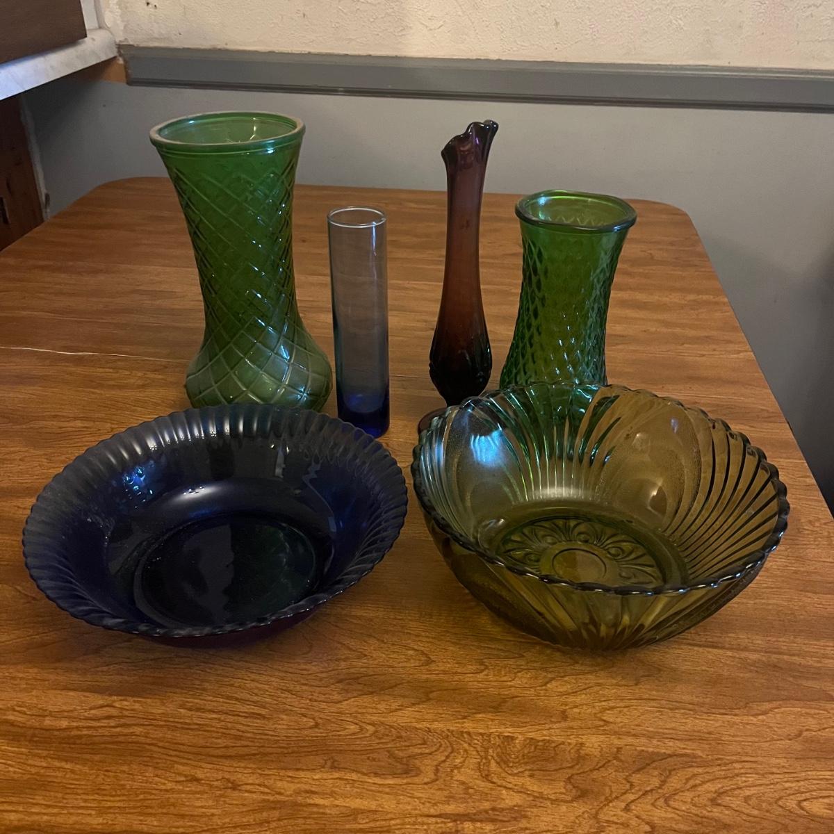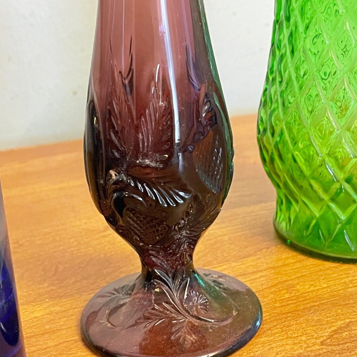 Amethyst 10.25” bud vase stamped Fenton, a 9.5”d x 2.5” Colorex serving bowl, a mix-textured green serving bowl, a large 10” Hoosier emerald green glass vase with diamond patterned and a smaller stamped vase. Lot also contains a sapphire bud vase with a bright base. See images. Shipping available.