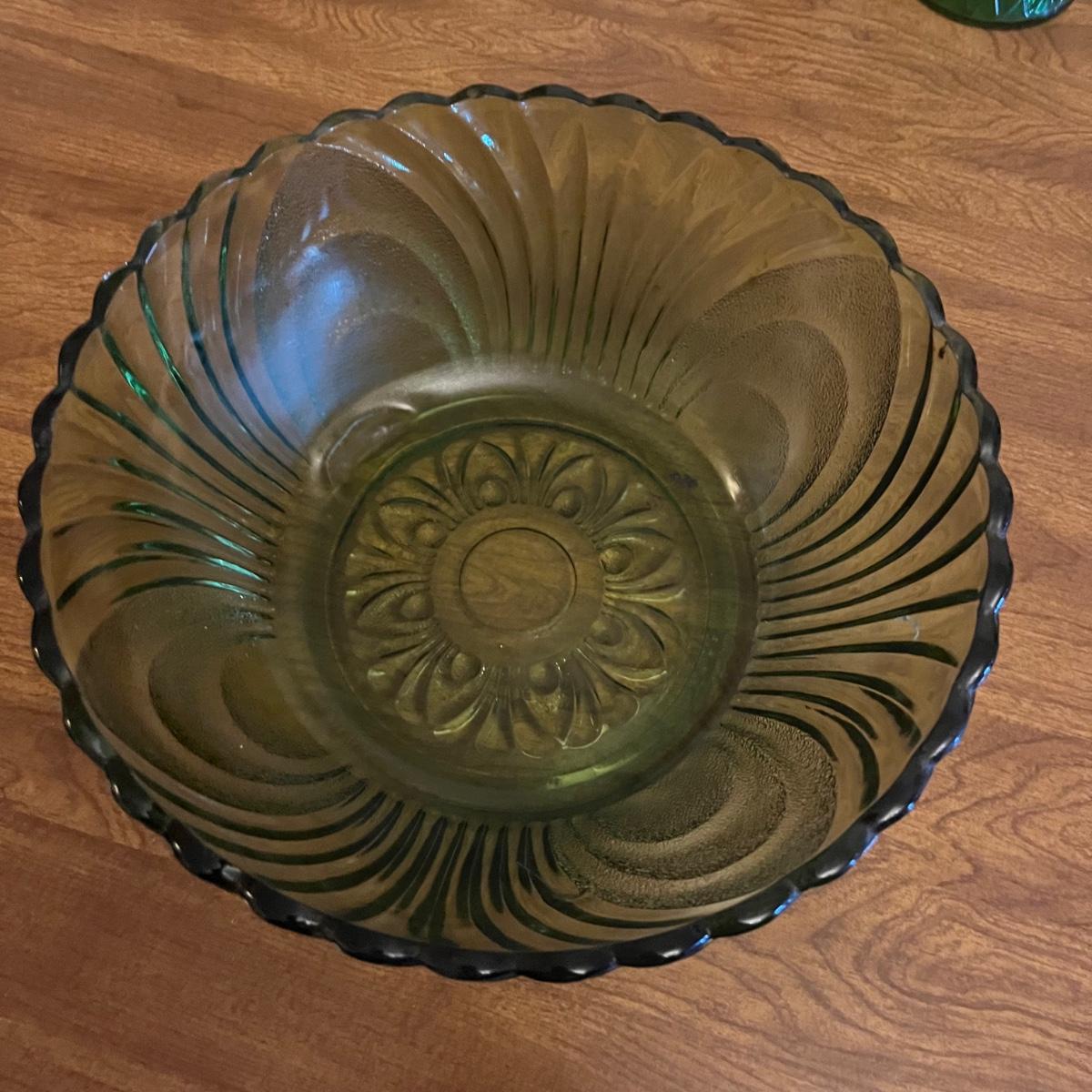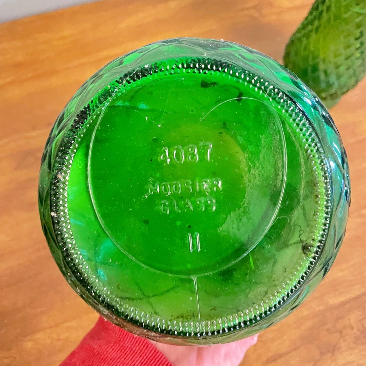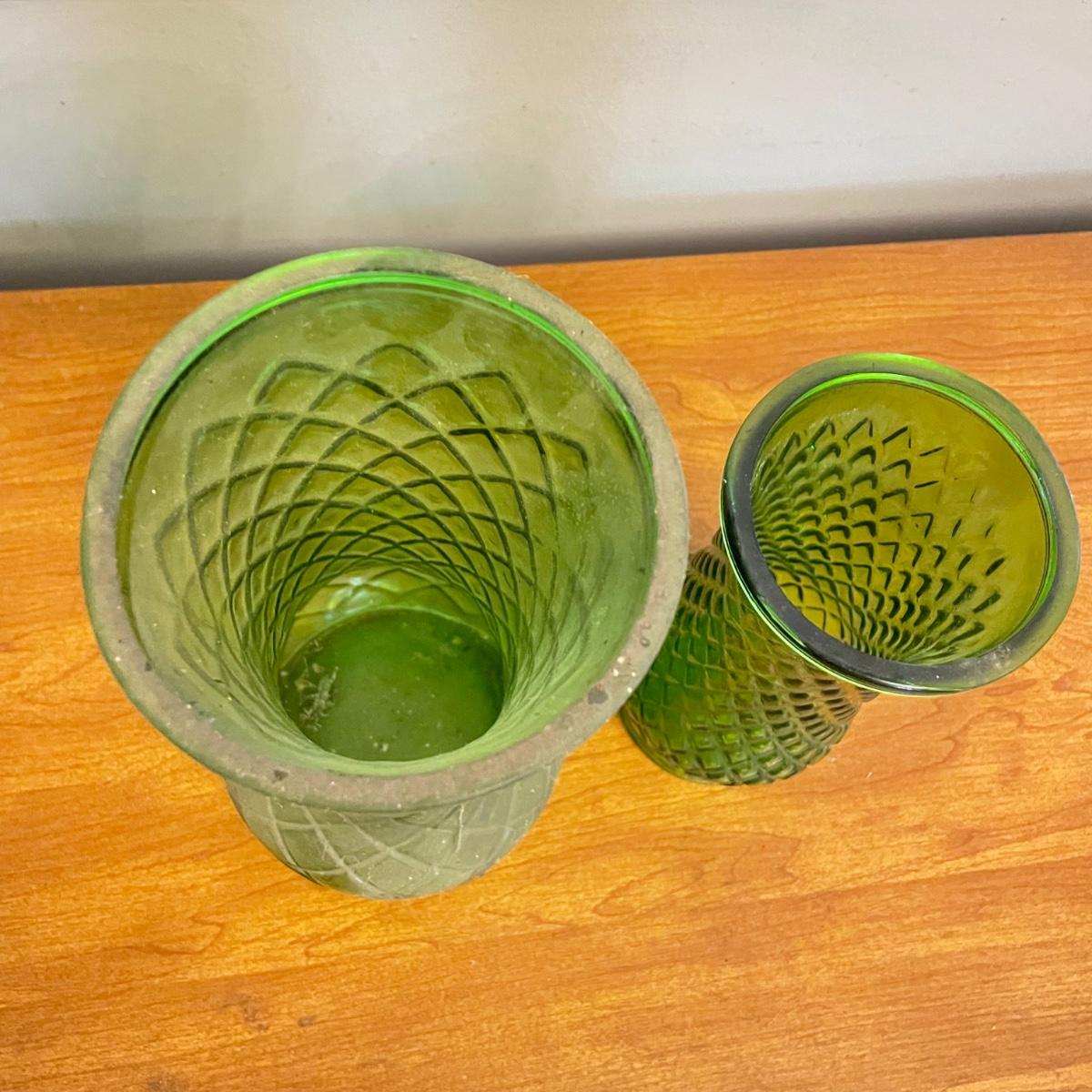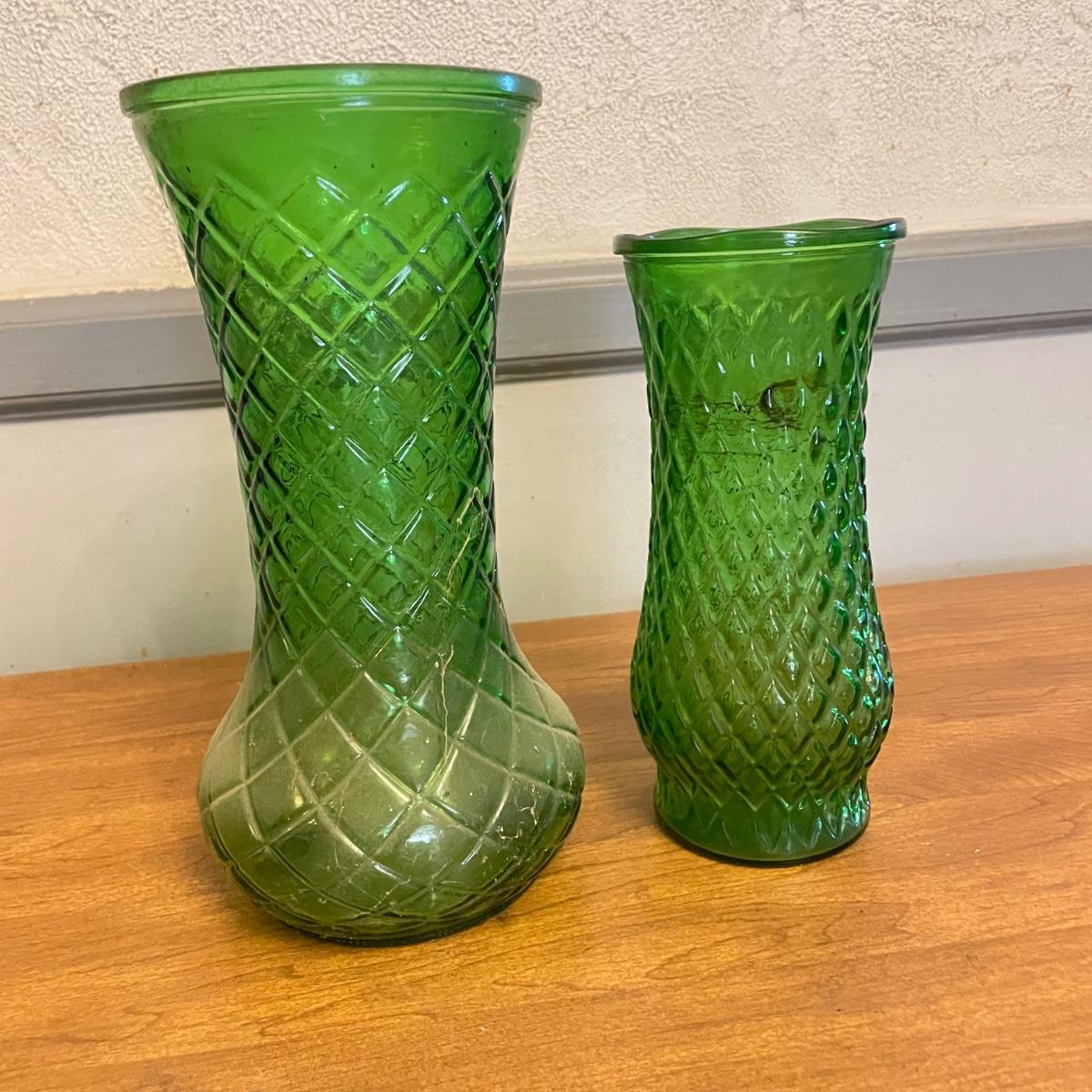 Amethyst 10.25” bud vase stamped Fenton, a 9.5”d x 2.5” Colorex serving bowl, a mix-textured green serving bowl, a large 10” Hoosier emerald green glass vase with diamond patterned and a smaller stamped vase. Lot also contains a sapphire bud vase with a bright base. See images. Shipping available.