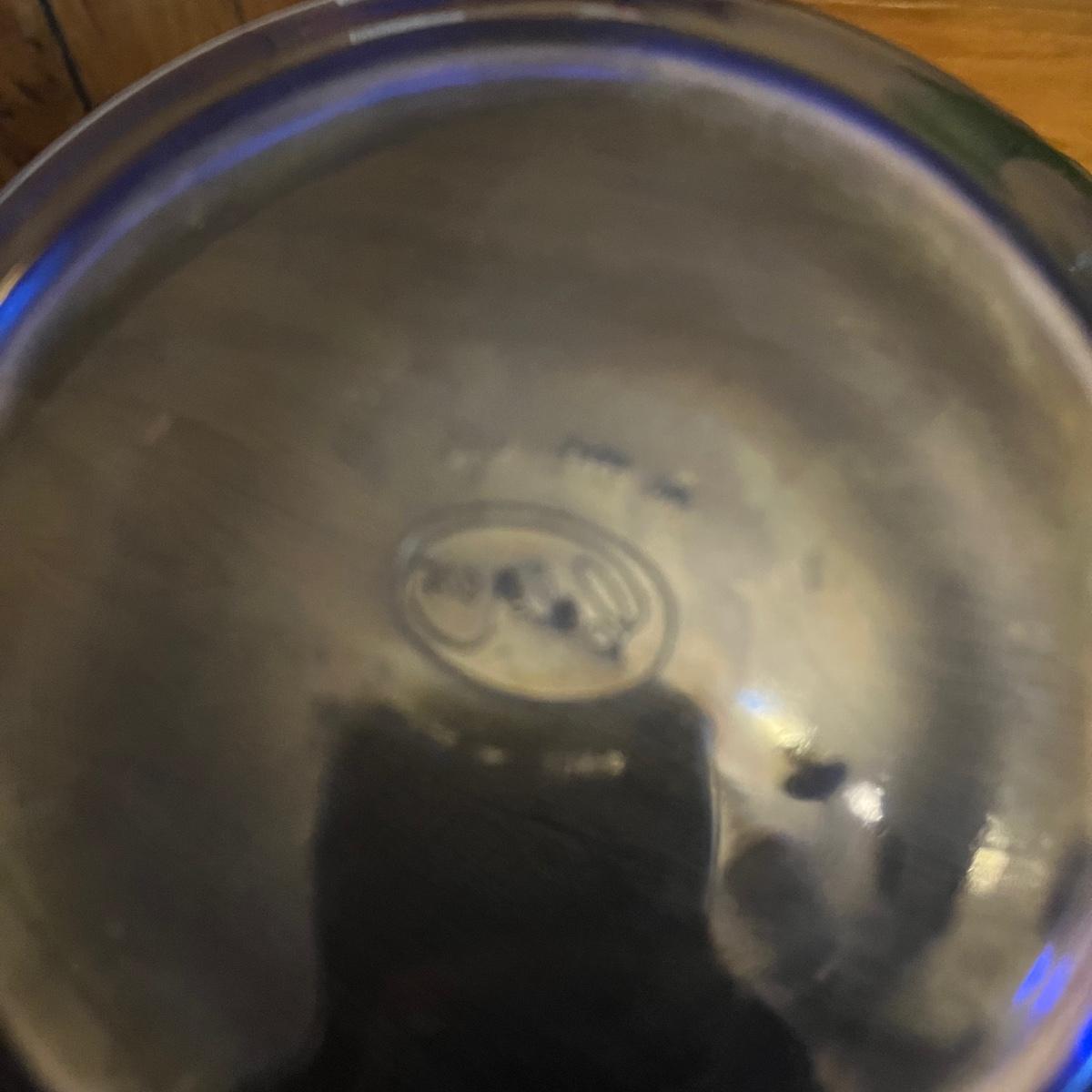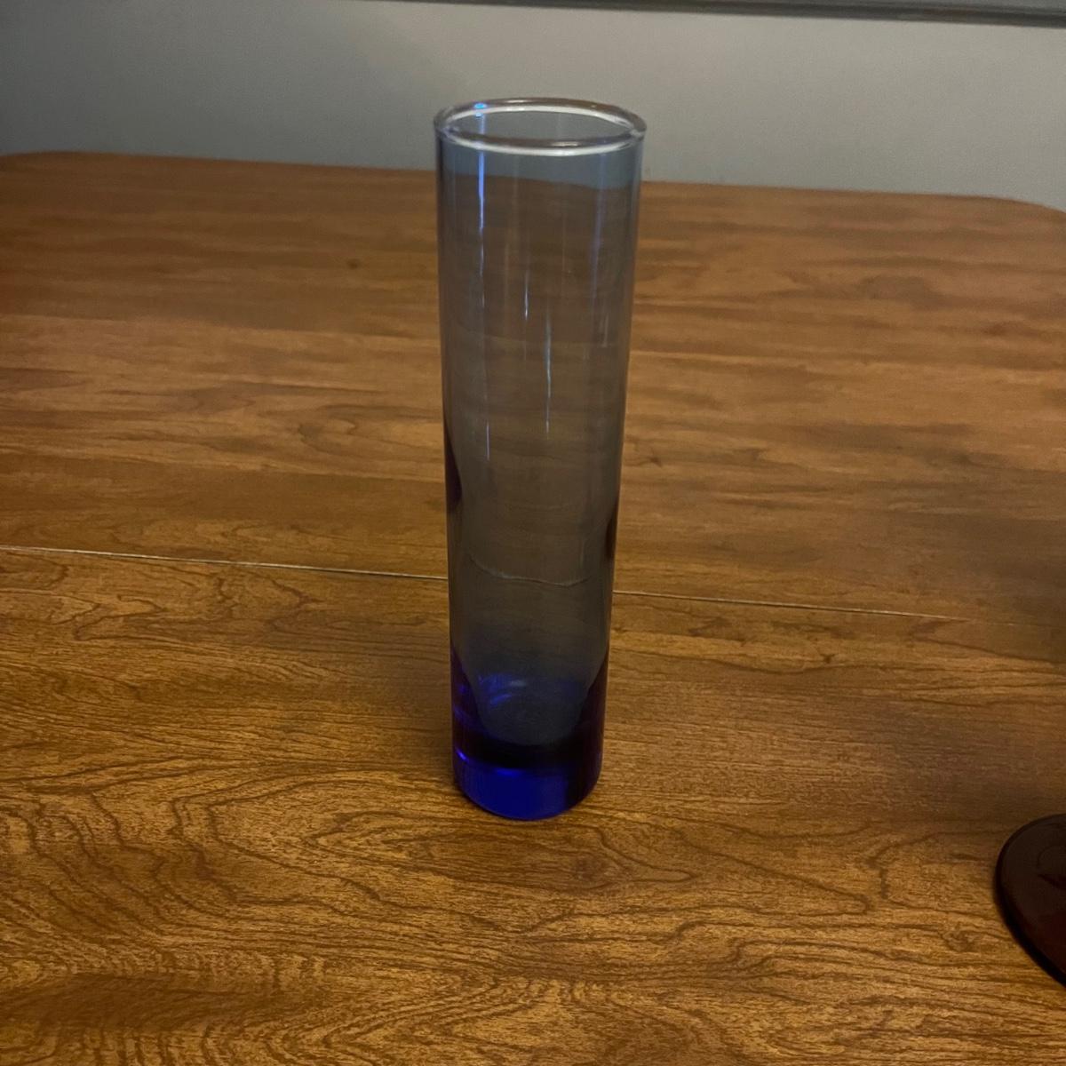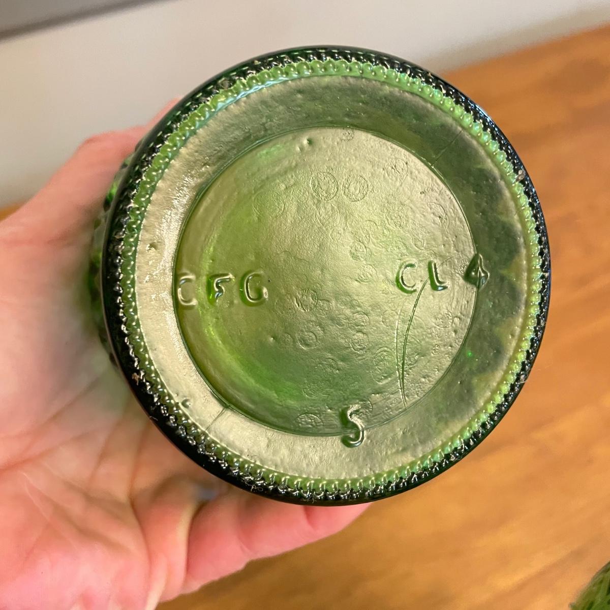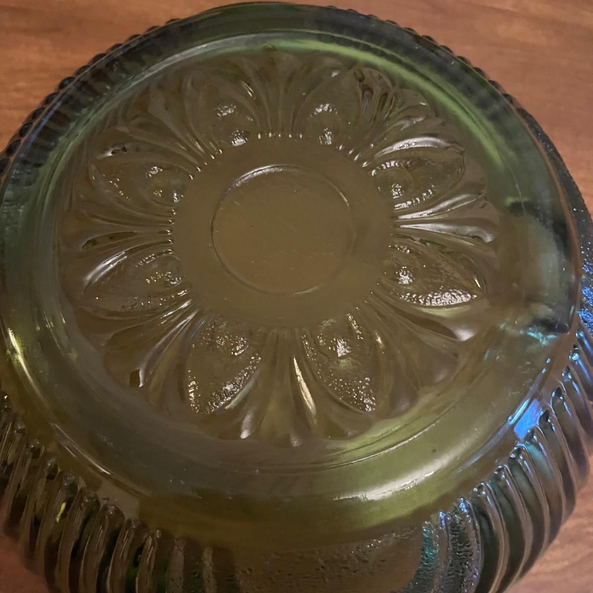 Amethyst 10.25” bud vase stamped Fenton, a 9.5”d x 2.5” Colorex serving bowl, a mix-textured green serving bowl, a large 10” Hoosier emerald green glass vase with diamond patterned and a smaller stamped vase. Lot also contains a sapphire bud vase with a bright base. See images. Shipping available.