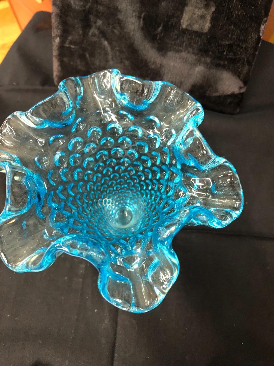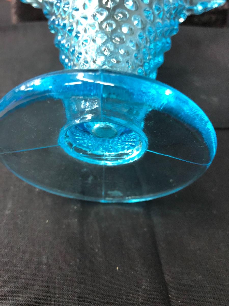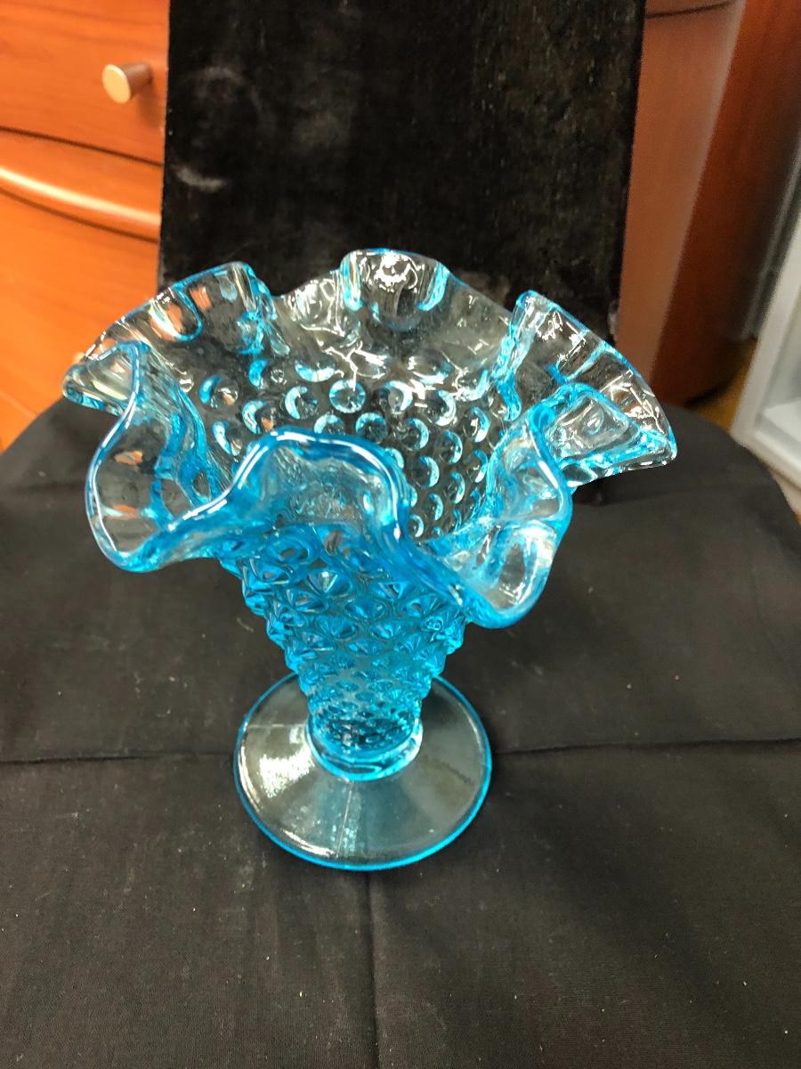 Another gorgeous iridescent baby blue piece with hobnail pattern. It is ruffled at top and measures 6”