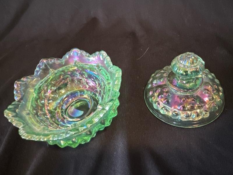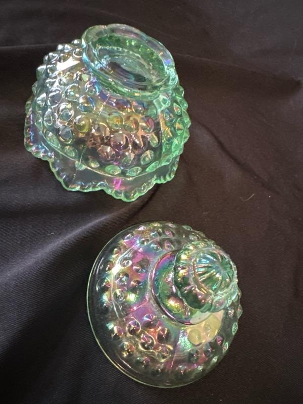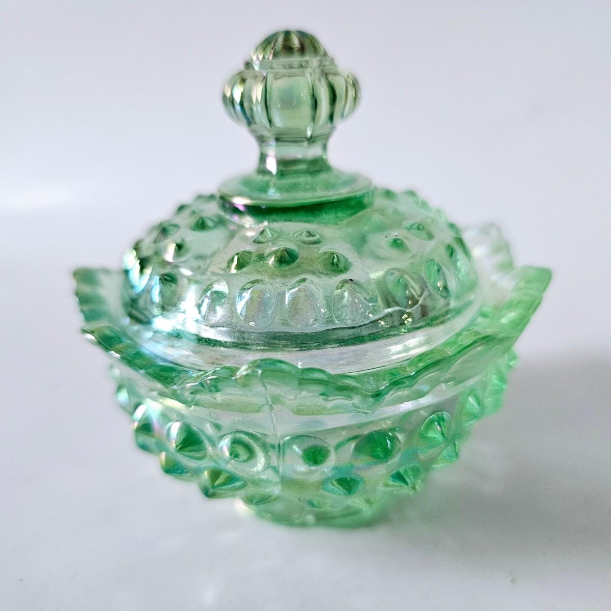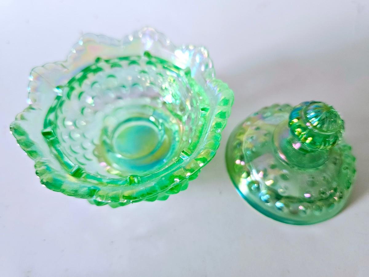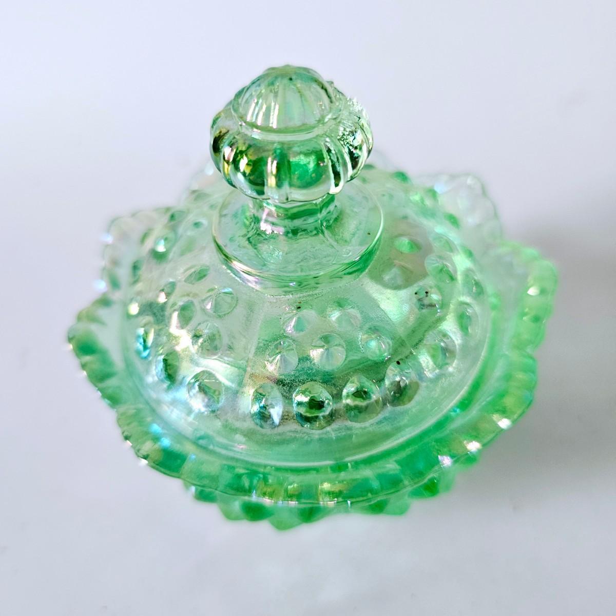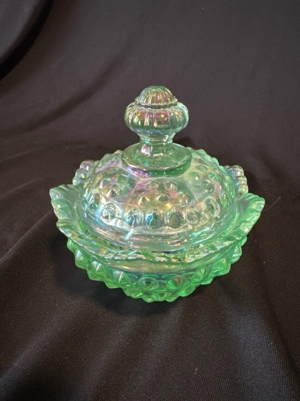 Green iridescent hobnail Fenton bowl with lid, very good condition. Fenton can be seen stamped into the glass on lid and bowl. Sticker on inside.