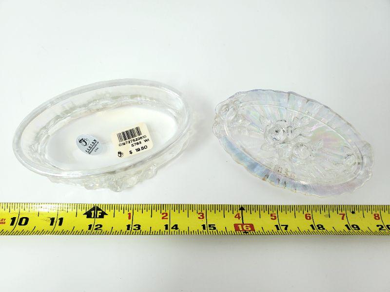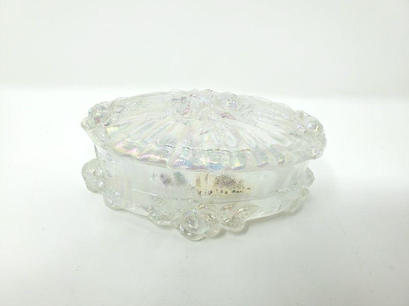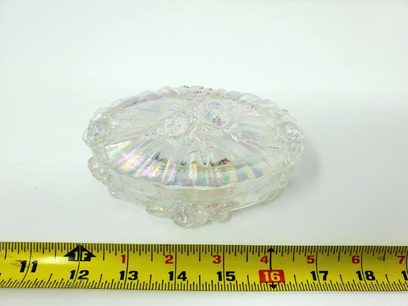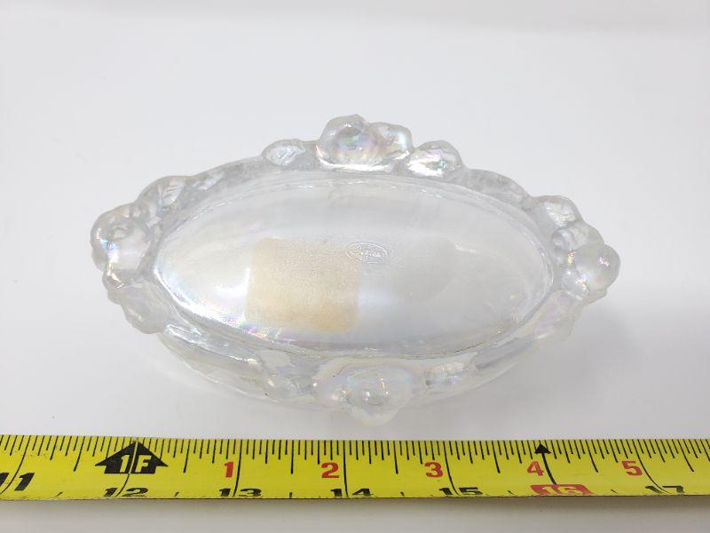 This Fenton piece would be perfect for any vanity, iridescent in color and adorned with roses. No chips, cracks or breaks, seems to be in very good condition with stickers attached on inside of dish.