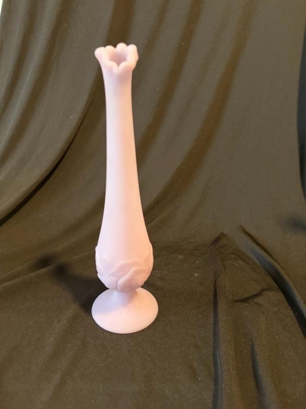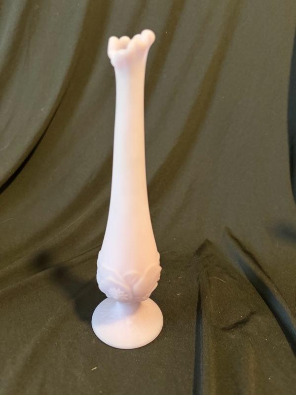 Fenton art glass lavender light purple satin Raised Water Lilly bud vase. Fenton item number 8456 BA. Made in 1978 To 1982 Approximately 10” tall . No chips or cracks.