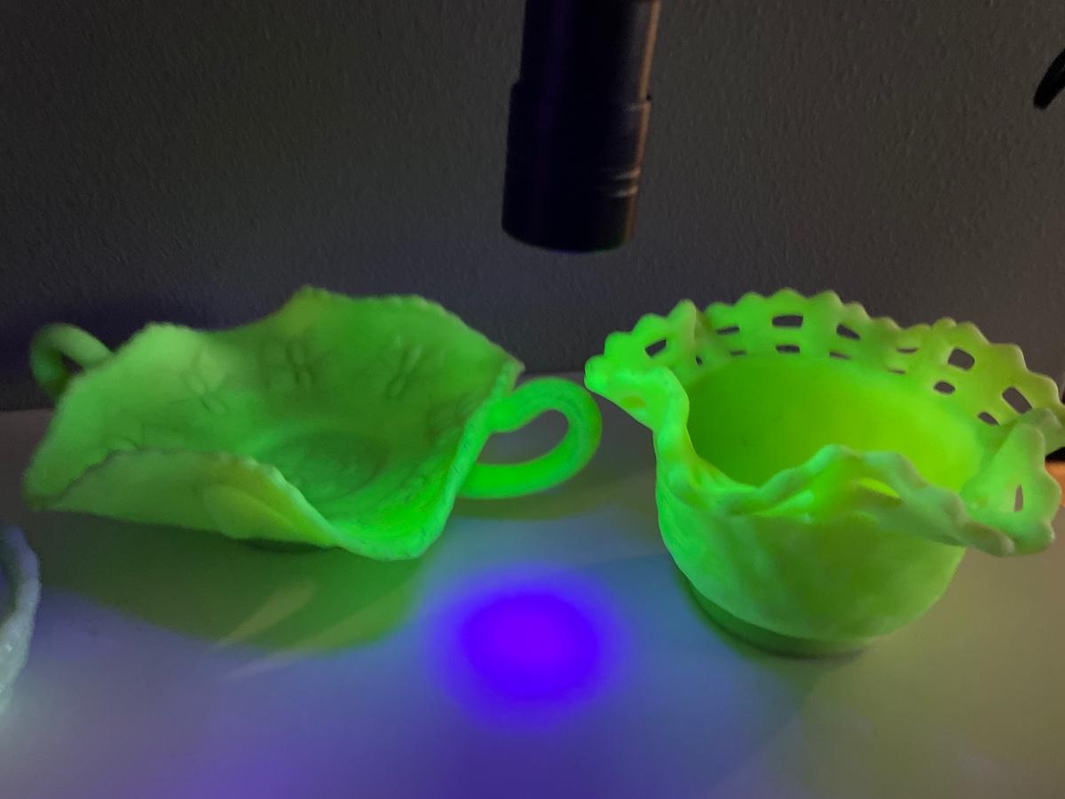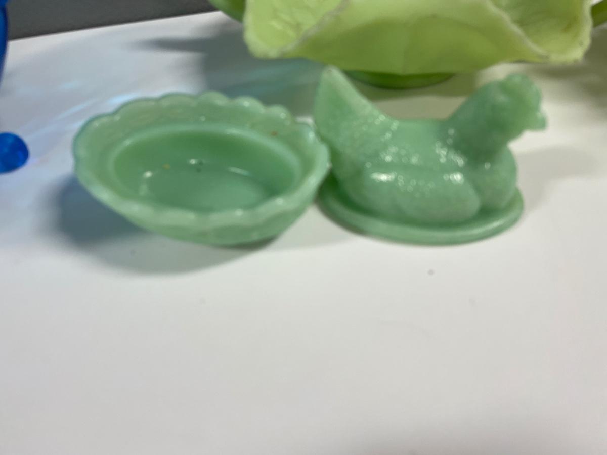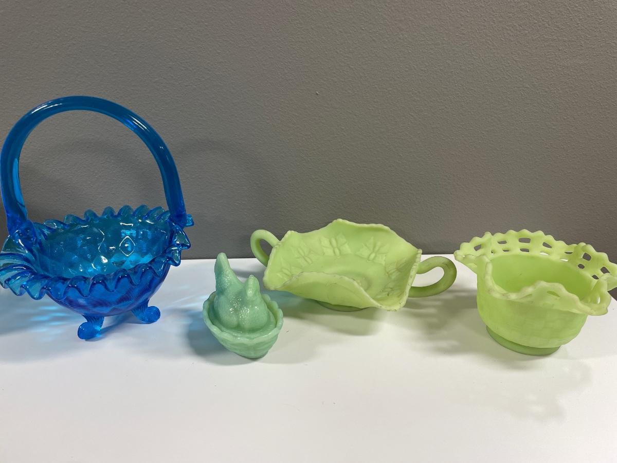 Fenton lime green satin glass, rooster and blue Fenton basket
