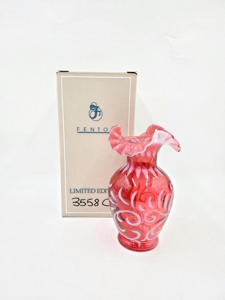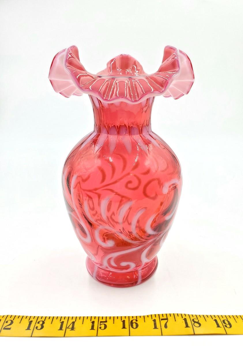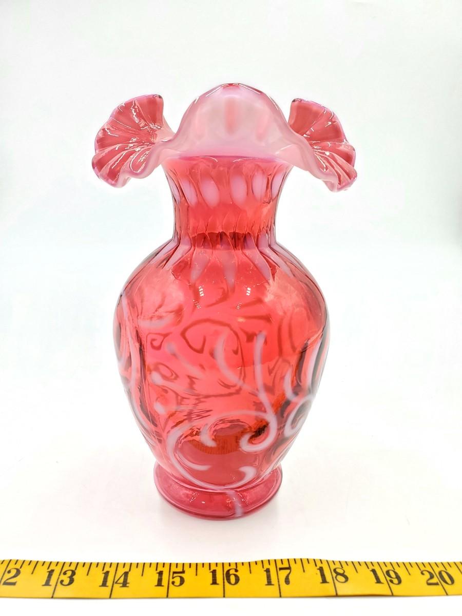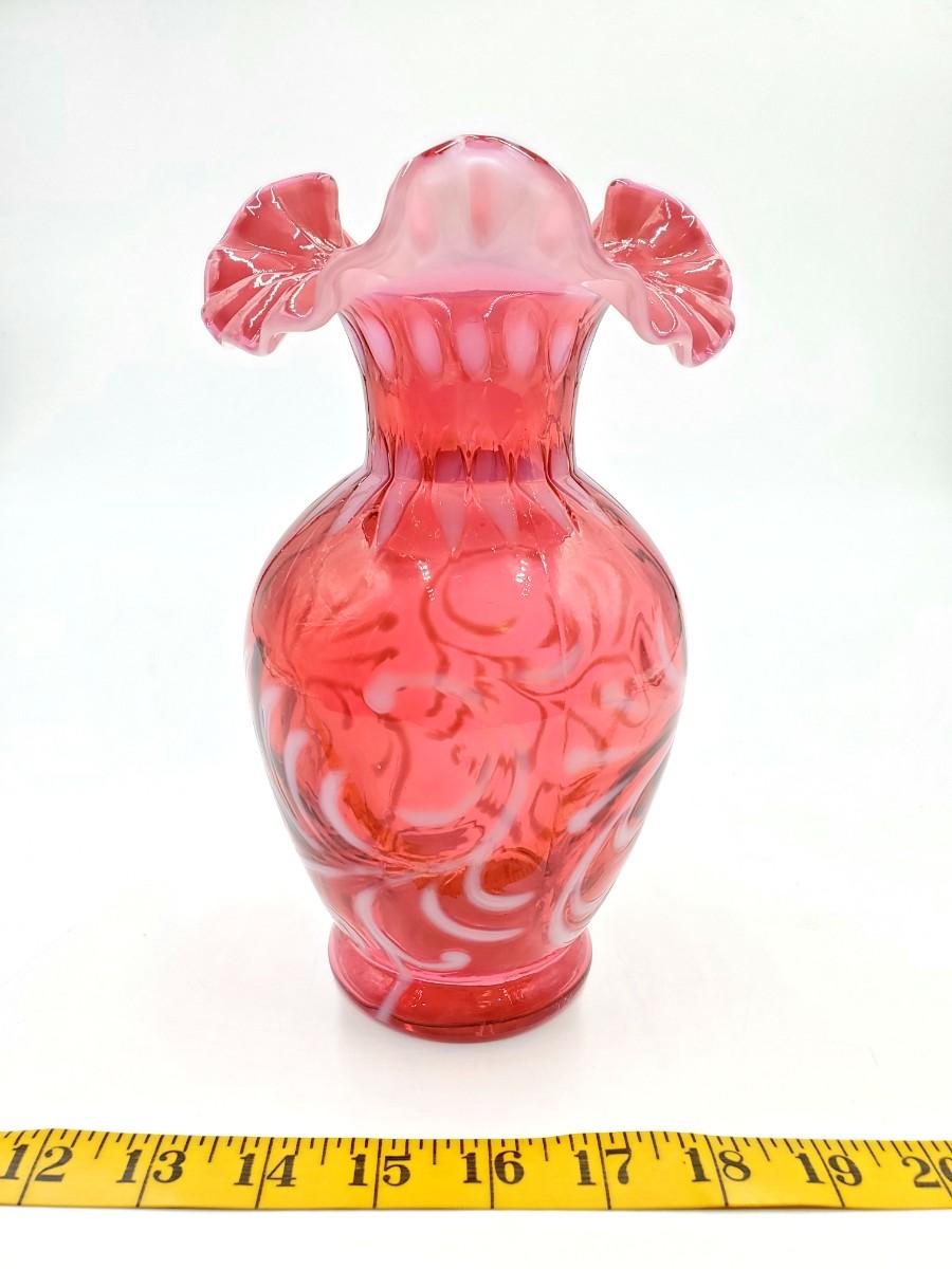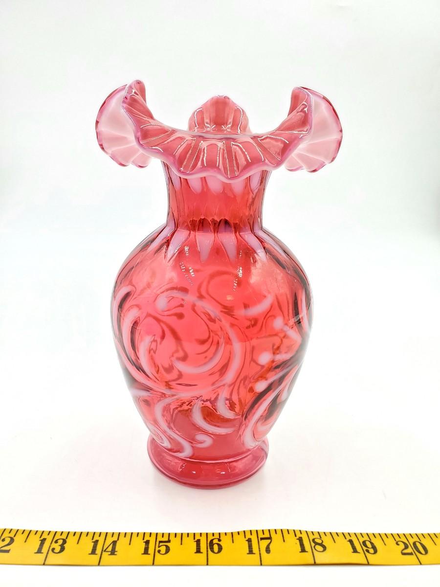 Fenton Cranberry vase with a gorgeous swirled design and ruffled top is in very good condition. Bottom is signed with George W Fenton, #660, 1995. Original box included, does have writing on the front but the box is in good shape otherwise. August 01 1995 is stamped on inside of box lid, also attached is an envelope with a card...it is stuck to the box and I was unable to get it out without possibly ripping the paper and or card so I did not try to remove it.