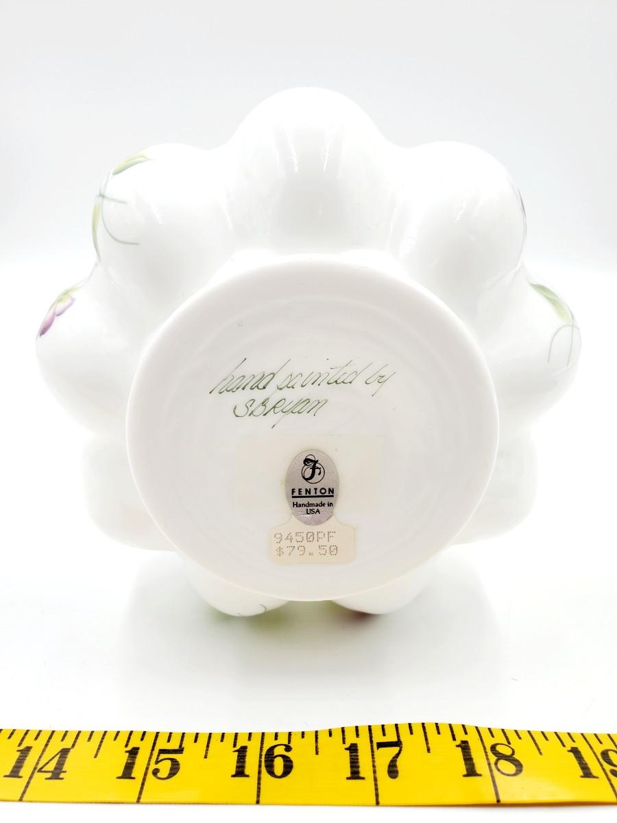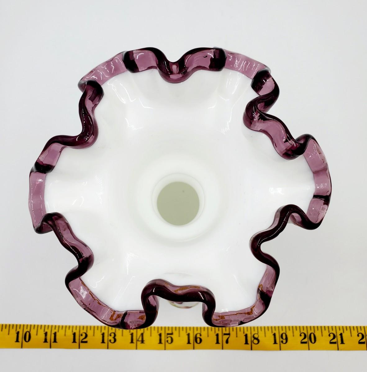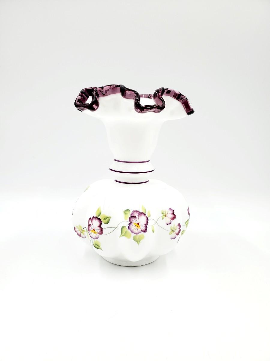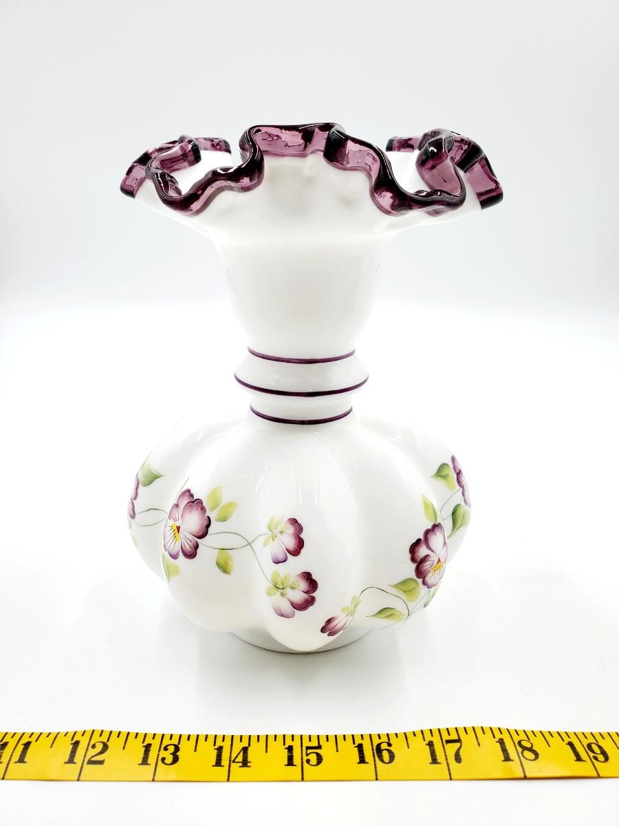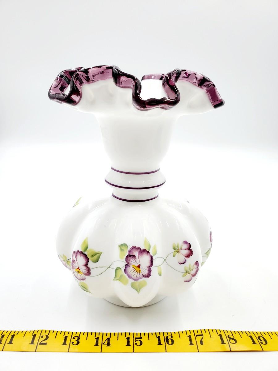 FENTON MELON MILK GLASS HAND PAINTED PANSIES RUFFLED PLUM CREST VASE