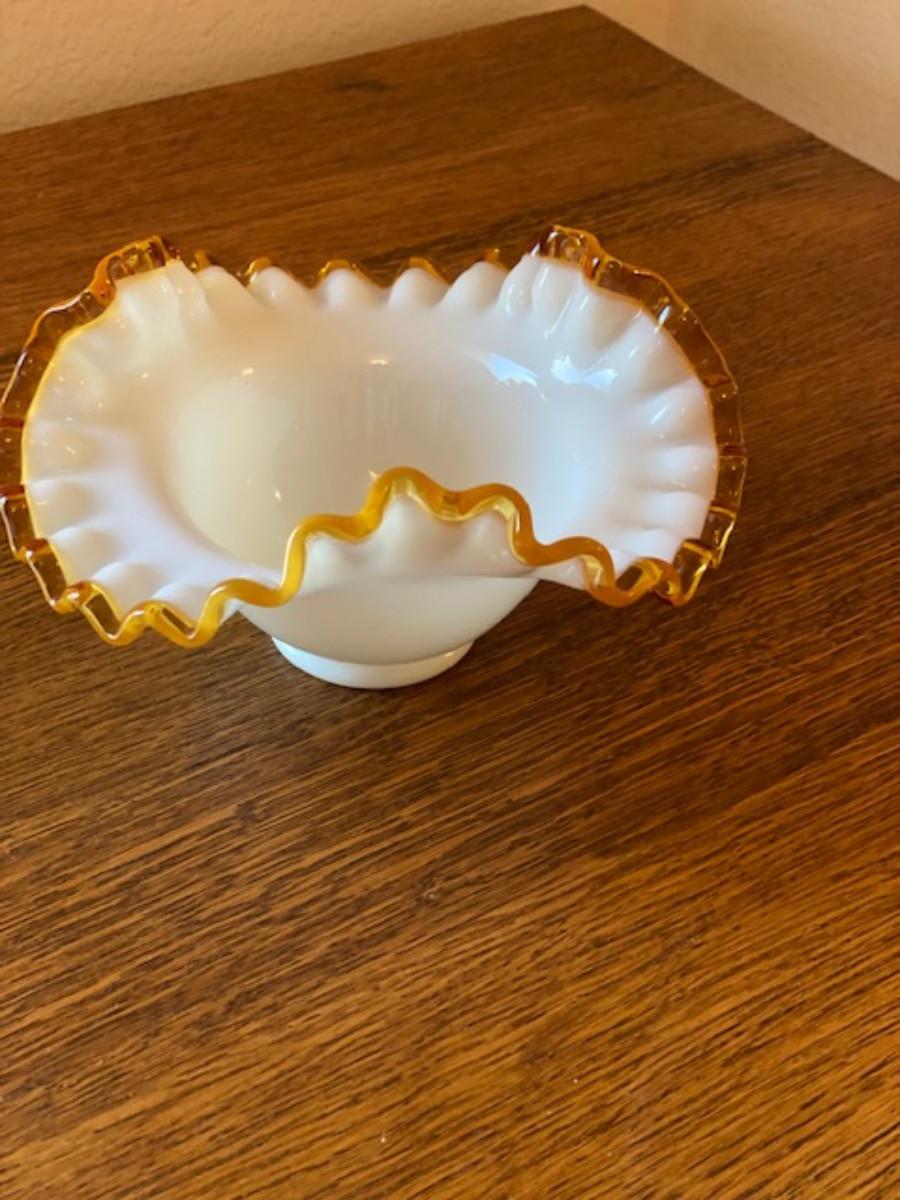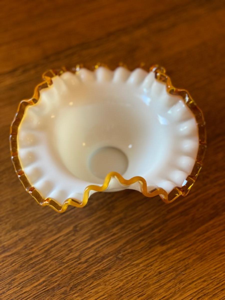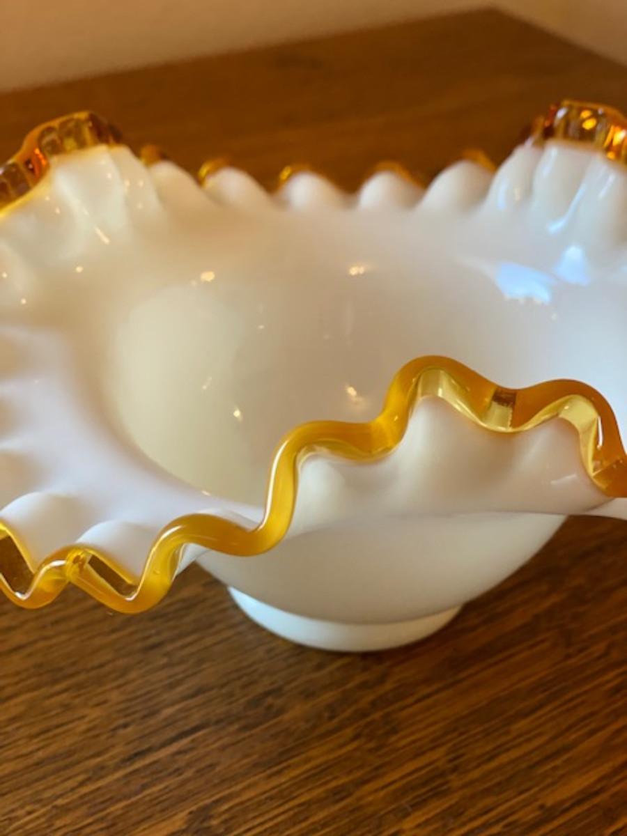 Fenton Milk Glass Gold Amber Cret Ruffled Bowl 7"