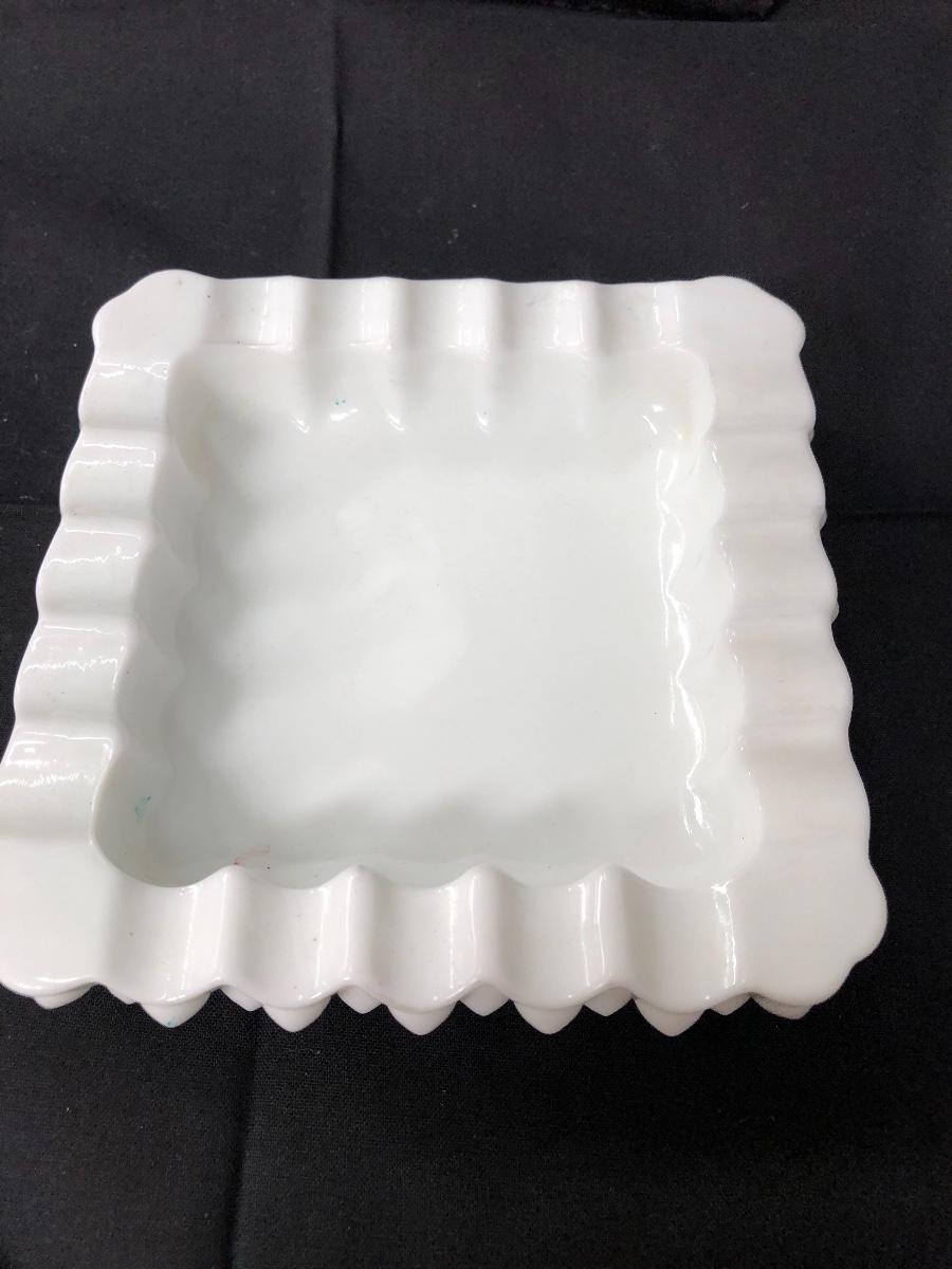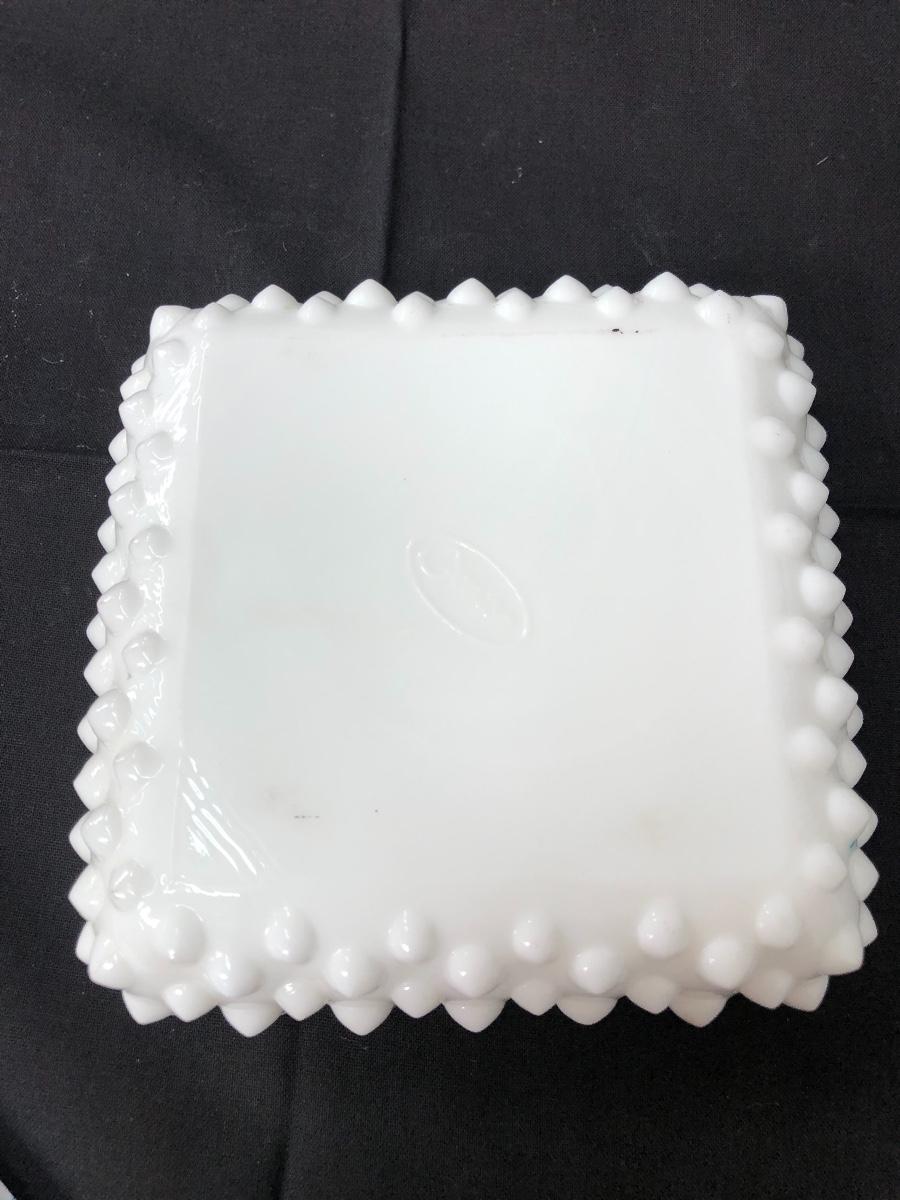 This is a very unique milk glass piece in the traditional hobnail. Measures 5” across
