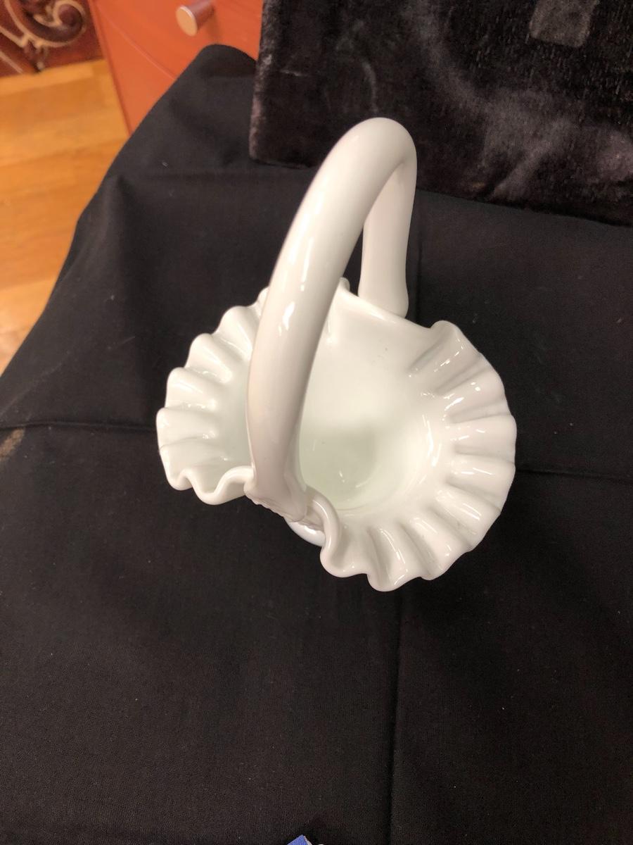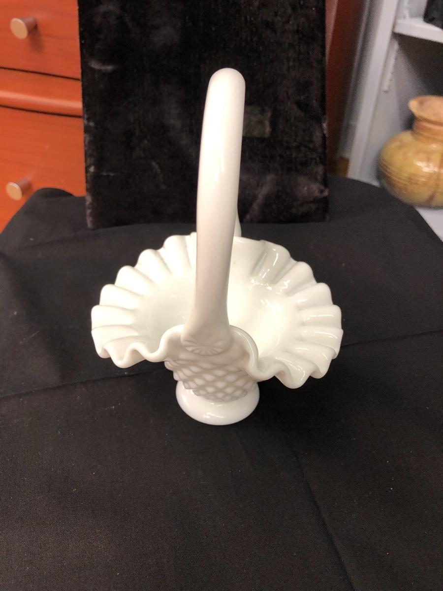 This is a nice small milk glass basket in the classic hobnail pattern. Measure ls 6.5”