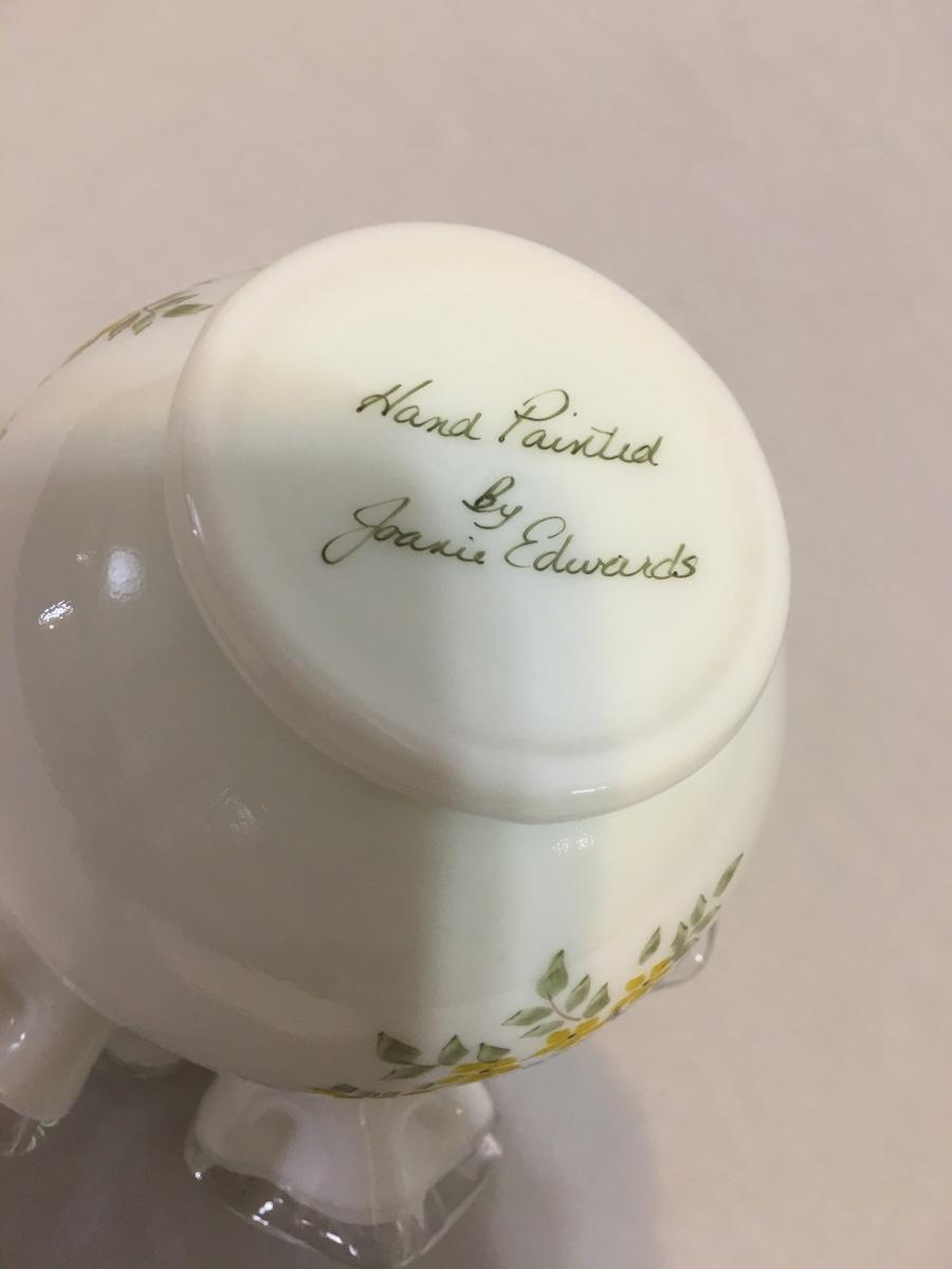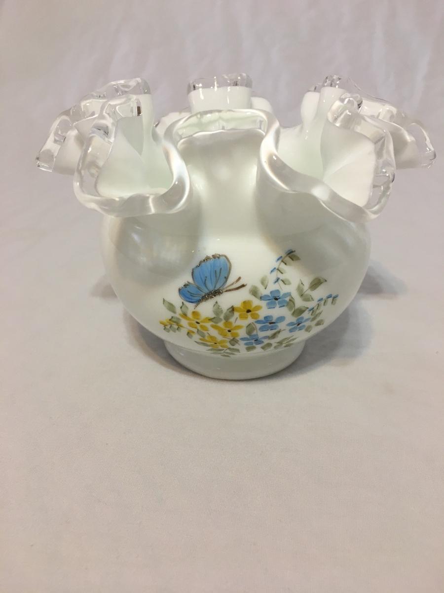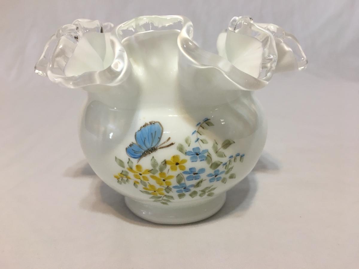 Fenton Milk Glass Silver Crest BUTTERFLY FLOWERS Hand Painted Vase Signed
