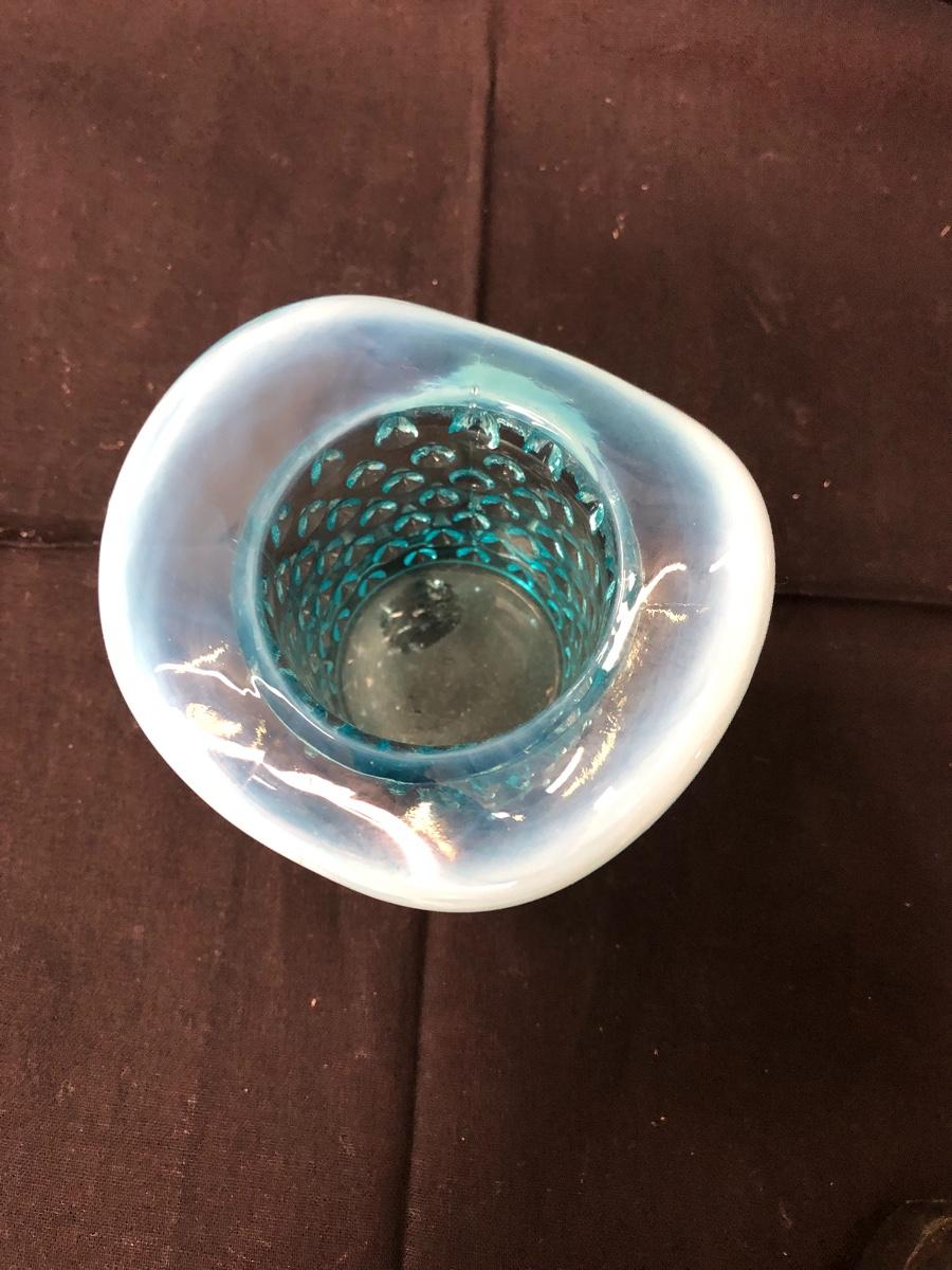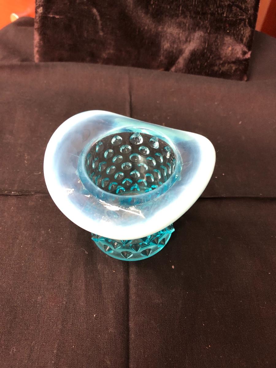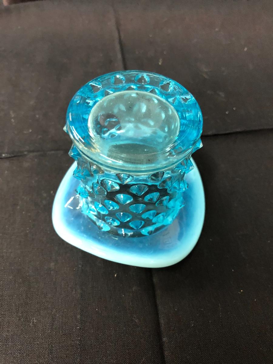 This is a sweet toothpick holder in opalescent blue hobnail. Measures 3”