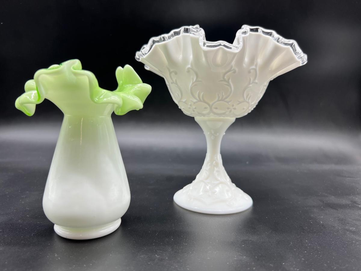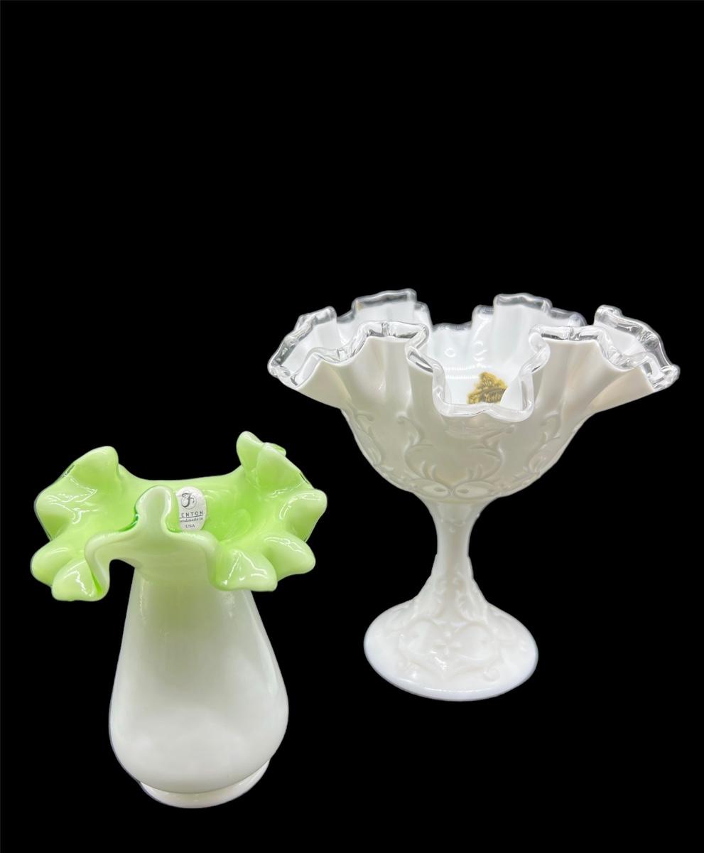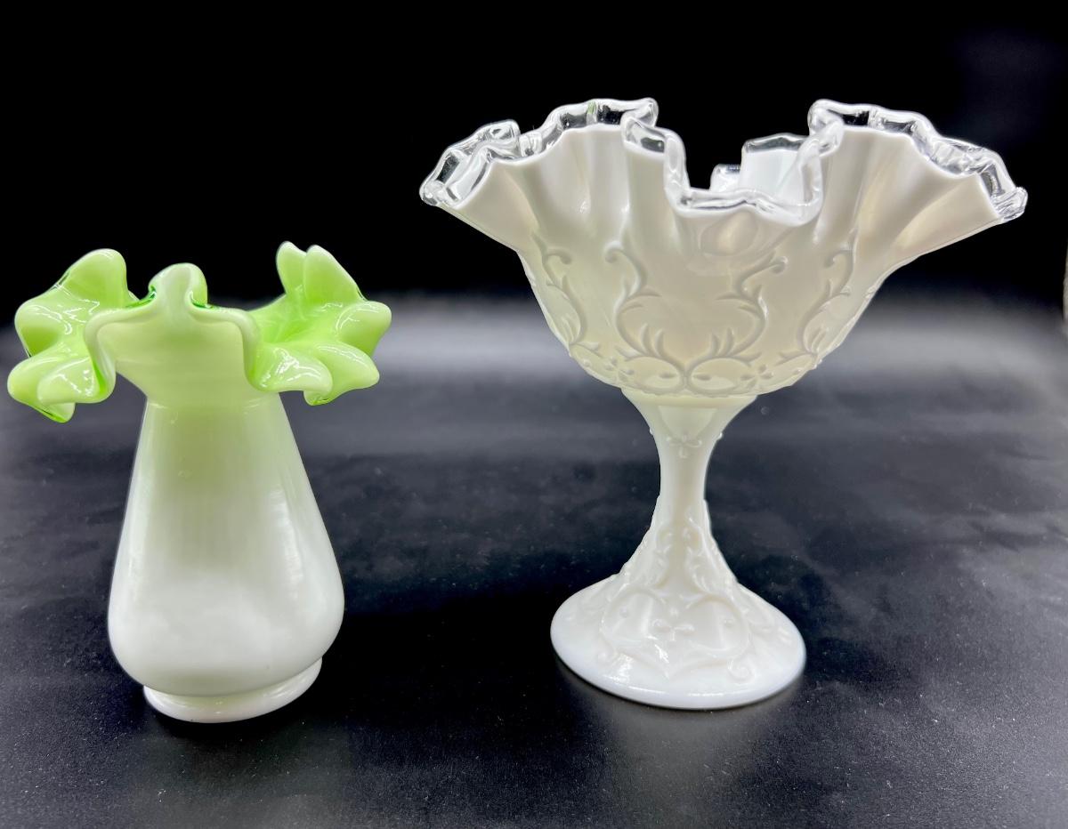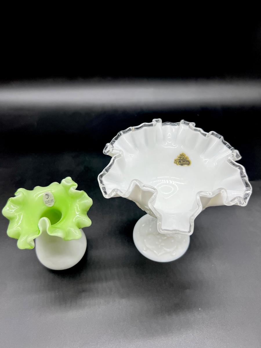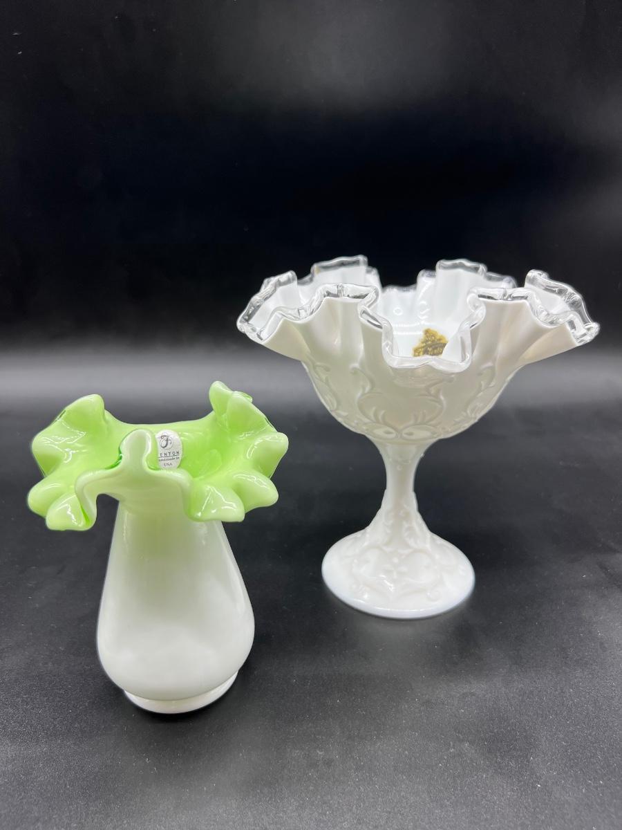 Two pieces of Fenton. White Silver Crest Spanish Lace milk glass Compote candy dish. Measures 7 inches tall and 7 inches at the top round. Crimped Ruffled Milk Glass Vase white and green measures 5 inches tall and 4 inches at the top round.
