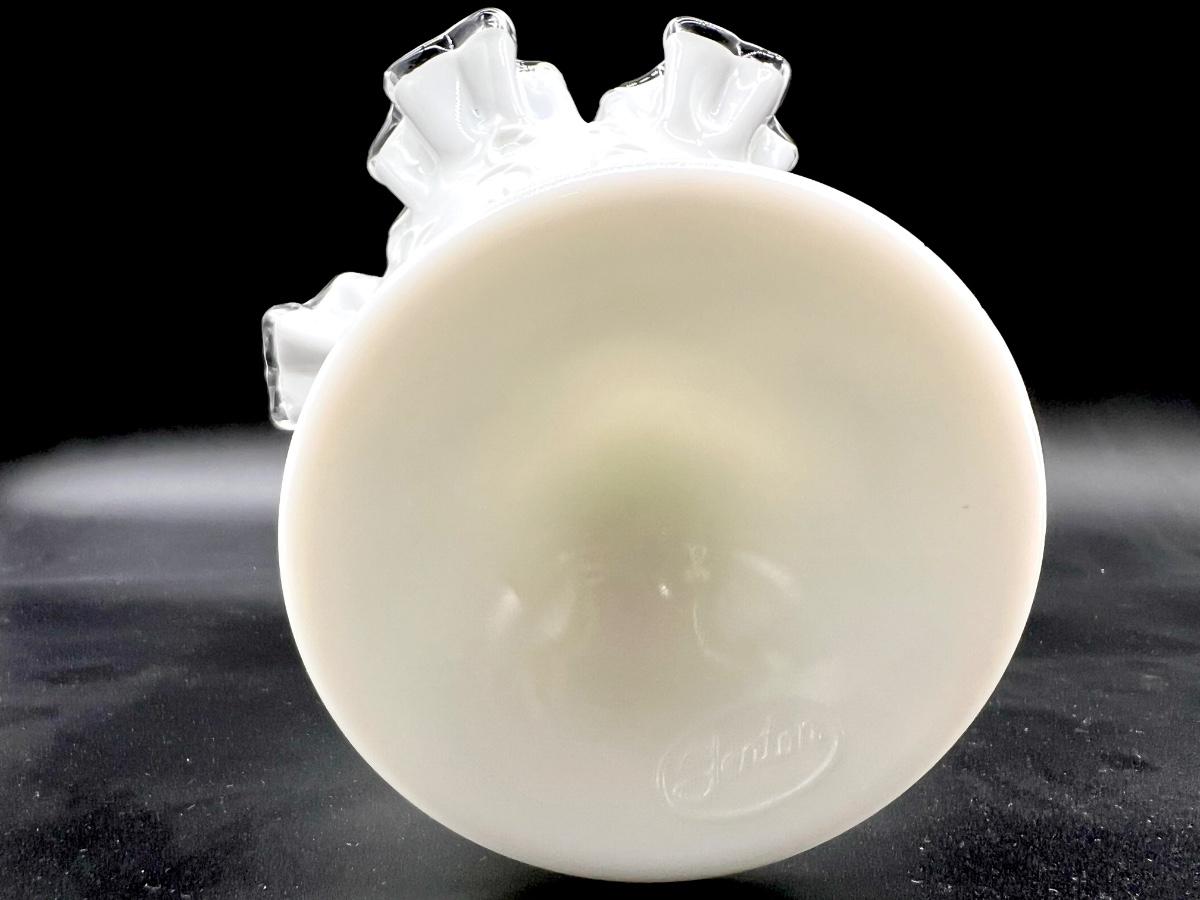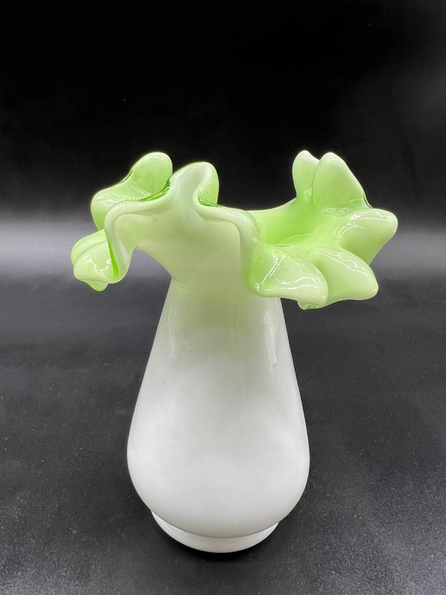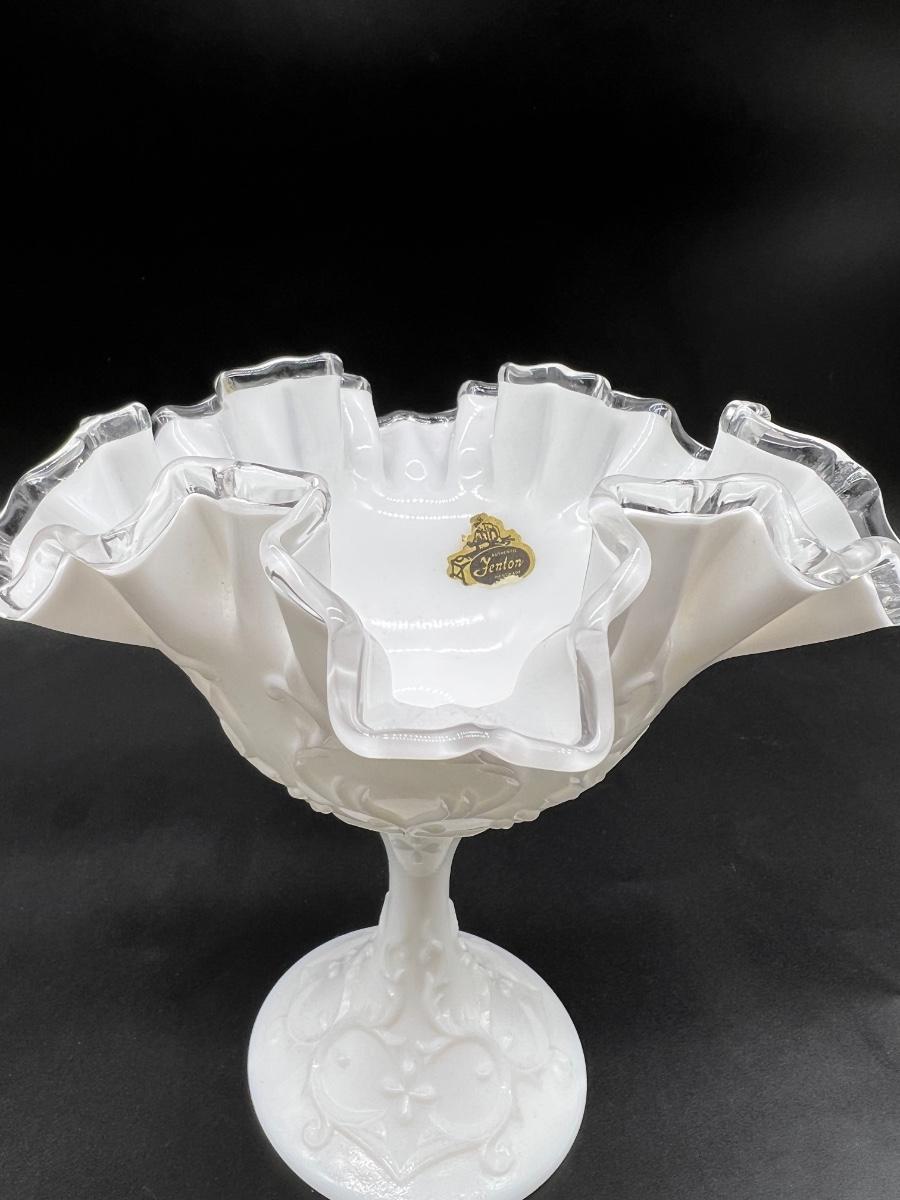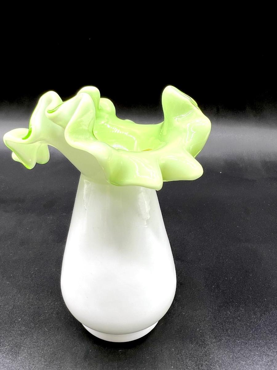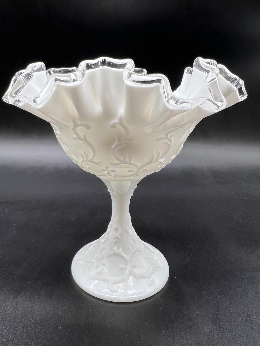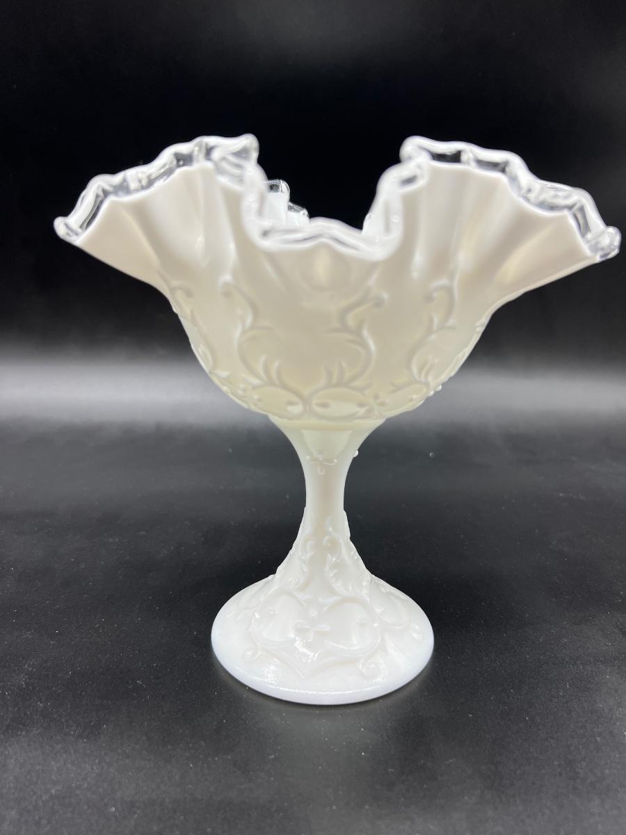 Two pieces of Fenton. White Silver Crest Spanish Lace milk glass Compote candy dish. Measures 7 inches tall and 7 inches at the top round. Crimped Ruffled Milk Glass Vase white and green measures 5 inches tall and 4 inches at the top round.
