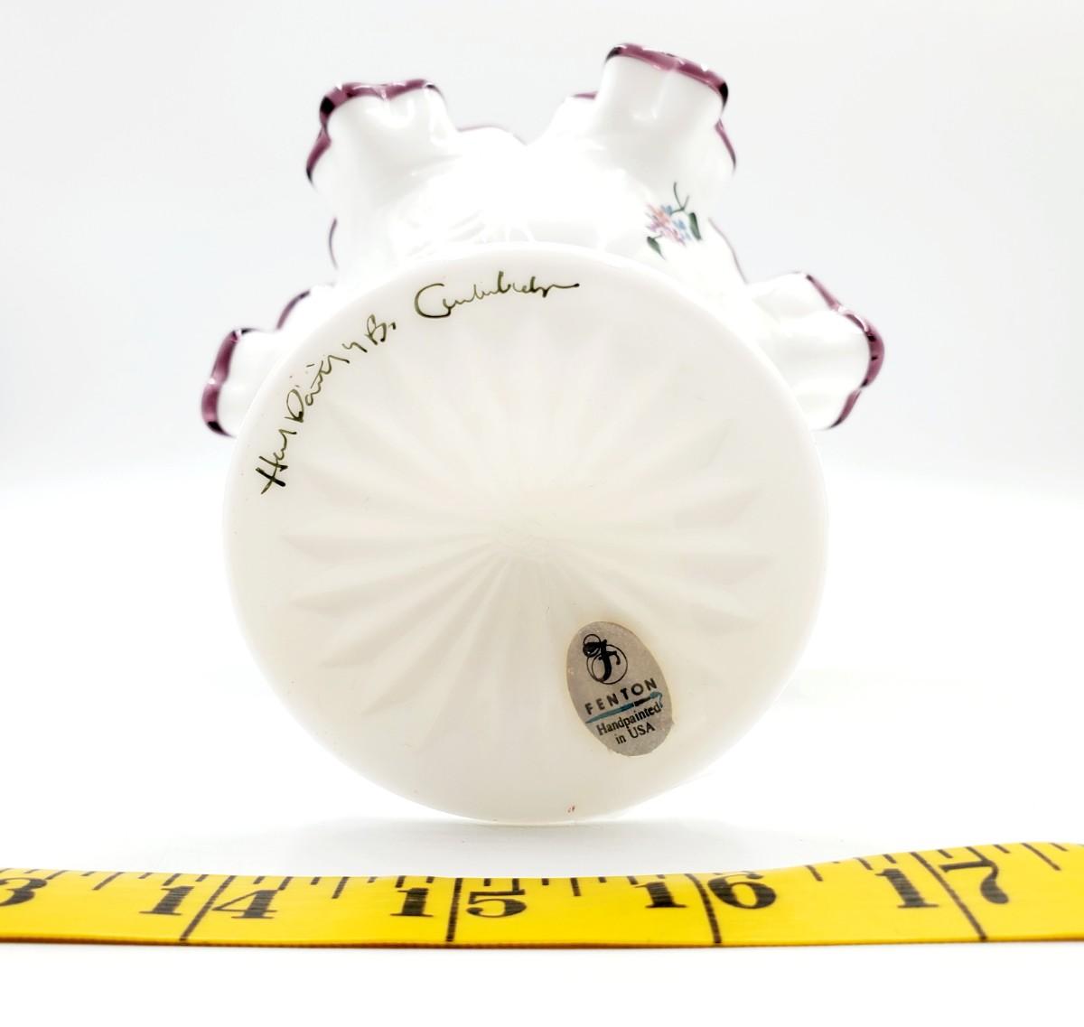 Fenton white milk glass hand painted lilacs, signed. Very good condition, despite Fenton sticker being taped back on with scotch tape.