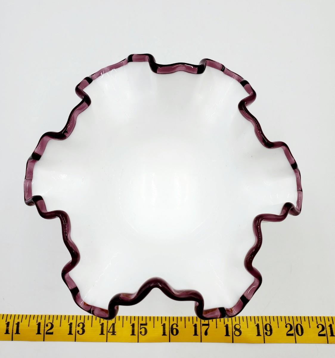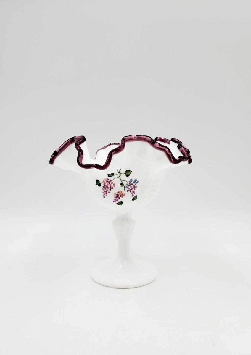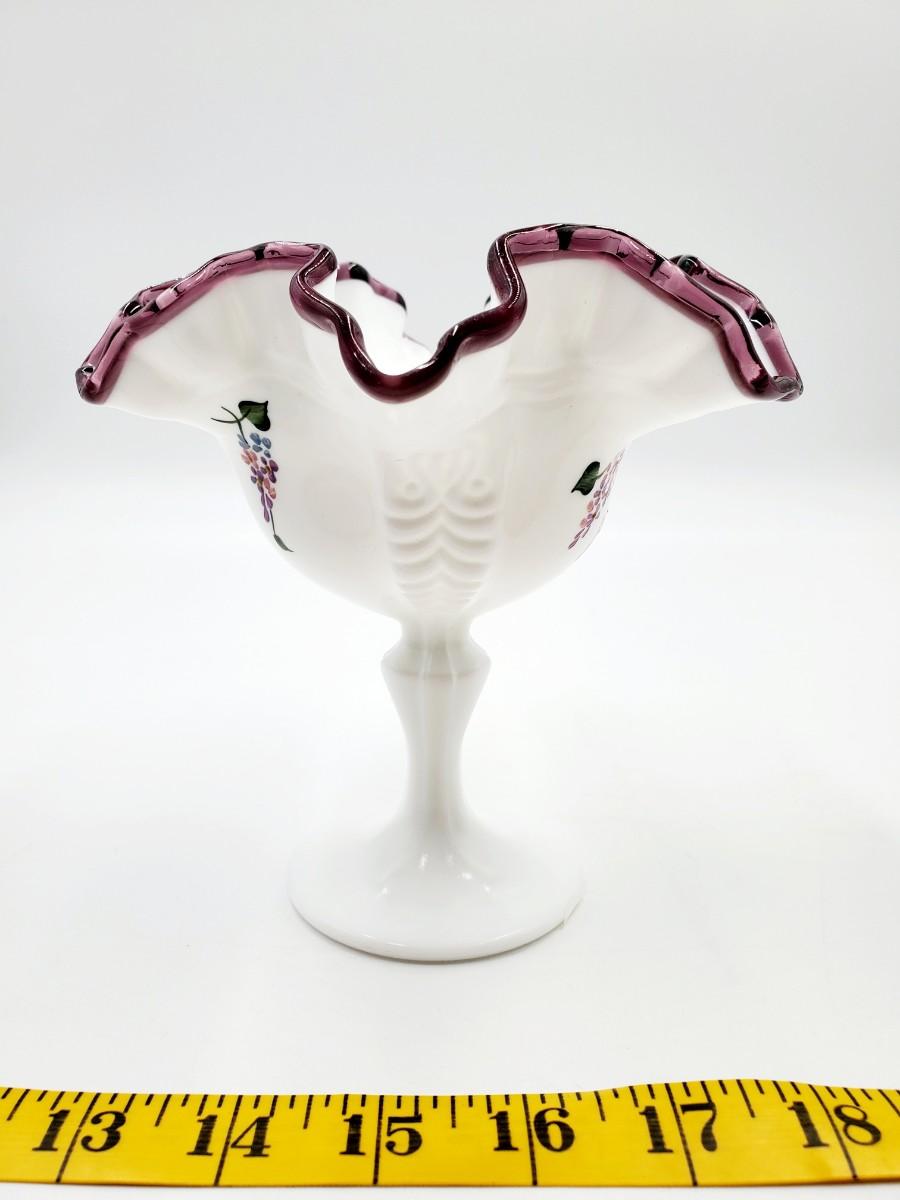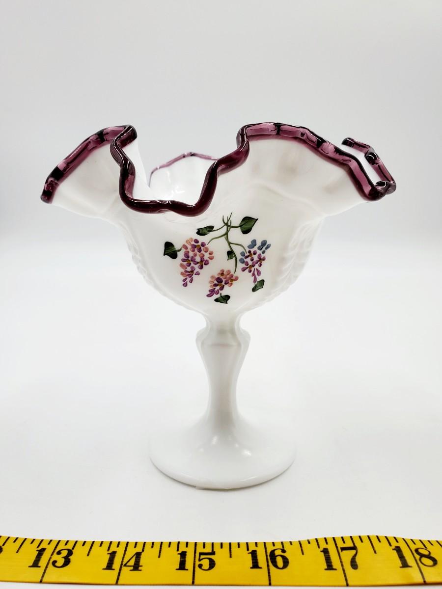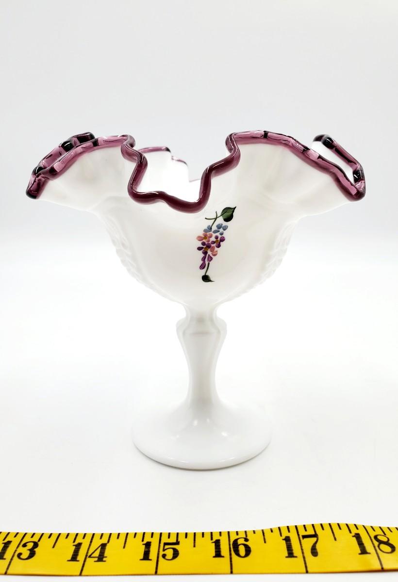 FENTON PEDESTAL WHITE MILK GLASS HAND PAINTED LILAC PLUM CREST COMPOTE DISH