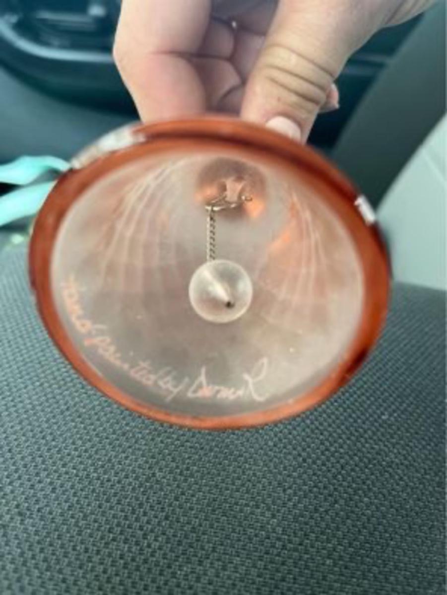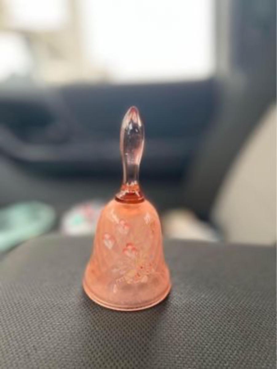 Vintage pink bell with hand painted floral details. Artist signature inside the bell. No chips or cracks.