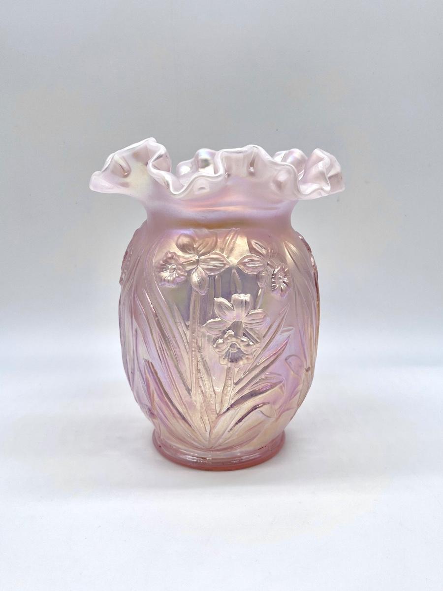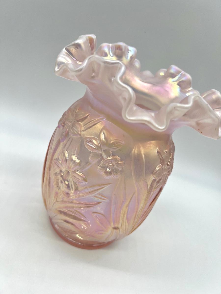 FENTON ~ Pink Chiffon Daffodils Iridescent Ruffle Top Vase