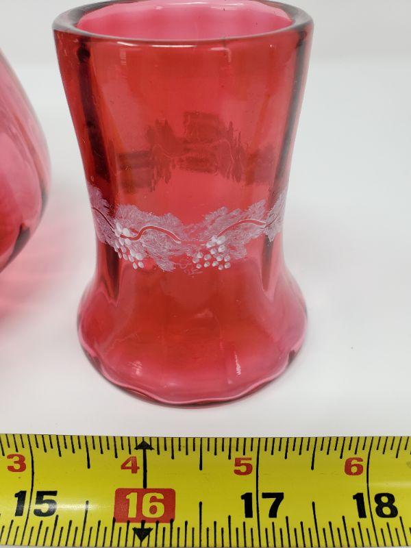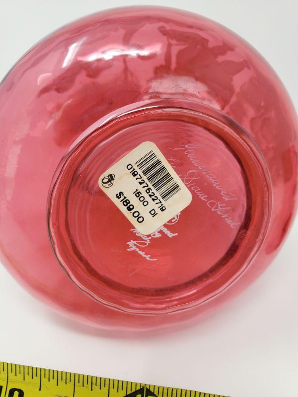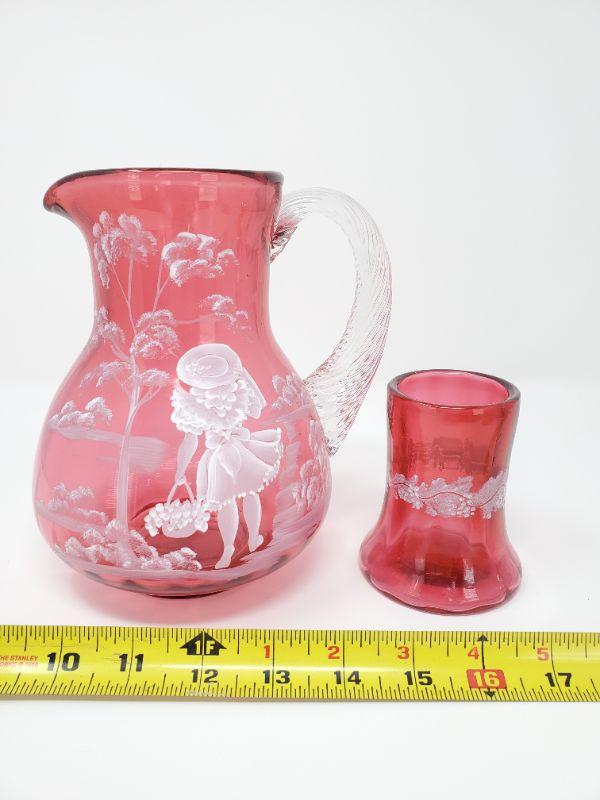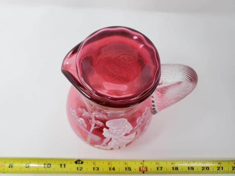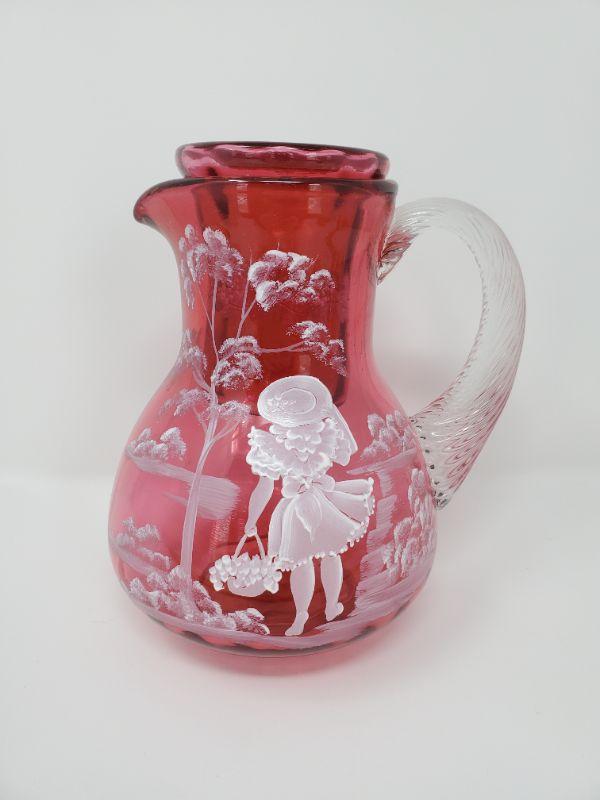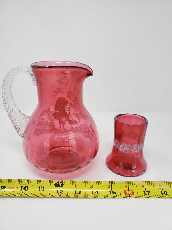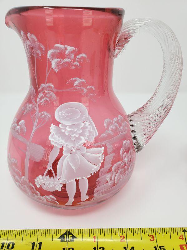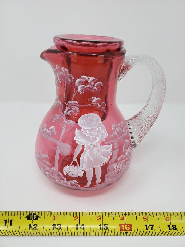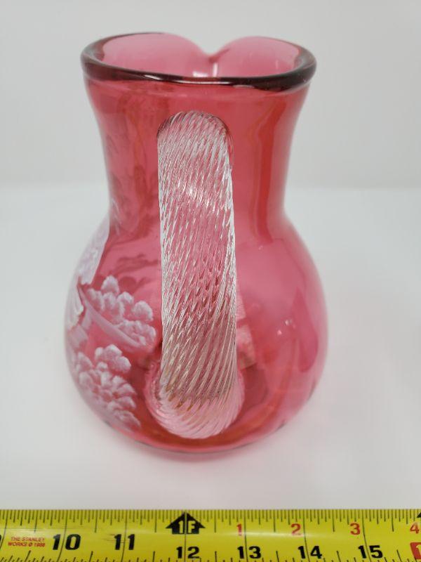 This gorgeous hand painted pitcher comes with a tumbler that is used as a lid. Signed on tumbler, and looks to be double stamped with Fenton in bottom of tumbler. Bottom of pitcher is signed, number with price sticker attached. This piece is in very good condition.