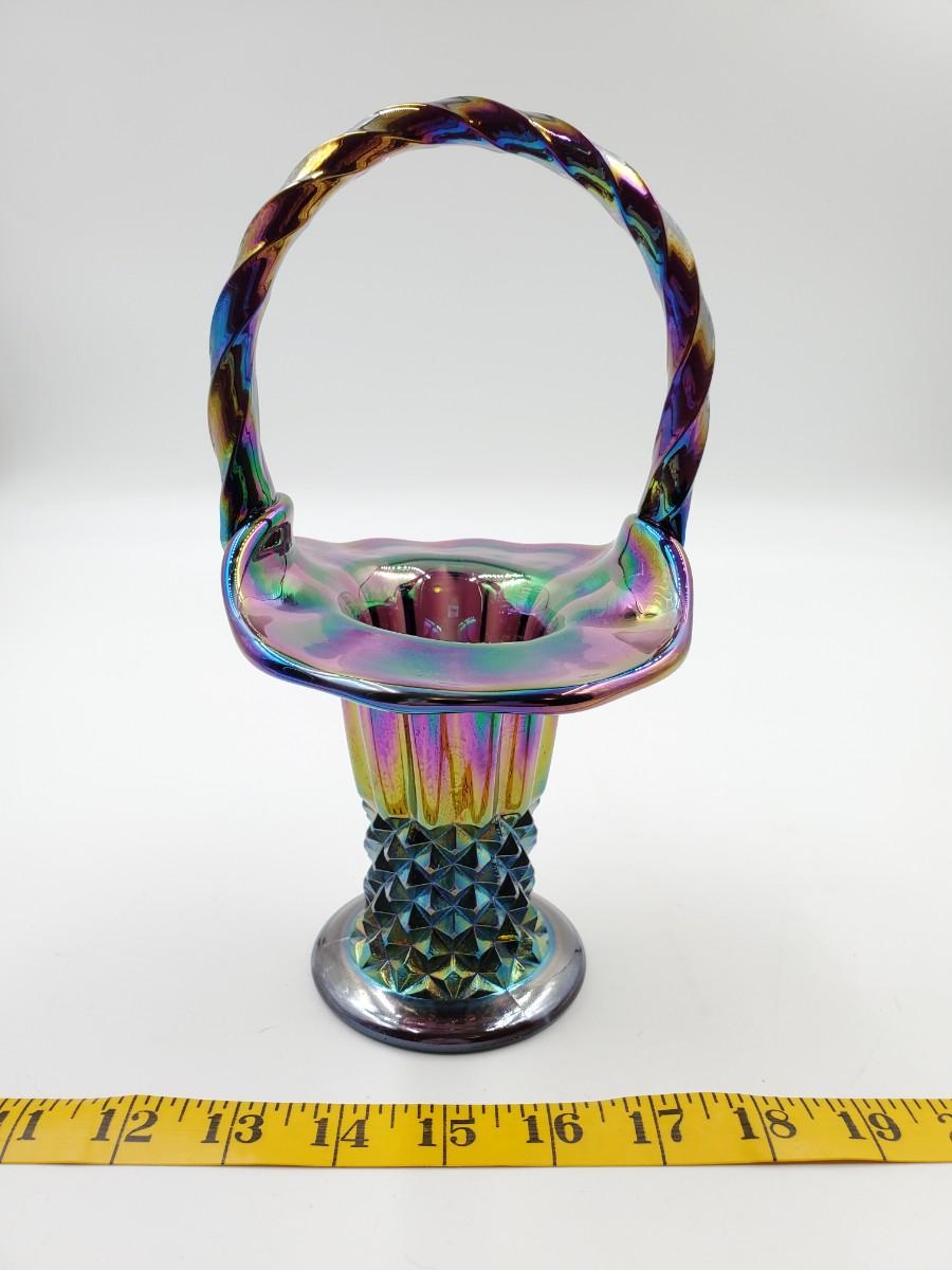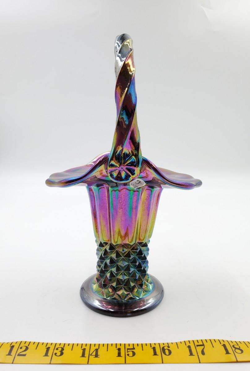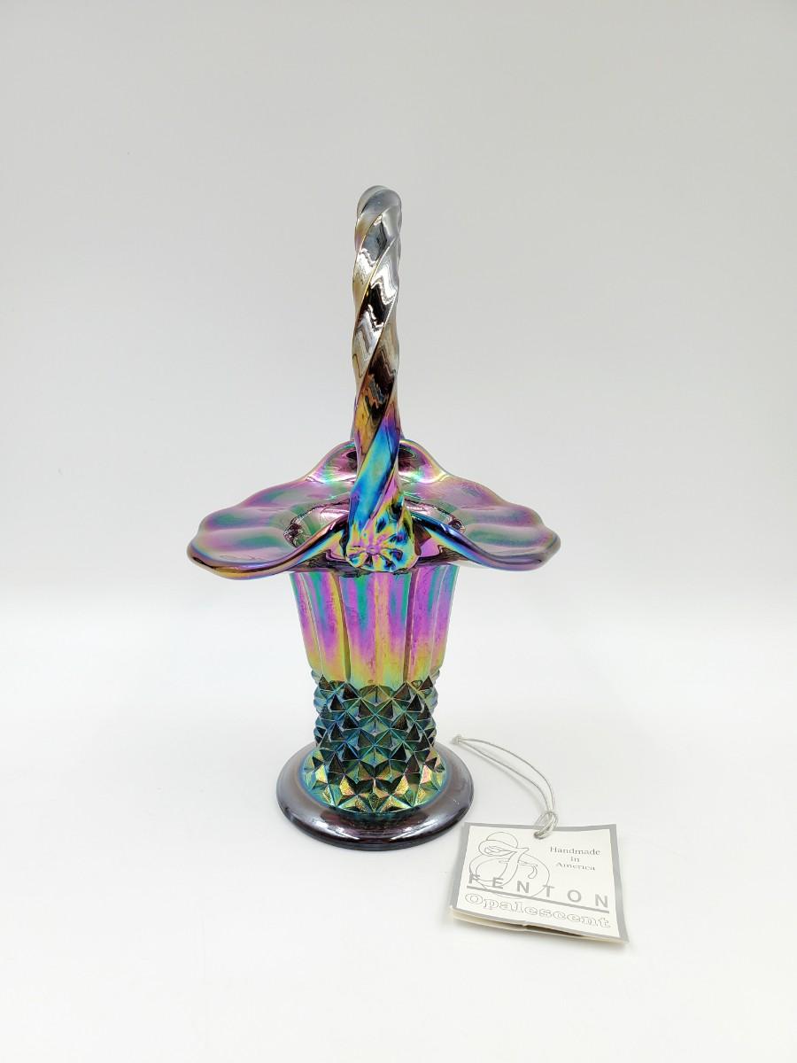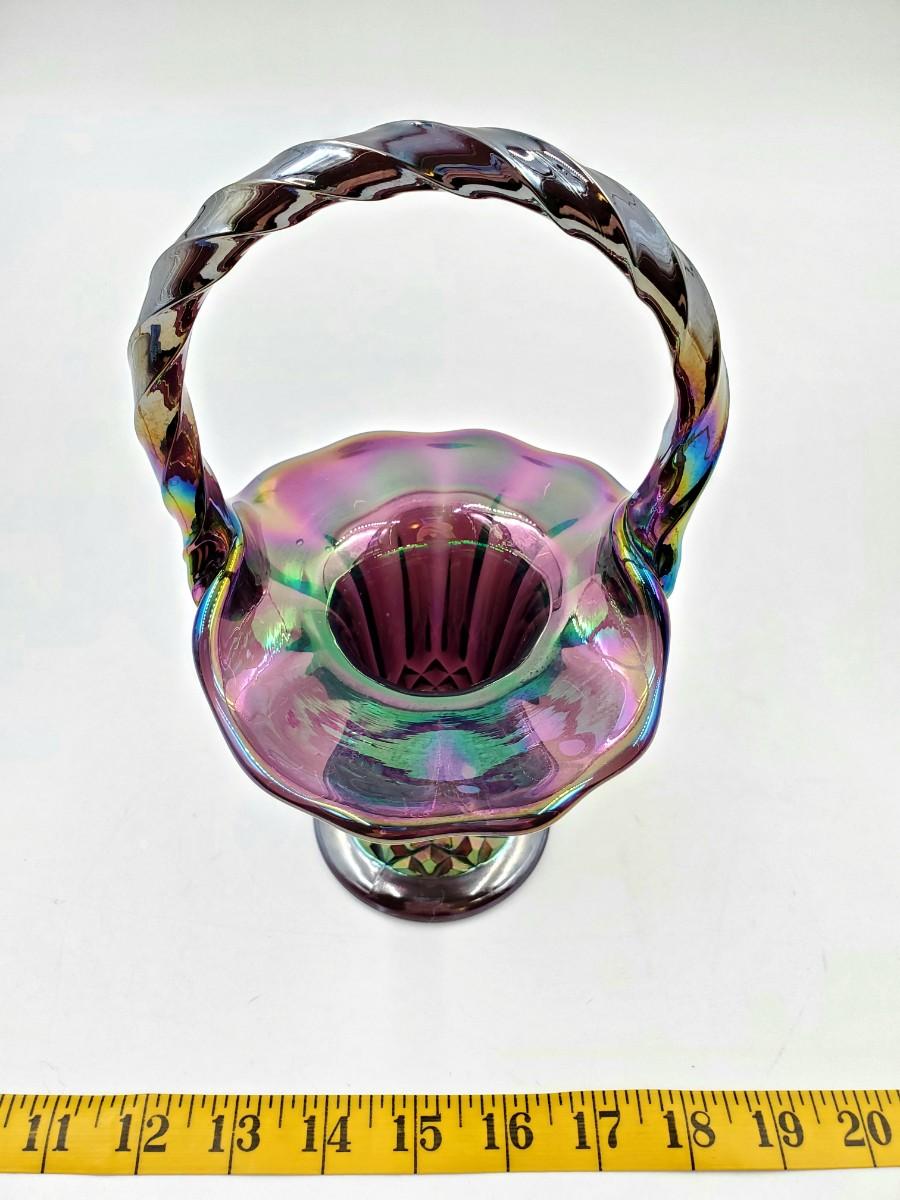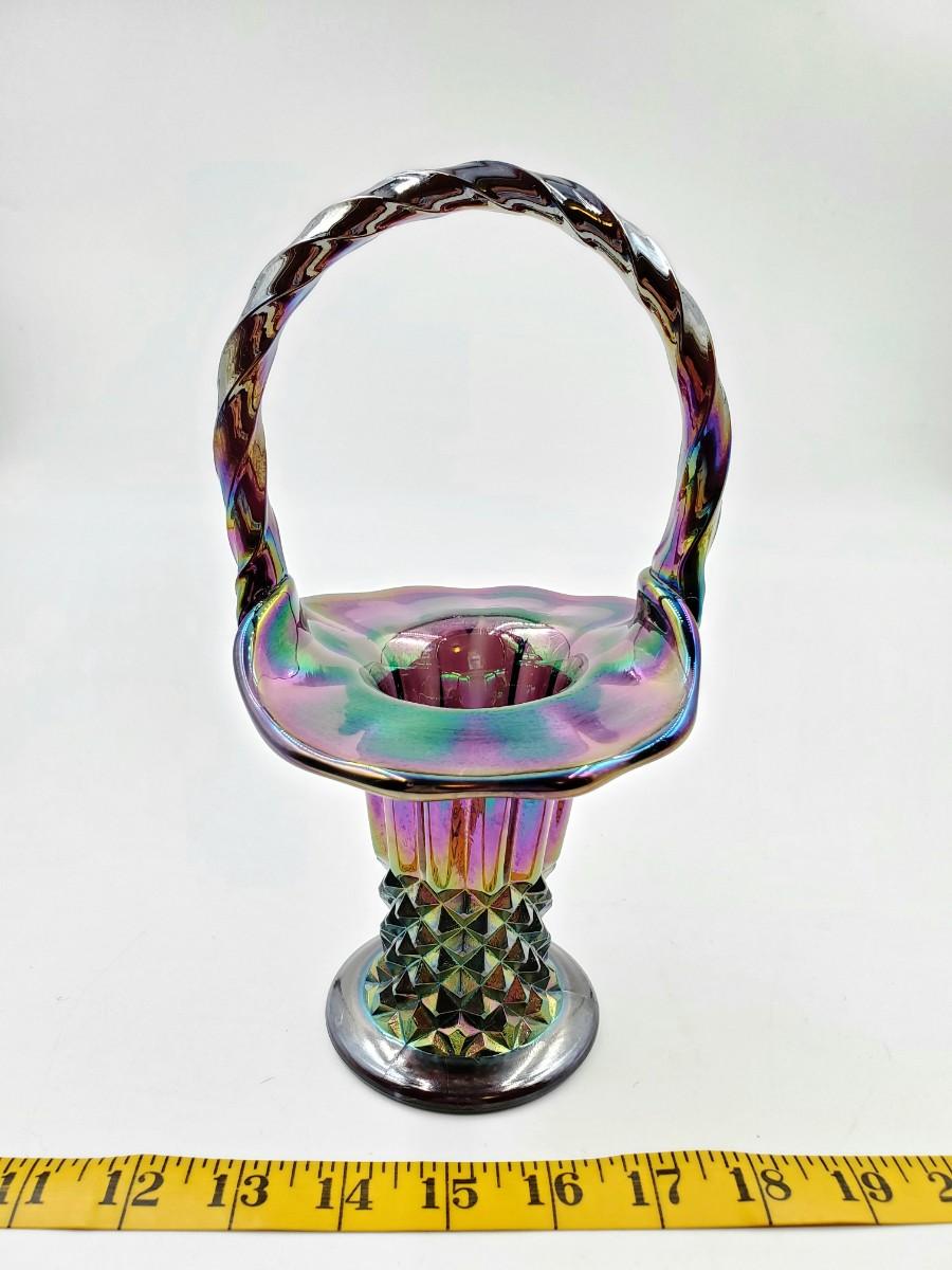 This plum iridescent/opalescent diamond paneled basket is gorgeous, marked Fenton in glass on bottom and in very good condition.