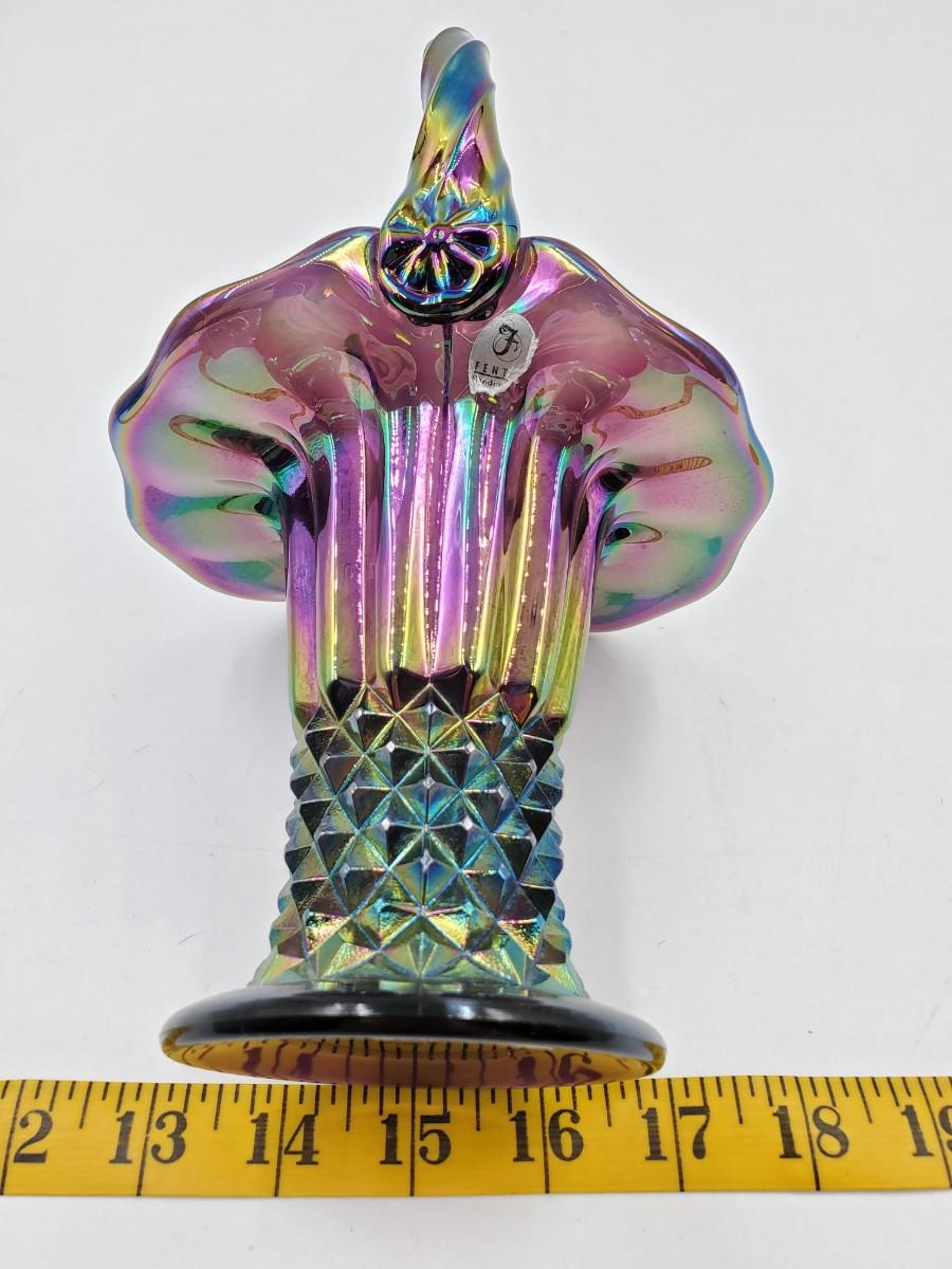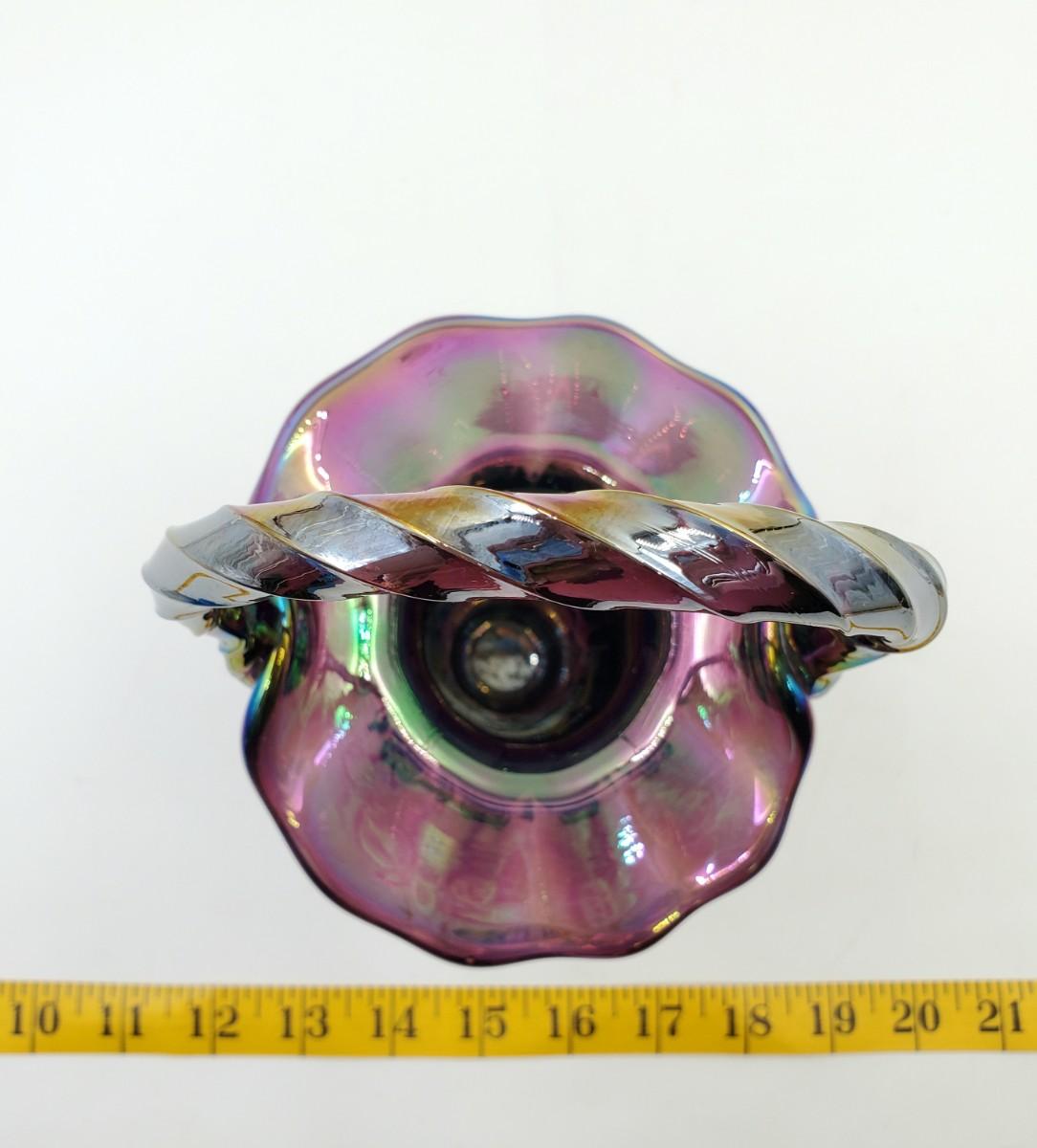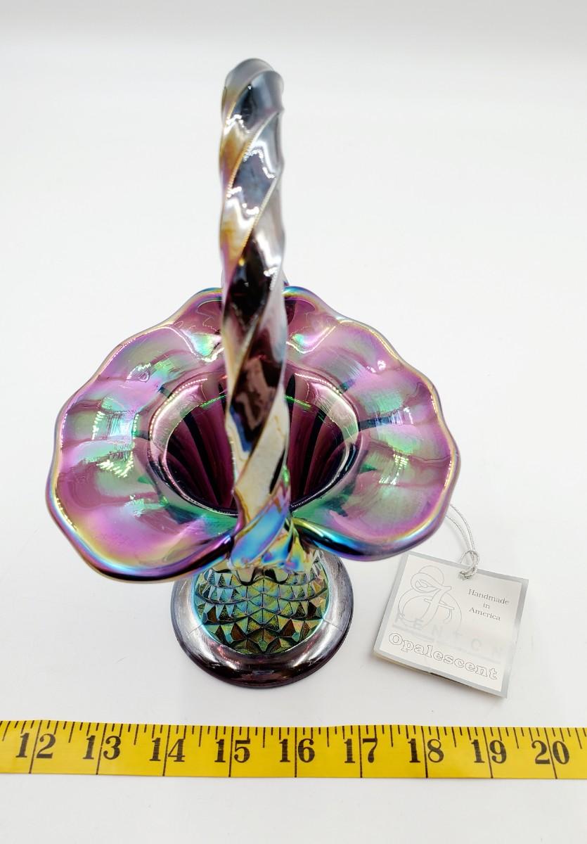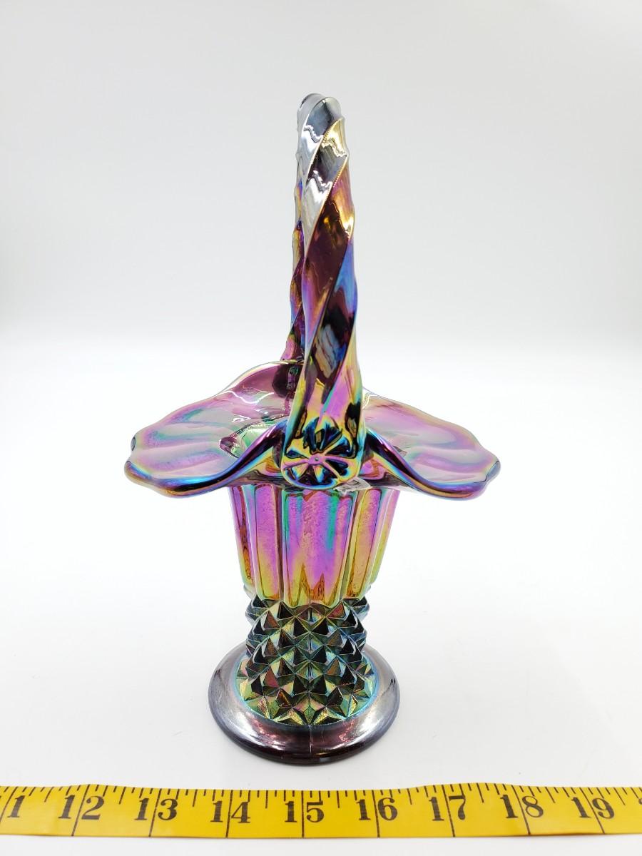 This plum iridescent/opalescent diamond paneled basket is gorgeous, marked Fenton in glass on bottom and in very good condition.